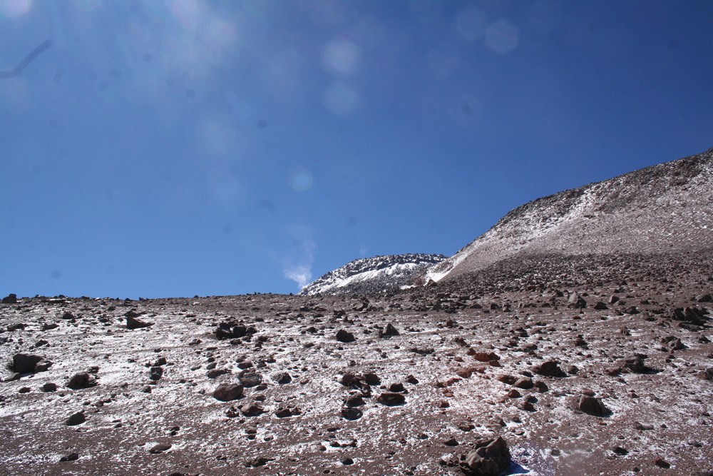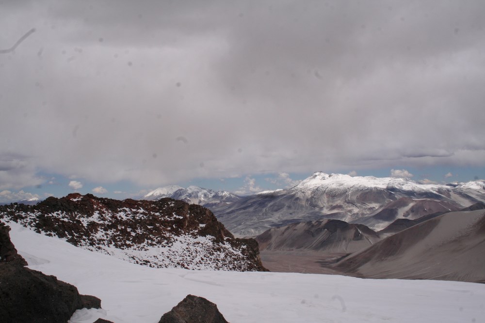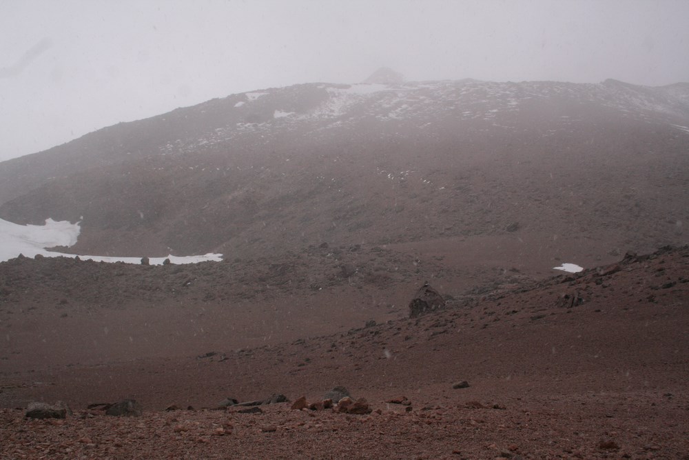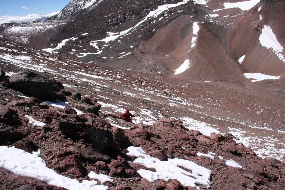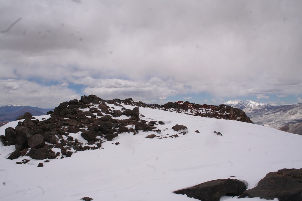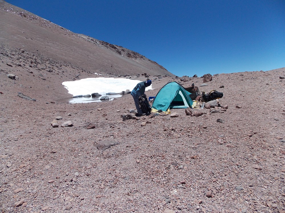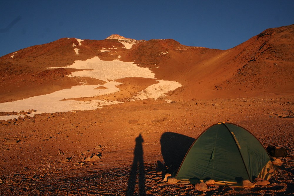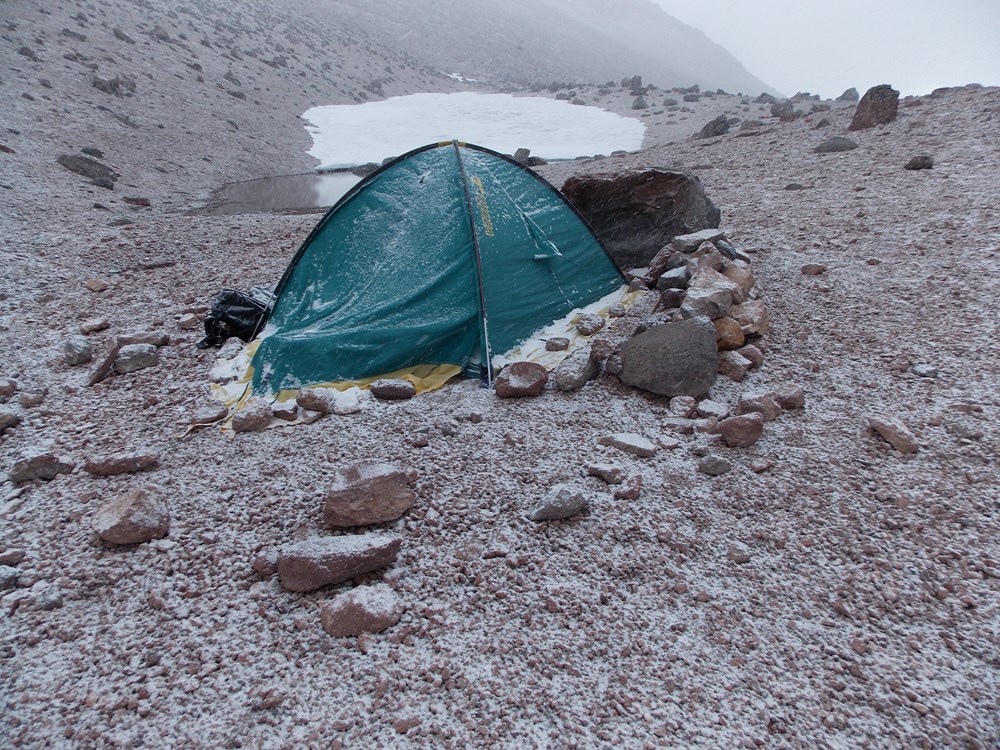 Am Aufbau angekommen sah ich ihn sofort, alles bestens! Es war ihm alles zu Lose und Glatt, Original Zitat: es ist heute nicht mein Tag! ja er wollte nicht mehr weiter, ist absolut akzeptabel. Über 5 Std. waren seit Start vergangen, der Himmel Wolkenverhangen auch vom Westen zog es sichtbar zu, es wird zu Niederschlag kommen! Jens band mir Plastiktüten über die Handschuhe, und los! wir wählten die von mir schon im Aufstieg auserkorene Route, in einem größeren Süd West Bogen, dabei möglichst die Schneefelder zum Abrutschen gewählt, auch das Lose Vulkangestein konnte gut genutzt werden, hier sah wir zum ersten Mal Spuren im Schnee, konnte ja wohl nur von den Engländern sein. Am Letzten Hang dann deutliche Spuren im Schotter und Schutt. Das Camp kam näher mit jedem Meter ging die Konzentration verloren, ja mauseplatt angekommen nur noch rein in die Bude, das Zelt bot nun besten Schutz, es war 14.45 Uhr, in 1 ½ Std vom Gipfel bis zum Lager. Etwas Trinken und ruhen im Schlafsack, während über uns das Wetter seine Kapriolen Trieb, versuchten wir zu Kräften zu gelangen und das in dieser Höhe, hahaha geht ja gar nicht. 18.00 Uhr Wassereinholen aber mehr als zu einer Suppe reichte der Appetit dann doch nicht! Am Abend war es soweit... Schneefall Sturmböen die Tag täglichen Wetterkapriolen wollten nicht enden, in der Nacht dann klarte es auf, unser Freund der Vollmond leuchtete, leider gefror das Zelt von innen… um genug Sauerstoff zu erhalten wurde es geöffnet, leider wurde es Eisig Kalt, kälter als die Tage zuvor! Die wohl letzte Nacht in dieser Höhe, die Anpassung wohl nicht ausreichend um in dieser Höhe zu neuen Kräften zu kommen. Die Überlegung allein den Südgipfel anzugehen verwerfe ich noch in der Nacht, die Route ist einfach zu unklar (Eine Tour an einem unbekannten Berg in den Anden sollte klar festgelegt sein!!) In dieser Nacht wurde es an Komfort selbst im guten Schlafsack genommen, dazu noch die Körperliche Unruhe. Auch für uns war klar, der Berg war Sieger, Normalerweise wird nicht aufgegeben! Zum Höhen Bergsteigen setzt es einen klaren und Schmerz freien Kopf voraus, das gleichbedeutend mit wenigsten etwas Ruhe und Schlaf in der Nacht ist. Am nächsten Morgen war es wohl Wolkenlos, doch schon um die Mittagszeit schlechter als die Tage zuvor.