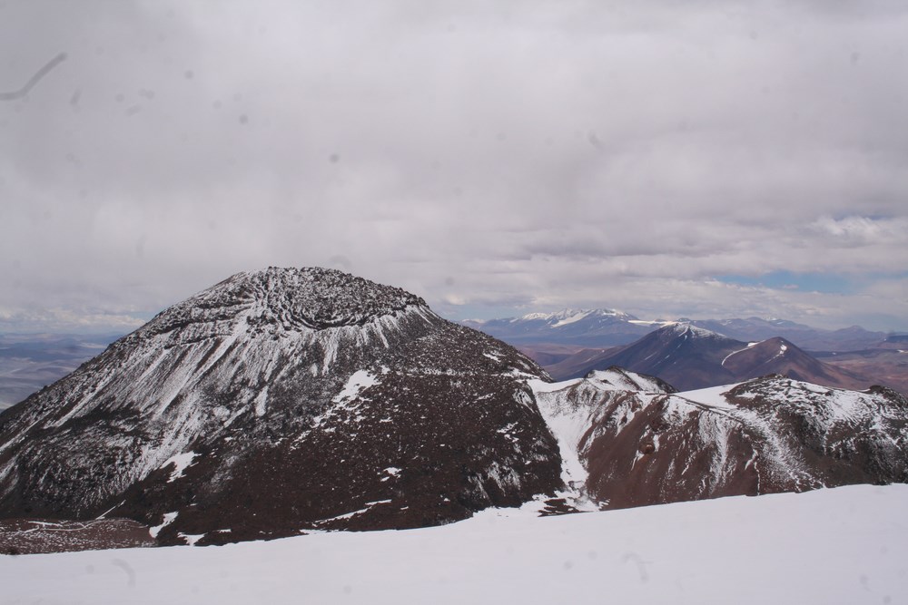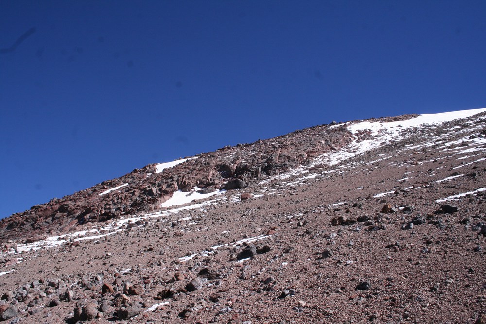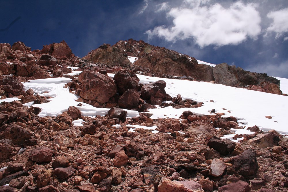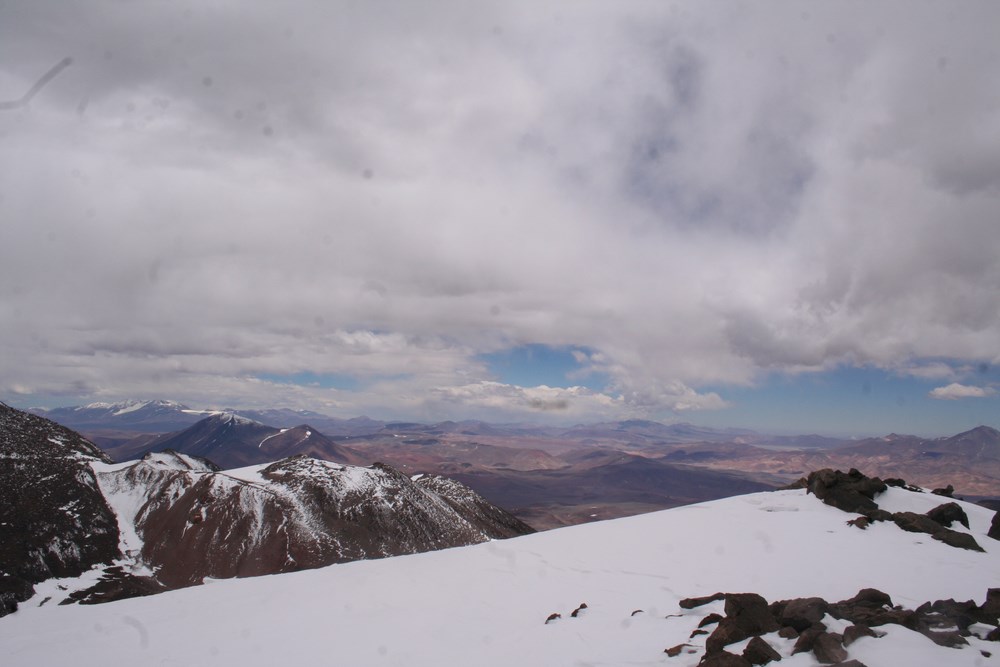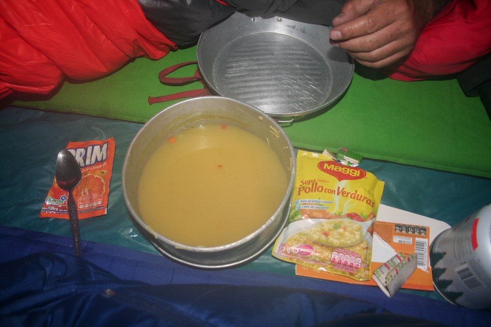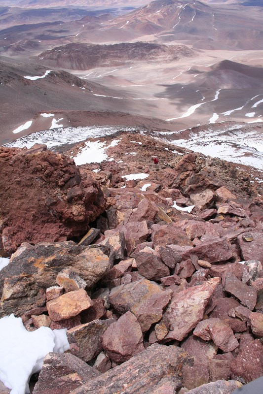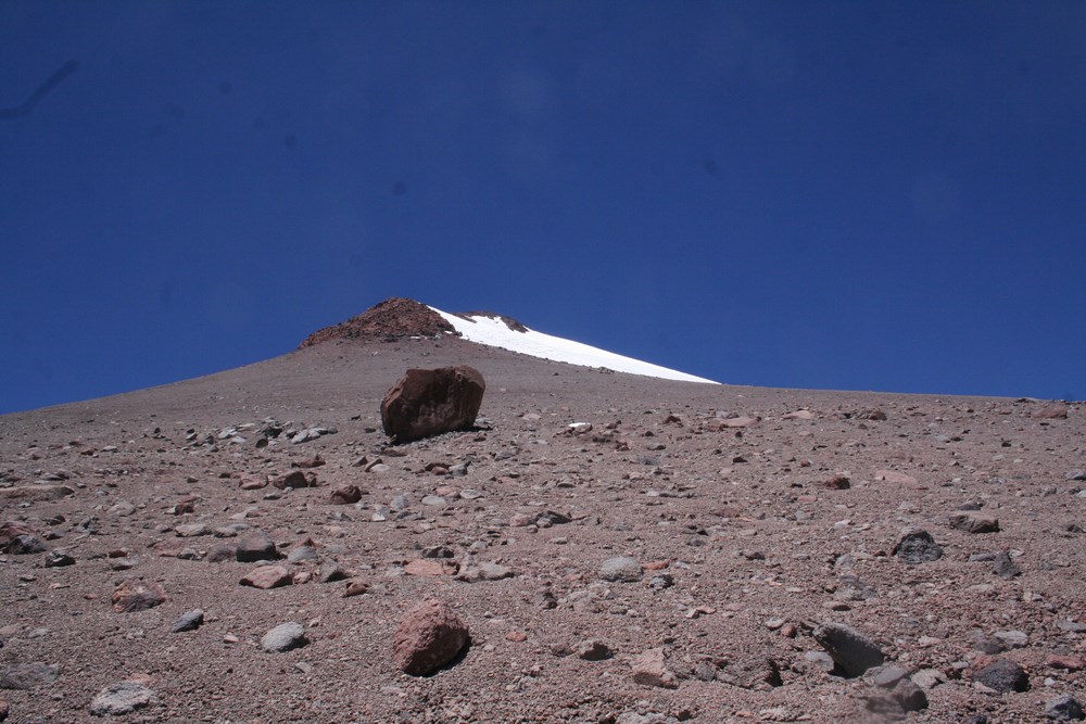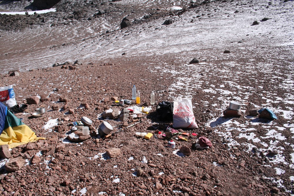 Am Aufbau angekommen sah ich ihn sofort, alles bestens! Es war ihm alles zu Lose und Glatt, Original Zitat: es ist heute nicht mein Tag! ja er wollte nicht mehr weiter, ist absolut akzeptabel. Über 5 Std. waren seit Start vergangen, der Himmel Wolkenverhangen auch vom Westen zog es sichtbar zu, es wird zu Niederschlag kommen! Jens band mir Plastiktüten über die Handschuhe, und los! wir wählten die von mir schon im Aufstieg auserkorene Route, in einem größeren Süd West Bogen, dabei möglichst die Schneefelder zum Abrutschen gewählt, auch das Lose Vulkangestein konnte gut genutzt werden, hier sah wir zum ersten Mal Spuren im Schnee, konnte ja wohl nur von den Engländern sein. Am Letzten Hang dann deutliche Spuren im Schotter und Schutt. Das Camp kam näher mit jedem Meter ging die Konzentration verloren, ja mauseplatt angekommen nur noch rein in die Bude, das Zelt bot nun besten Schutz, es war 14.45 Uhr, in 1 ½ Std vom Gipfel bis zum Lager. Etwas Trinken und ruhen im Schlafsack, während über uns das Wetter seine Kapriolen Trieb, versuchten wir zu Kräften zu gelangen und das in dieser Höhe, hahaha geht ja gar nicht. 18.00 Uhr Wassereinholen aber mehr als zu einer Suppe reichte der Appetit dann doch nicht! Am Abend war es soweit... Schneefall Sturmböen die Tag täglichen Wetterkapriolen wollten nicht enden, in der Nacht dann klarte es auf, unser Freund der Vollmond leuchtete, leider gefror das Zelt von innen… um genug Sauerstoff zu erhalten wurde es geöffnet, leider wurde es Eisig Kalt, kälter als die Tage zuvor! Die wohl letzte Nacht in dieser Höhe, die Anpassung wohl nicht ausreichend um in dieser Höhe zu neuen Kräften zu kommen. Die Überlegung allein den Südgipfel anzugehen verwerfe ich noch in der Nacht, die Route ist einfach zu unklar (Eine Tour an einem unbekannten Berg in den Anden sollte klar festgelegt sein!!) In dieser Nacht wurde es an Komfort selbst im guten Schlafsack genommen, dazu noch die Körperliche Unruhe. Auch für uns war klar, der Berg war Sieger, Normalerweise wird nicht aufgegeben! Zum Höhen Bergsteigen setzt es einen klaren und Schmerz freien Kopf voraus, das gleichbedeutend mit wenigsten etwas Ruhe und Schlaf in der Nacht ist. Am nächsten Morgen war es wohl Wolkenlos, doch schon um die Mittagszeit schlechter als die Tage zuvor.