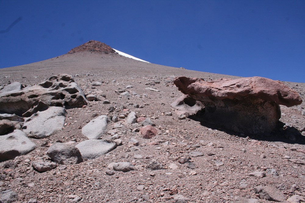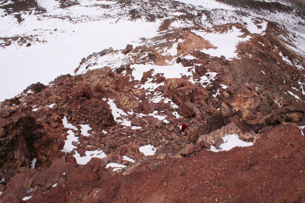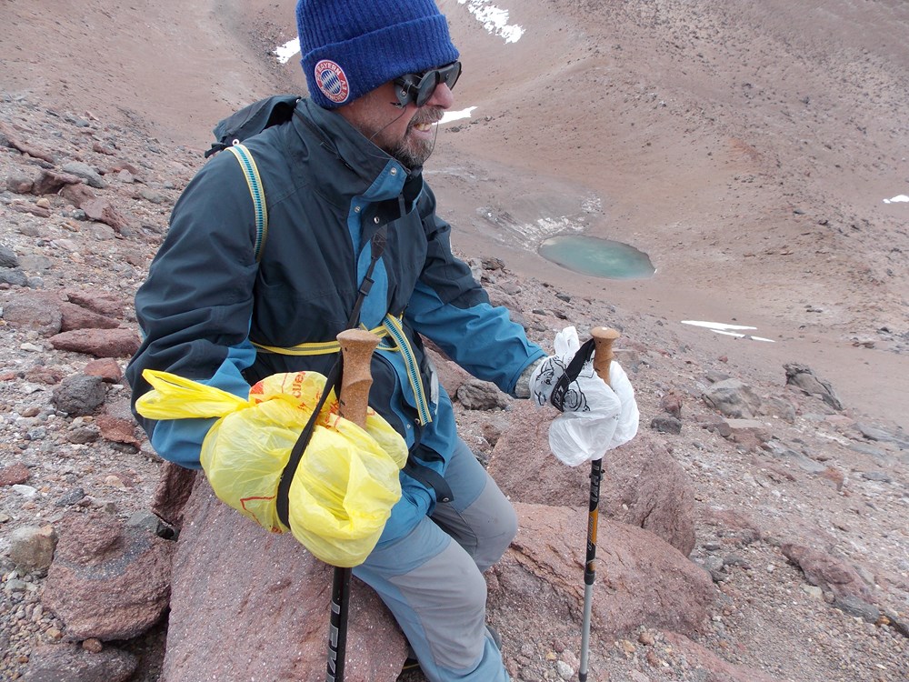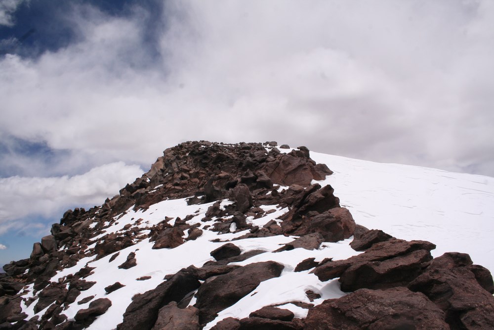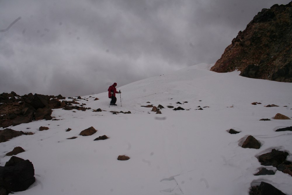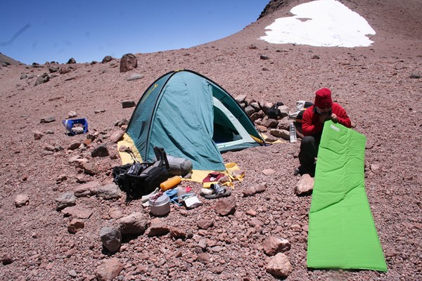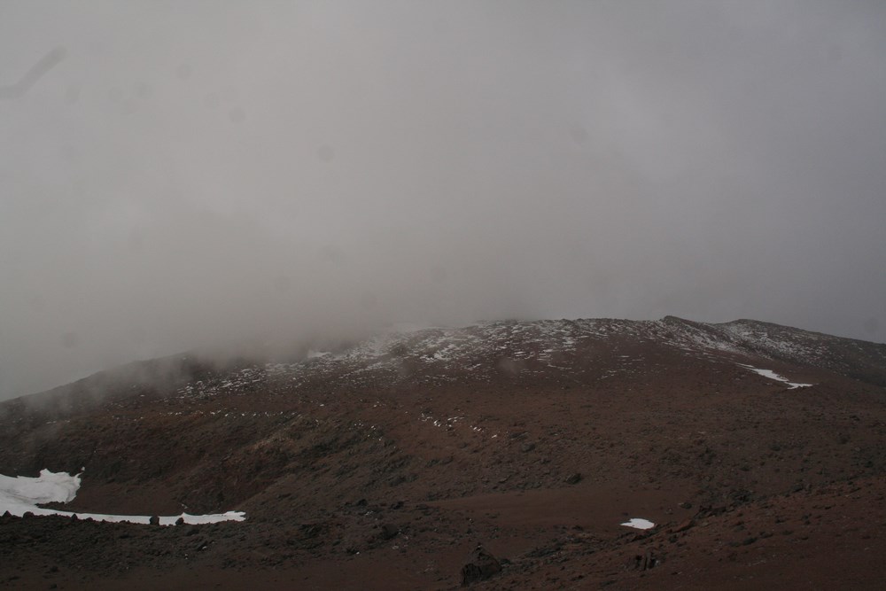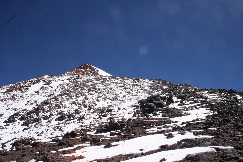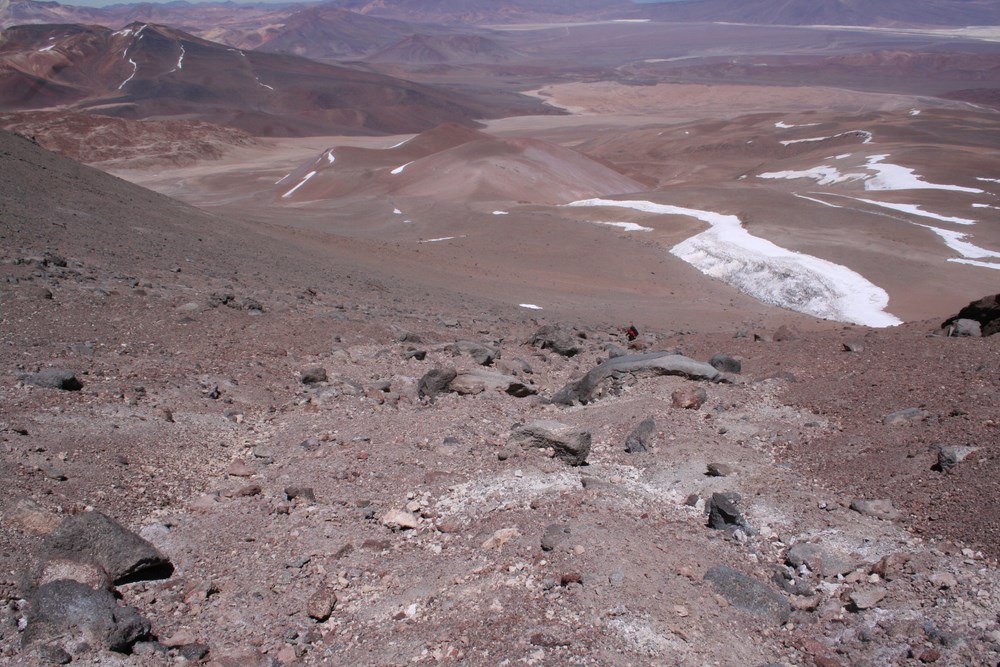 Am Aufbau angekommen sah ich ihn sofort, alles bestens! Es war ihm alles zu Lose und Glatt, Original Zitat: es ist heute nicht mein Tag! ja er wollte nicht mehr weiter, ist absolut akzeptabel. Über 5 Std. waren seit Start vergangen, der Himmel Wolkenverhangen auch vom Westen zog es sichtbar zu, es wird zu Niederschlag kommen! Jens band mir Plastiktüten über die Handschuhe, und los! wir wählten die von mir schon im Aufstieg auserkorene Route, in einem größeren Süd West Bogen, dabei möglichst die Schneefelder zum Abrutschen gewählt, auch das Lose Vulkangestein konnte gut genutzt werden, hier sah wir zum ersten Mal Spuren im Schnee, konnte ja wohl nur von den Engländern sein. Am Letzten Hang dann deutliche Spuren im Schotter und Schutt. Das Camp kam näher mit jedem Meter ging die Konzentration verloren, ja mauseplatt angekommen nur noch rein in die Bude, das Zelt bot nun besten Schutz, es war 14.45 Uhr, in 1 ½ Std vom Gipfel bis zum Lager. Etwas Trinken und ruhen im Schlafsack, während über uns das Wetter seine Kapriolen Trieb, versuchten wir zu Kräften zu gelangen und das in dieser Höhe, hahaha geht ja gar nicht. 18.00 Uhr Wassereinholen aber mehr als zu einer Suppe reichte der Appetit dann doch nicht! Am Abend war es soweit... Schneefall Sturmböen die Tag täglichen Wetterkapriolen wollten nicht enden, in der Nacht dann klarte es auf, unser Freund der Vollmond leuchtete, leider gefror das Zelt von innen… um genug Sauerstoff zu erhalten wurde es geöffnet, leider wurde es Eisig Kalt, kälter als die Tage zuvor! Die wohl letzte Nacht in dieser Höhe, die Anpassung wohl nicht ausreichend um in dieser Höhe zu neuen Kräften zu kommen. Die Überlegung allein den Südgipfel anzugehen verwerfe ich noch in der Nacht, die Route ist einfach zu unklar (Eine Tour an einem unbekannten Berg in den Anden sollte klar festgelegt sein!!) In dieser Nacht wurde es an Komfort selbst im guten Schlafsack genommen, dazu noch die Körperliche Unruhe. Auch für uns war klar, der Berg war Sieger, Normalerweise wird nicht aufgegeben! Zum Höhen Bergsteigen setzt es einen klaren und Schmerz freien Kopf voraus, das gleichbedeutend mit wenigsten etwas Ruhe und Schlaf in der Nacht ist. Am nächsten Morgen war es wohl Wolkenlos, doch schon um die Mittagszeit schlechter als die Tage zuvor.