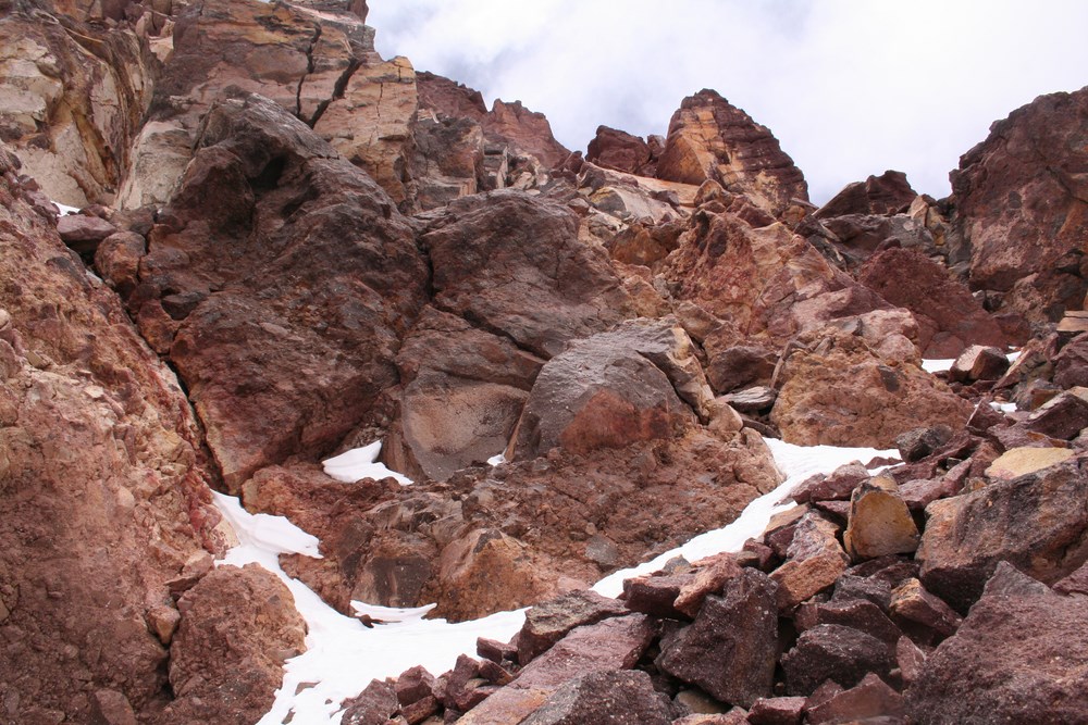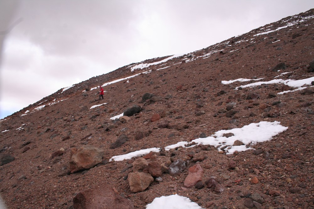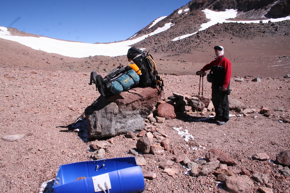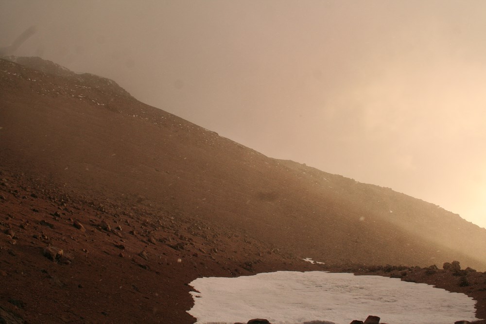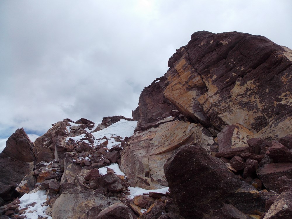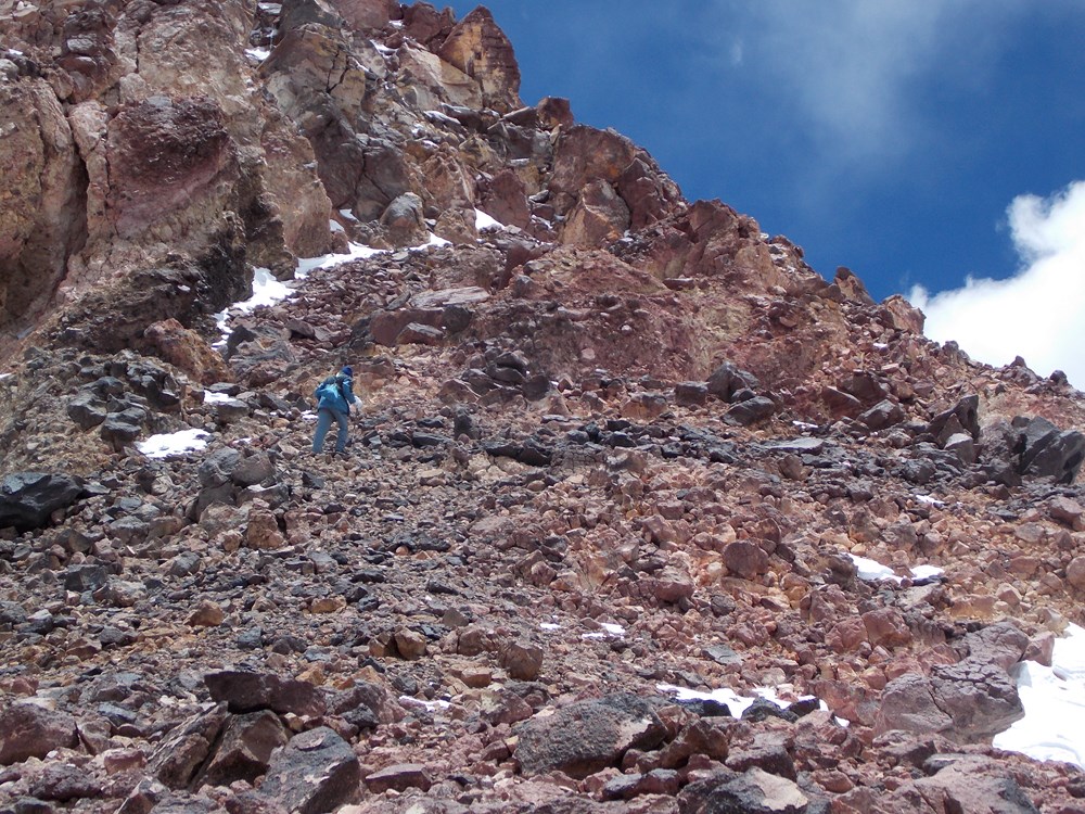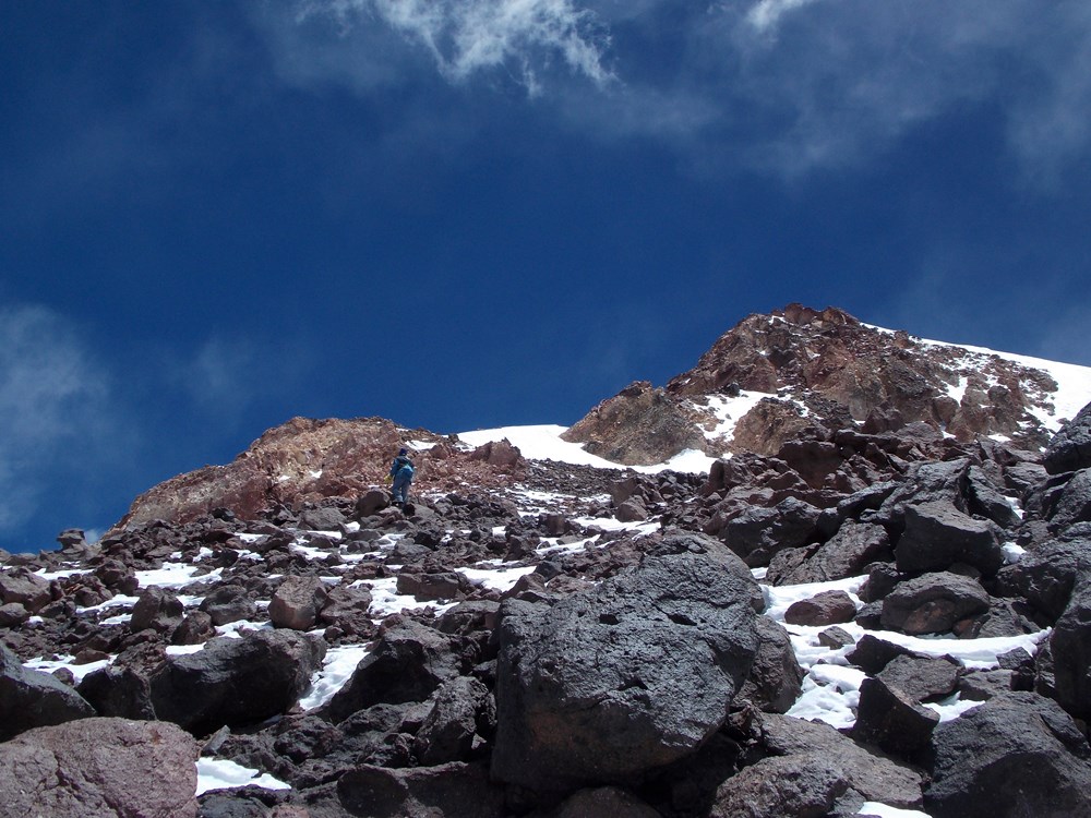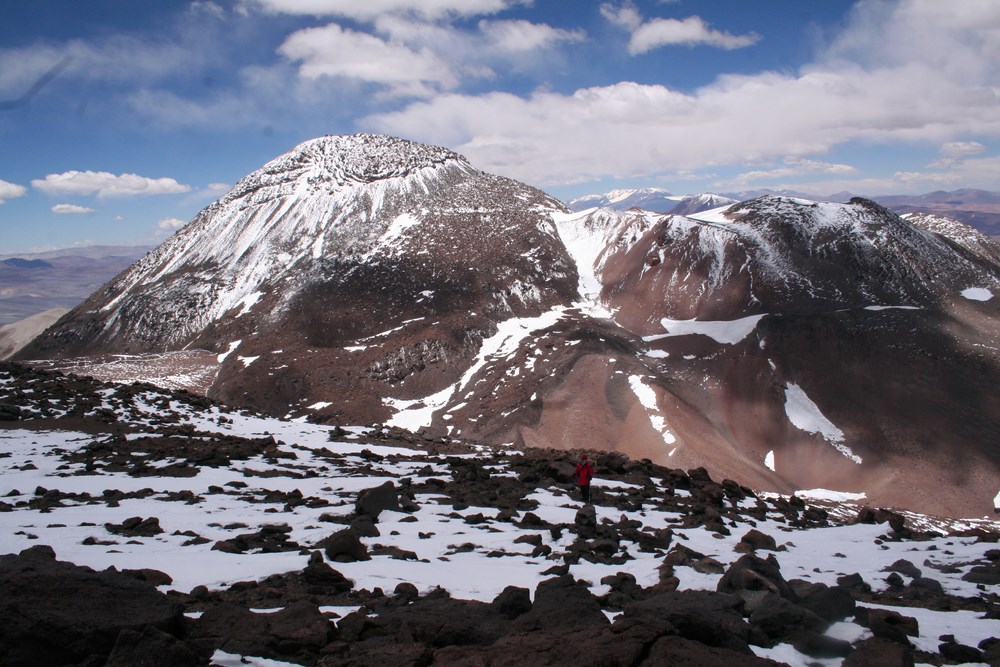 Am Aufbau angekommen sah ich ihn sofort, alles bestens! Es war ihm alles zu Lose und Glatt, Original Zitat: es ist heute nicht mein Tag! ja er wollte nicht mehr weiter, ist absolut akzeptabel. Über 5 Std. waren seit Start vergangen, der Himmel Wolkenverhangen auch vom Westen zog es sichtbar zu, es wird zu Niederschlag kommen! Jens band mir Plastiktüten über die Handschuhe, und los! wir wählten die von mir schon im Aufstieg auserkorene Route, in einem größeren Süd West Bogen, dabei möglichst die Schneefelder zum Abrutschen gewählt, auch das Lose Vulkangestein konnte gut genutzt werden, hier sah wir zum ersten Mal Spuren im Schnee, konnte ja wohl nur von den Engländern sein. Am Letzten Hang dann deutliche Spuren im Schotter und Schutt. Das Camp kam näher mit jedem Meter ging die Konzentration verloren, ja mauseplatt angekommen nur noch rein in die Bude, das Zelt bot nun besten Schutz, es war 14.45 Uhr, in 1 ½ Std vom Gipfel bis zum Lager. Etwas Trinken und ruhen im Schlafsack, während über uns das Wetter seine Kapriolen Trieb, versuchten wir zu Kräften zu gelangen und das in dieser Höhe, hahaha geht ja gar nicht. 18.00 Uhr Wassereinholen aber mehr als zu einer Suppe reichte der Appetit dann doch nicht! Am Abend war es soweit... Schneefall Sturmböen die Tag täglichen Wetterkapriolen wollten nicht enden, in der Nacht dann klarte es auf, unser Freund der Vollmond leuchtete, leider gefror das Zelt von innen… um genug Sauerstoff zu erhalten wurde es geöffnet, leider wurde es Eisig Kalt, kälter als die Tage zuvor! Die wohl letzte Nacht in dieser Höhe, die Anpassung wohl nicht ausreichend um in dieser Höhe zu neuen Kräften zu kommen. Die Überlegung allein den Südgipfel anzugehen verwerfe ich noch in der Nacht, die Route ist einfach zu unklar (Eine Tour an einem unbekannten Berg in den Anden sollte klar festgelegt sein!!) In dieser Nacht wurde es an Komfort selbst im guten Schlafsack genommen, dazu noch die Körperliche Unruhe. Auch für uns war klar, der Berg war Sieger, Normalerweise wird nicht aufgegeben! Zum Höhen Bergsteigen setzt es einen klaren und Schmerz freien Kopf voraus, das gleichbedeutend mit wenigsten etwas Ruhe und Schlaf in der Nacht ist. Am nächsten Morgen war es wohl Wolkenlos, doch schon um die Mittagszeit schlechter als die Tage zuvor.