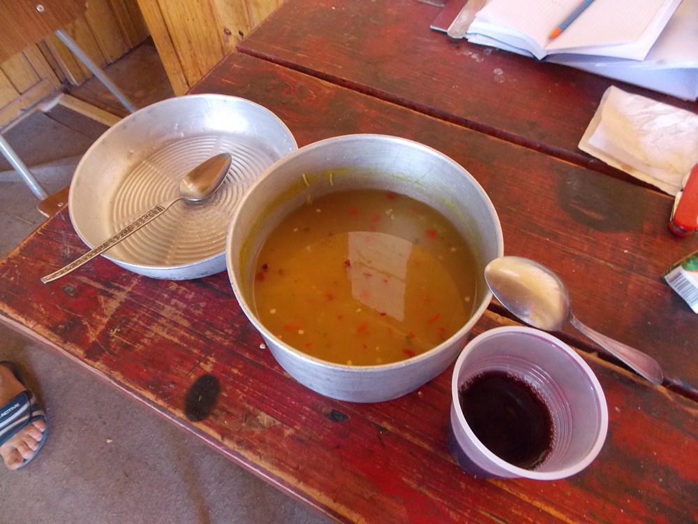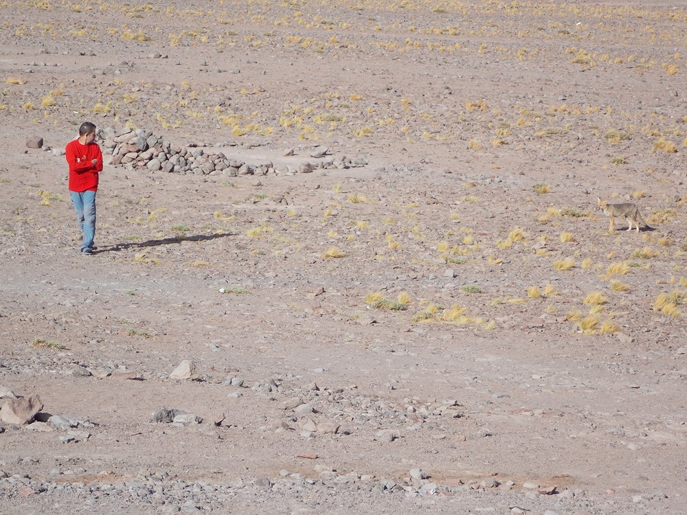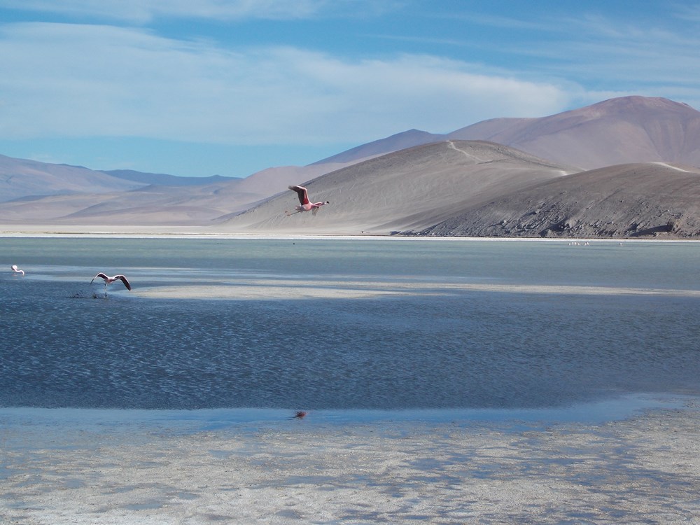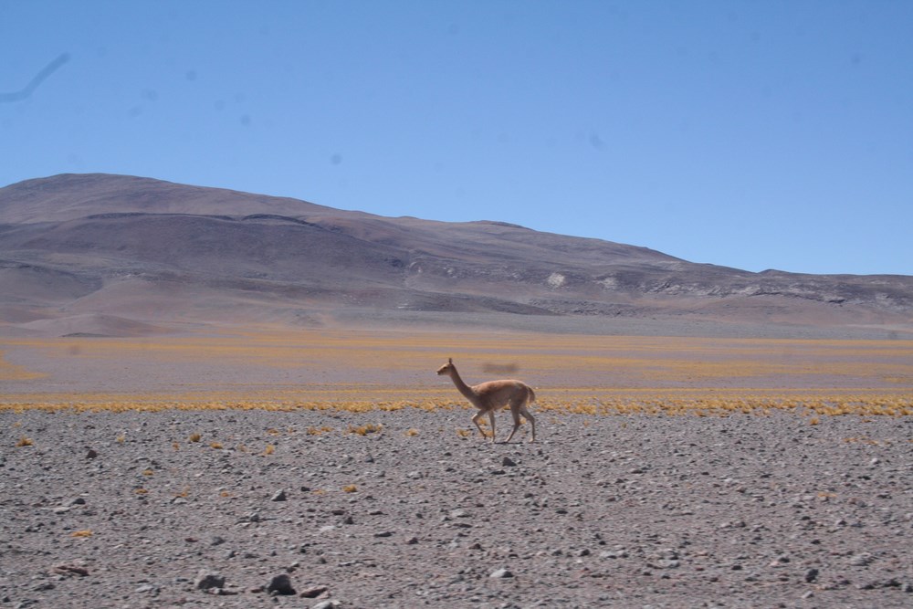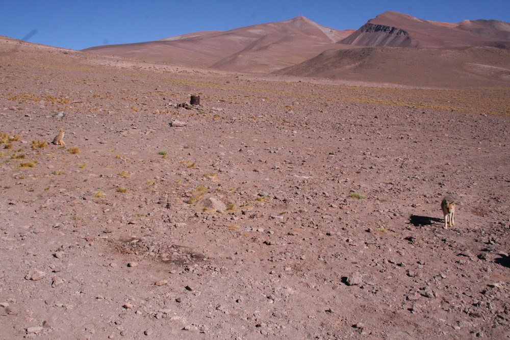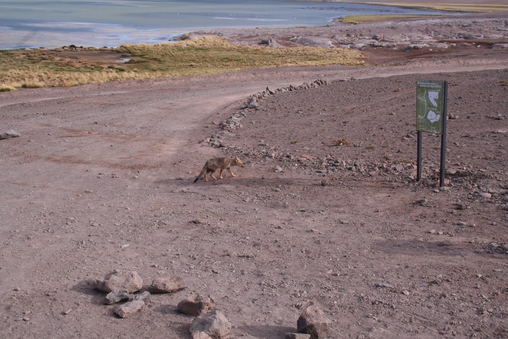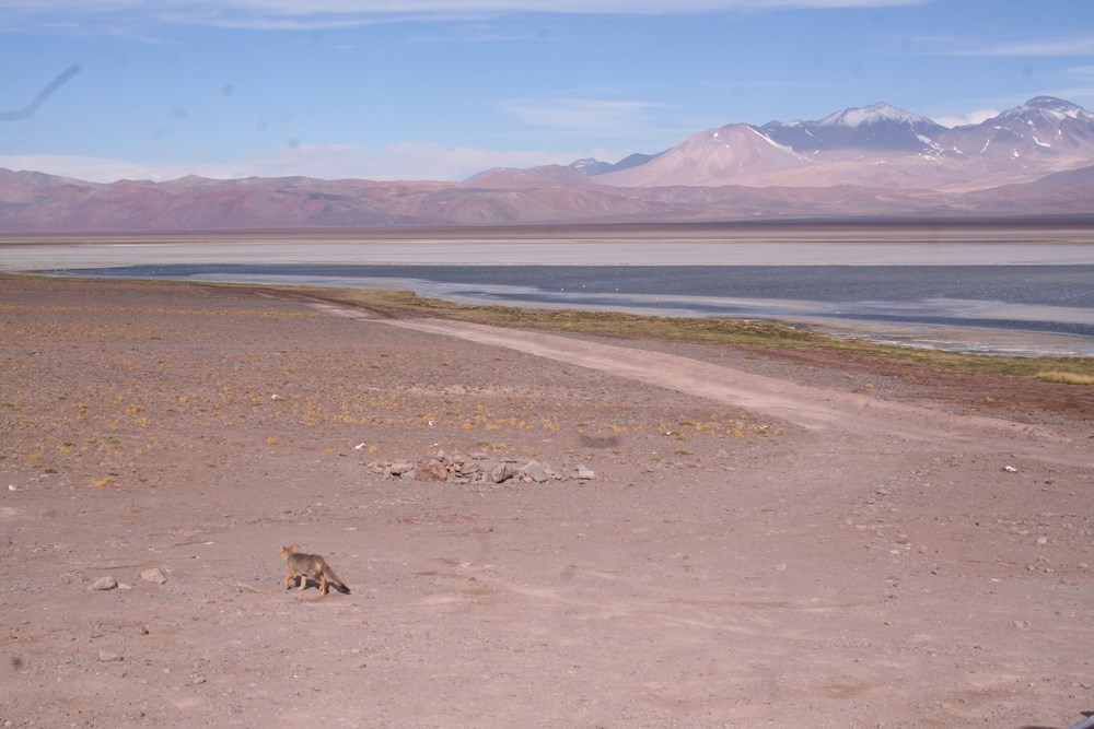 Ab hier übernimmt Jens das Steuer, gegen 15.00 Uhr, ist der National Park Tres Cruces erreicht, das Obligatorische Bild mit dem Hinweisschild „Tres Cruces Nationalpark „von hier ist die Größe des Salzsee gar nicht auszumachen. 15.20 Uhr, das einfache Rifugio der Conaf ist erreicht, es scheint absolut verwaist zu sein, prima kein Gedränge, Das Hüttenbuch deutet darauf hin das in den letzten Wochen wenig Gäste hier weilten. Die Kanister und Lebensmittel Verpackungen sind mächtig aufgeblasen kein Wunder liegen über 3000 m Höhe zwischen hier und Copiapo, die Lebensmittel werden auf einem Tisch im Vorraum (Küche Aufenthalt) ca. 6 qm Deponiert und Fotografiert. Zwei Fahrzeugen halten kurz vor der Hütte, wollten aber nur ein Info. Im hinteren Bereich befinden sich zwei etwas Größere Räume die mit Matratzen ausstaffiert sind, der Kalte Wind dringt durch alle Ritzen nicht ganz falsch braucht doch der Körper hier mehr Luft wegen des doch Dünen Sauerstoffs. Zur Feier des Tages wird der Wein ein Santa Helena angezapft, die Päckchen Suppe wird mit einem Brühwürfel und etwas Suppennudeln versehen, es wurde eine wohlschmeckende Delikatesse. Es ist 18.30 Uhr ein Wüstenfuchs nähert sich, auf der Suche nach Nahrung kennt dieser wohl wenig Scheu. Der Erste Kanister wird angesaugt ganz schön übel erst im dritten Anlauf läuft der Treibstoff, weit über eine Stunde später sitzt der Geschmack noch im Gaumen und wohl auch noch tiefer. Bis auf 40 m ist ein Herantasten an die scheuen Flamingos möglich, dann trennt uns das Salar, Jens gelingt ein Top Schnappschuss. Gulasch wird vorbereitet der Salat gerichtet zuerst das Gulasch gekocht dann die Nudeln um am Schluss noch einmal die Soße aufzukochen, während des Kochens geht die Sonne am Berg unter, es wird schnell Dunkel, die kleinen Fenster geben kaum Licht, zum Abendessen reichte es gerade so. Zum Abschluss gibt es noch ein Becker Dosenbier. 22.00 Uhr, ist Nachtruhe angesagt, Es ist wohl etwas Kühl geworden doch im neuen Schlafsack schläft es sich ganz gut.