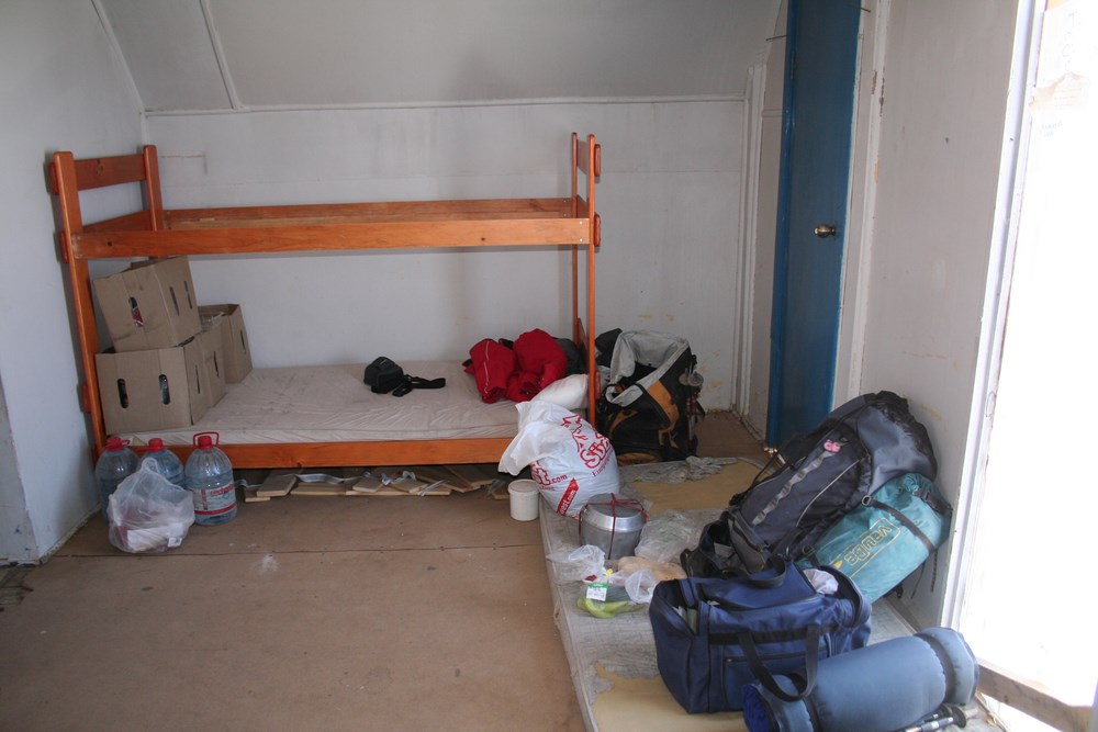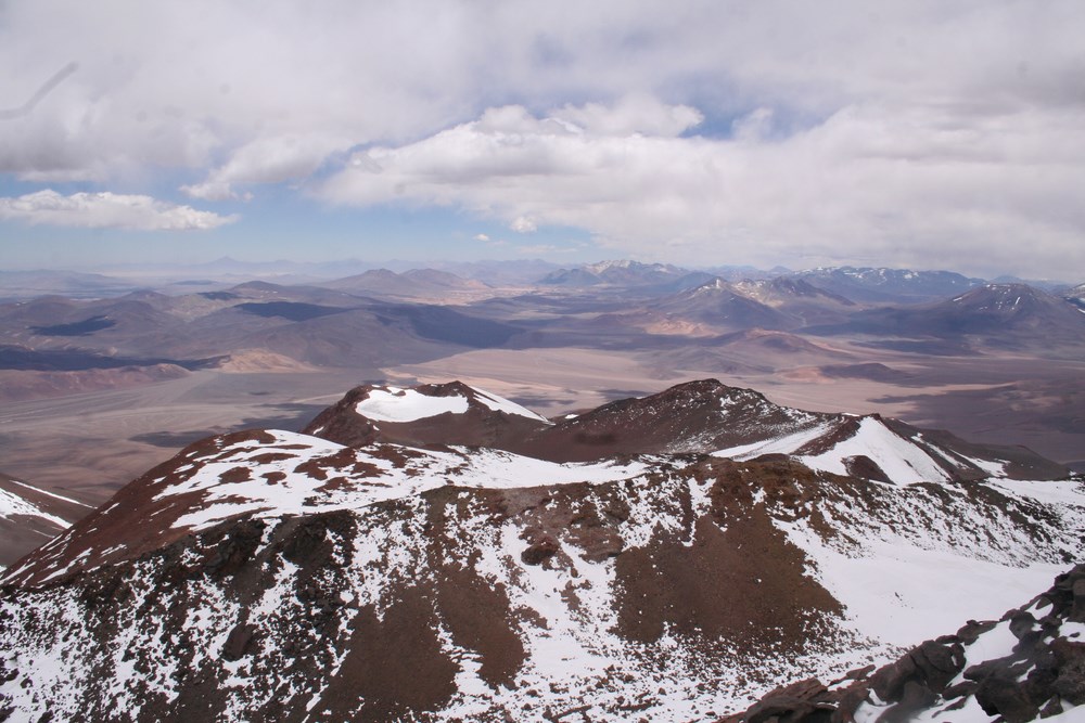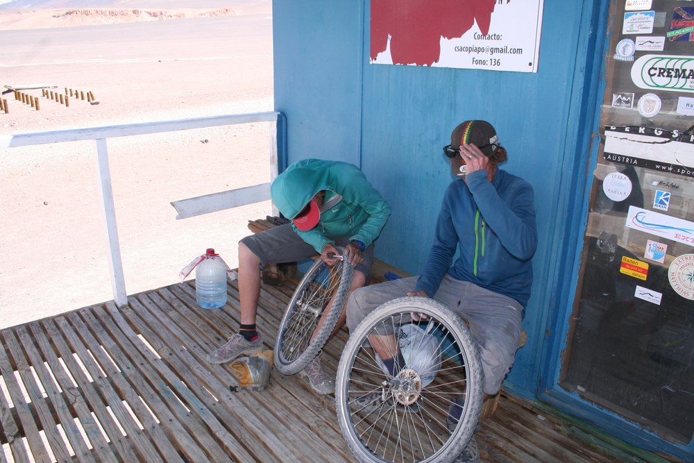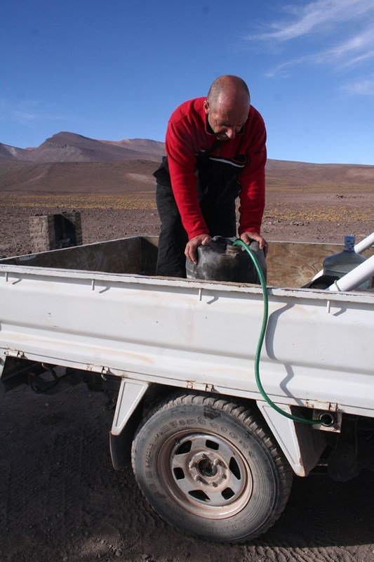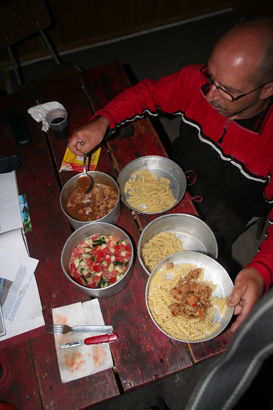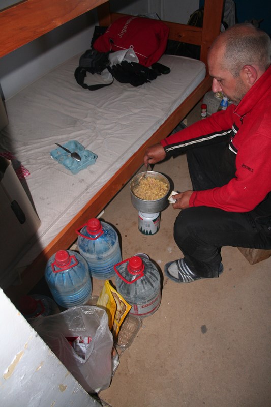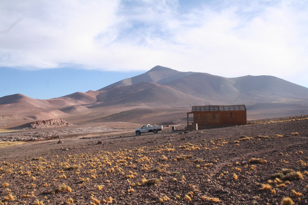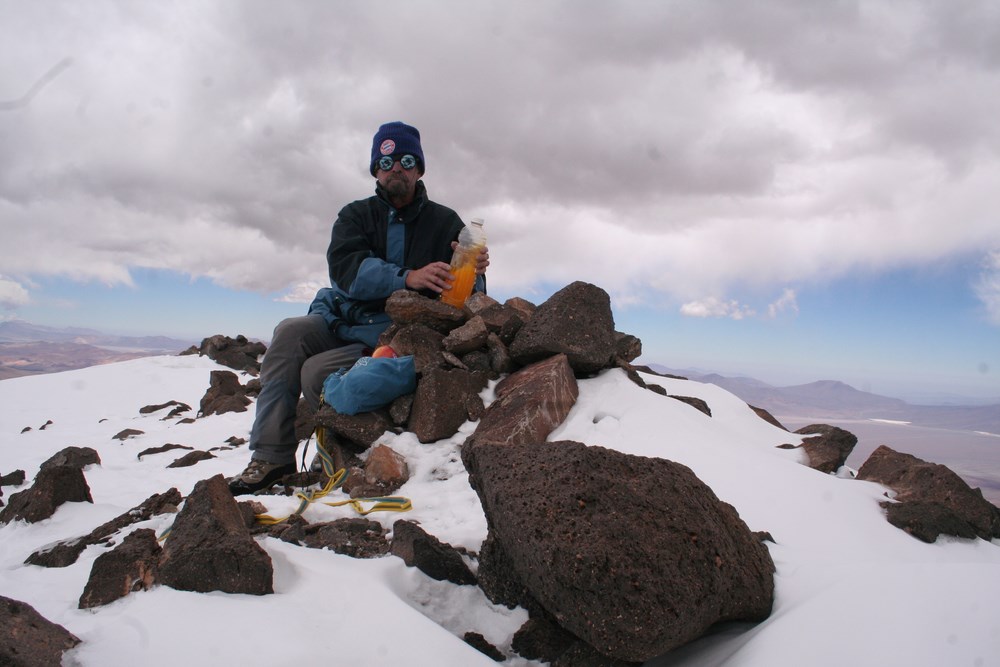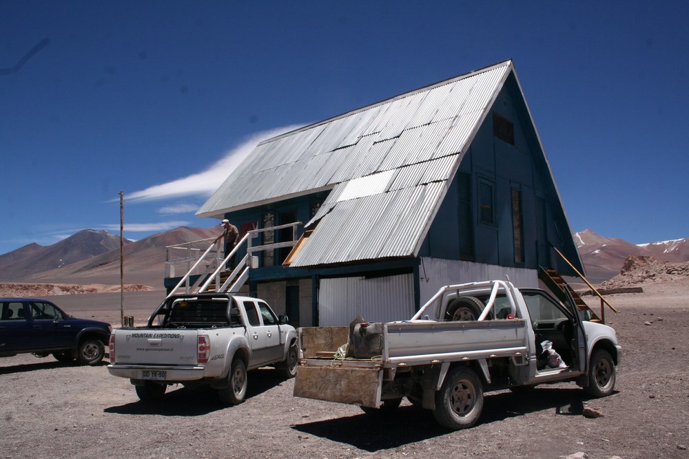 Etwas kompliziert ist die Zufahrt zum Rifugio Claudio Lucero, wurde doch glatt die Abzweigung verschüttet, doch mit dem Wissen der Zufahrt sollte es gelingen. 13.30 Uhr, schon von weitem waren etliche Fahrzeuge auszumachen, tatsächlich befanden sich sehr viele Bergsteiger in und um der Hütte, wie selbstverständlich nisteten wir uns in einem großen hellen Raum ein, Matratzen standen an der Wand, die nicht unbedingt in gutem Zustand waren, aber besser als in einem engen Zelt auf dieser Enormen Höhe von 4530 m. Im Austausch mit einem Deutschen wird klar das die Bedingungen hier in der Atacama die letzten Woche nicht gut war, absolut Glaubhaft! lag ja am Ojos sehr viel Schnee, er erzählte das ein Bergkamerad denn er hier kennen lernte am 1. Januar am Ojos erfolgreich war, teilweise Hüfttief im Schnee aufsteigend. Er selber hatte Probleme mit dem Rücken verweilt aber noch hier, der Kumpel sei heute Solo zum San Franzisco aufgebrochen (ein 6000er um die Ecke) direkt über dem gleichnamigen Pass, 2008 stand er auch bei uns zur Auswahl. Zwei ja die Zwei Fahrradfahrer rollen ein, es handelt sich um ein Englische Paar das seit Oktober in Südamerika Unterwegs ist, ihr Start war in Bolivien, Sie sehen sehr gezeichnet von diesem Urlaub aus, Dürr und zäh, später erfahre ich das sie Gestern am Tres Cruces waren, beide Gipfel sind gelungen Respekt! Sehr viel Schnee am Berg der Aufstieg zum Sur sei mit Felsen durchzogen und nicht einfach, Wasser ist vorhanden und die Aufgabe lösbar! Am Abend erhalten wir Tipps. Noch einmal wird der Sprit aus dem Kanister mittels Saugheber in den Tank gespült, dieses Mal klappt es besser schon beim ersten Versuch, doch ein bitterer Nachgeschmack bleibt. 270 Km ist die Distanz von Copiapo über die Laguna Santa Rosa, der Tank ist nun wieder voll. Die Höhe macht kaum Probleme, kochen einer Nudelsuppe, während des Essens schaut die Grenz Polizei einige Minuten vorbei. Zum Abendessen werden Schinkennudeln mit Tomaten und Gurkensalat serviert, wobei die Nudeln auf dieser Höhe wenig bis keinen Biss verzeichnen, zum Trinken wird ein Becker serviert. Am Abend trifft eine ältere Amerikanerin mit ihrem Argentinischen Führer ein, beide sind wohl nicht unbekannt, über was sie sich Unterhalten konnte nicht vernommen werden, war für uns "später" hinzugestoßenen kein Platz in der „Wohnküche“