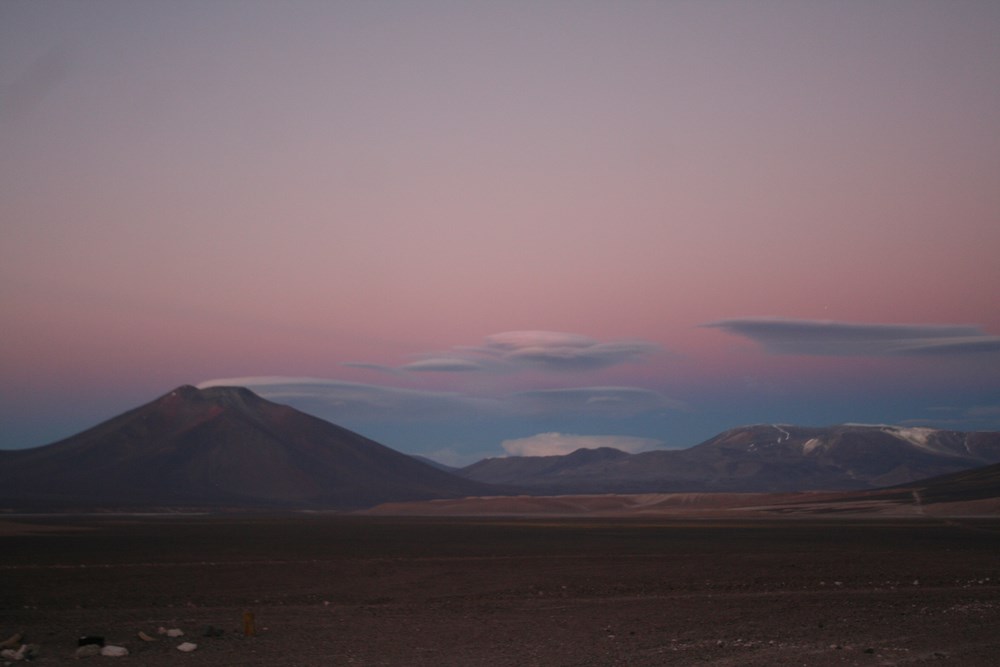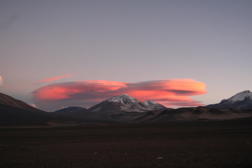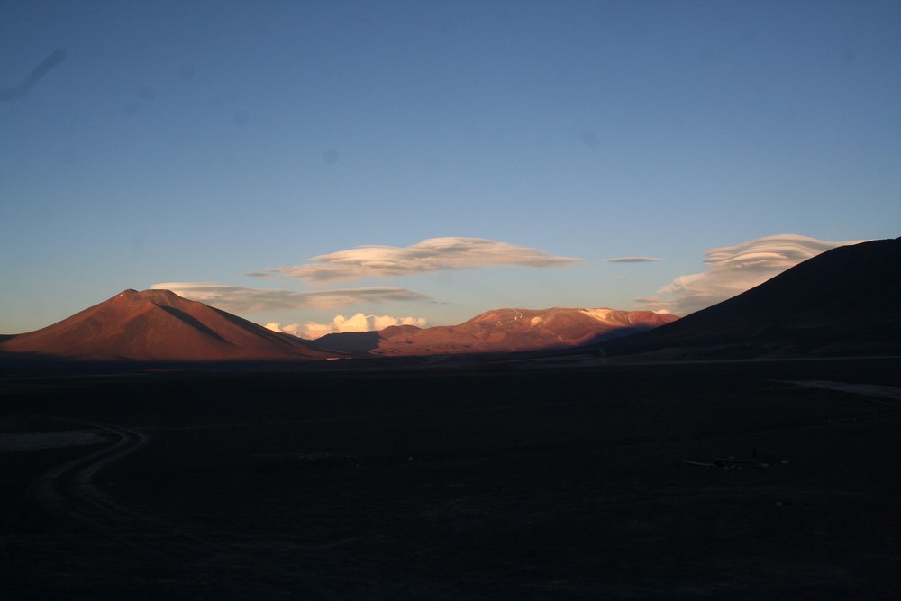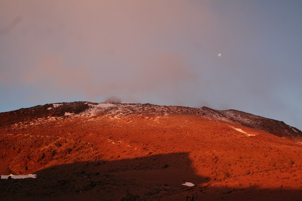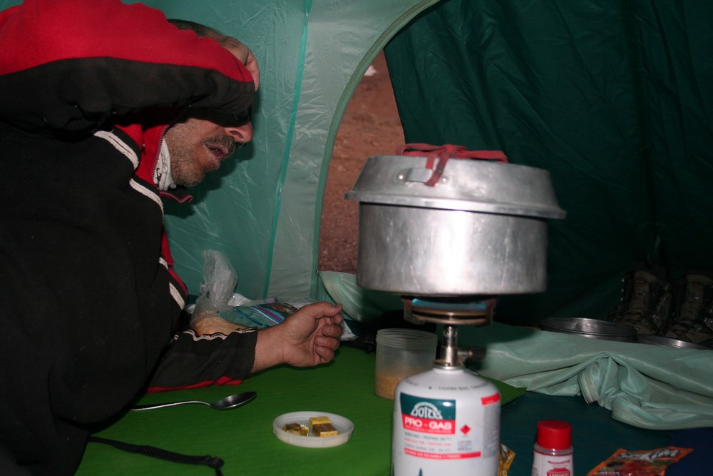 zum kühlen des Kopfes wird ein befeuchteter Leinen Beutel auf das Haupt gelegt. An eine Gipfelbesteigung ist daher nicht mehr zu denken. Beim Relaxen geht so allerhand durch den Kopf, doch Sinniges oder einen Sinnvollen Satz gelingt uns nicht, mehr als ein kurzes einnicken ist nicht möglich, ein ½ Wecken etwas Wurst und Käse auch der Appetit geht verloren. Am Nachmittag holen wir Trinkwasser ein, die Plastik Flaschen werden alle gefüllt, ein jeder nahm an diesem Tag 2 ½ Liter Wasser mit Sprim schmackhaft gemacht auf. Gegen 19.00 Uhr, wird ein gut schmeckender Travellerlunch „Jägertopf“ als wichtige Nahrung aufgenommen, davor die Obligatorische Suppe. Ein seltsames Geräusch… Graupel fällt auf die Außenhaut, der wenig Niederschlag bleibt aber nicht am Boden liegen er schmilzt sofort auf dem noch Warmen Untergrund, schön anzusehen der Sonnenuntergang der den Gipfel des Tres Cruces Central in herrlichen warm wirkenden Pastellfarben leuchten lässt. Die Kleidung wird für den nächsten Tag vorbereitet, die Trinkflaschen werden darin zum Schutz vor der Eisigen Nacht eingewickelt. Es sollte die Nacht der Qualen werden, der Himmel klarte auf es wurde Sternenklar, dadurch präsentierte sich die Atacama schlechthin als die Sternwarte unseres Planeten! Doch inmitten dieser Nacht toppte ein Sturm