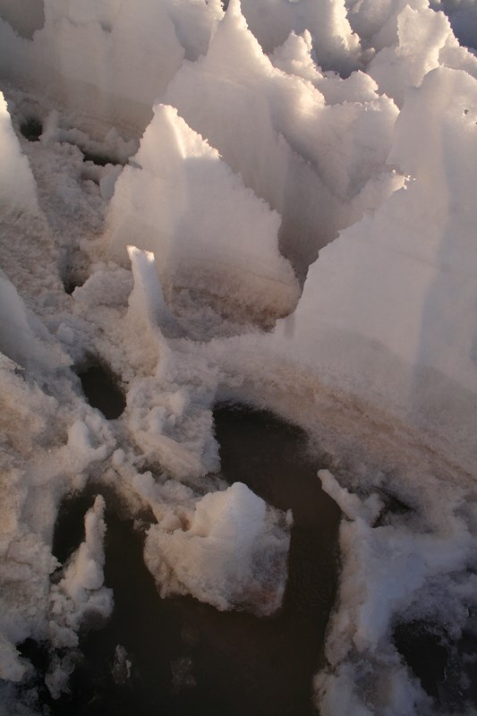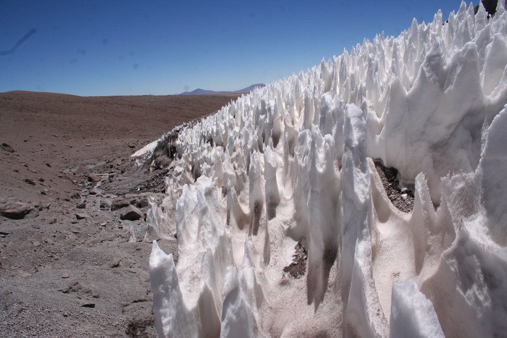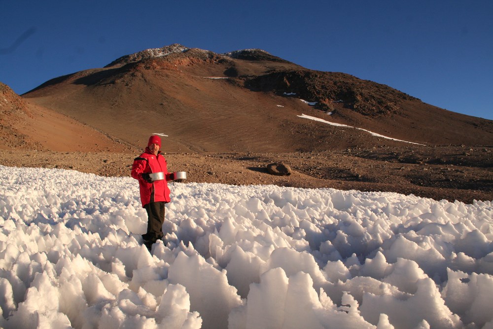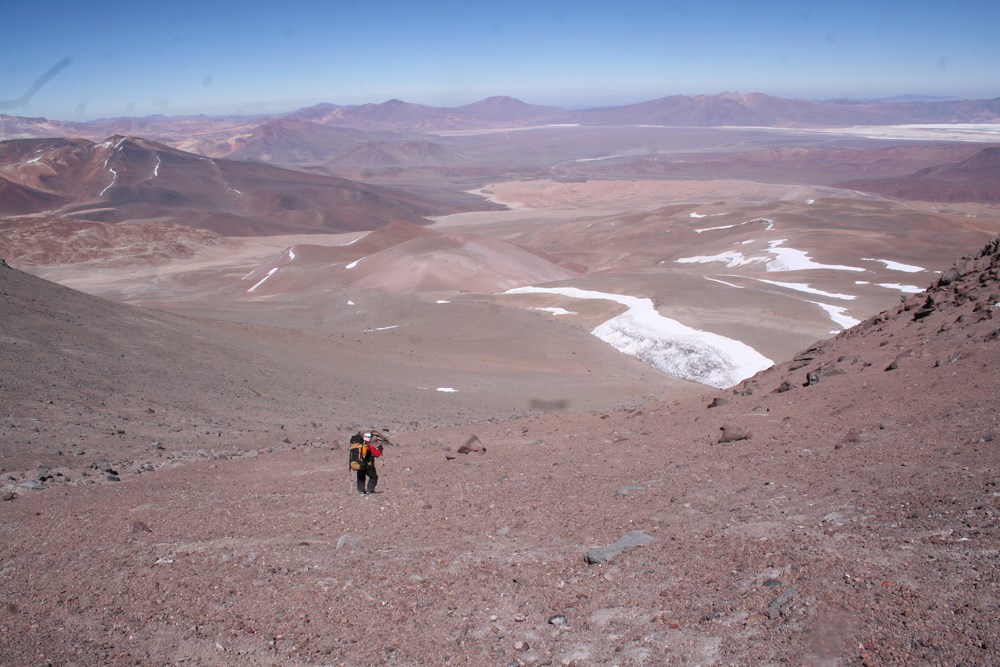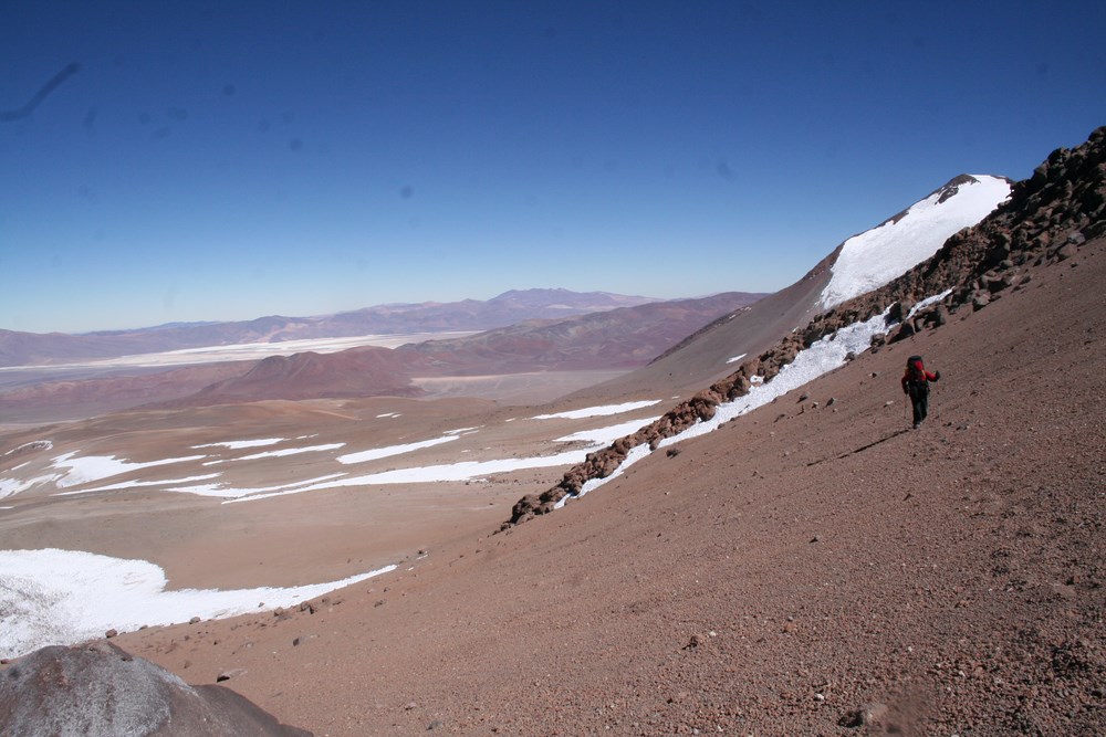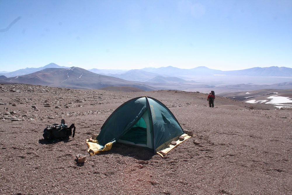 Gegenüber dieser Senke die über Jahrtausenden von dem Schmelzwasser geformt wurde wird eine Spur vermutet, jedenfalls wird das Ufer nicht gewechselt, ja es ist absolut harte Arbeit, es wird klar hier ist eine Höhere Anfahrt absolut unmöglich, kann nicht gehen! Der Nordgipfel mit seinem Schnee und Eispanzer wird unterhalb gequert, die Gipfel der Begierde sind zwar noch nicht auszumachen doch die Scharte lässt sich erahnen, verdammt weit weg das Ganze, die Planung bzw. Vorstellung sah ganz anders aus, ist eine Kuppe erreicht folgt die nächste, zum guten glück ist es auf dieser Höhe nicht ganz so warm, die Bombastische Fernsicht entschädigt zwar, aber die Ermüdung ist nicht aufzuhalten, das Gepäck drückt auf die Schultern geschätzte 20 Kg. Mit jedem Meter Höhengewinn verliert Jens den Anschluss, die Pausen bringen ihn wieder ran, der Central Gipfel taucht auf, auch die Rinne die zur Scharte führt ist erkennbar. Einem ersten Büßer Schneefeld das mühevoll gequert wird folgt das nächste, das ganze mit Gegenanstiegen, Wasser ist zwar vorhanden doch ist dieses Sandig. Auf 5450 m finde ich einen brauchbaren und ebenen Platz, der für das Zelt ausreichend sein sollte. Es ist 17.15 Uhr, nach einer ersten Schöpferischen Pause, versuche ich bei starkem Wind das Zelt aufzustellen, die Höhe bremst die Aktivität stark ein, die umliegenden Steine werden auf die Enden der Zeltplane gelegt, nur so war ein alleiniges aufstellen möglich, 30 Minuten nach Ankunft steht die Behausung, auf einer kleinen Anhöhe habe ich etwas Übersicht, ja Jens nähert sich, Mauseplatt trifft er ein, das Nachtlager wird präpariert, erstmals einen Pfirsich Essen, im Aufstieg wurde 1,5 Liter Flüssigkeit aufgenommen, viel zu wenig uns war nicht so, diese 5 Std. Aufstieg kostete enorme Kraft. Herrlich von hier die Aussicht auf das Riesige Salar Maricunga das doch schon 1600m tiefer lag, störend nur der Giftige und Kalte Wind, und der Druck was auf dem Kopf lastet! es ist 20.00 Uhr, 70 m Meter entfernt zwischen den Büßern finden wir fließend Wasser, das an der Oberfläche schon Sulzig wird, 6,5 L werden eingeholt, wohl etwas Trüb aber… ein Aufenthalt um diese Uhrzeit, nur im inneren der Stoffhülle genannt Zelt möglich. Auf einem flachen Stein wird der Topf platziert, um genug Verbrennungsluft zu erhalten bleibt das Zelt ausreichend geöffnet, das bewegen im Schlafsack zum Kochen gar nicht so einfach, dazu bricht die Nacht herein, einer Nudelsuppe folgt ein Traveller Lunch „Beef Stroganoff“ das nicht sonderlich mundet. Bei Jens geht am Schlafsack der Reißverschluss kaputt, oh je! 22.00 Uhr, geschwächt geht es in eine ungewisse aber Sternenklare Nacht.