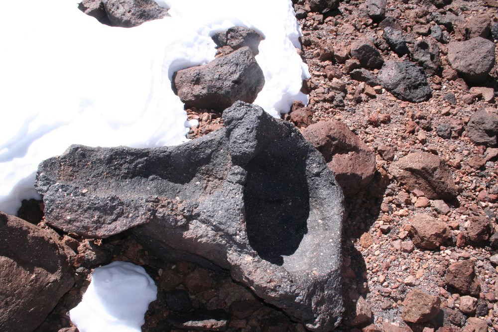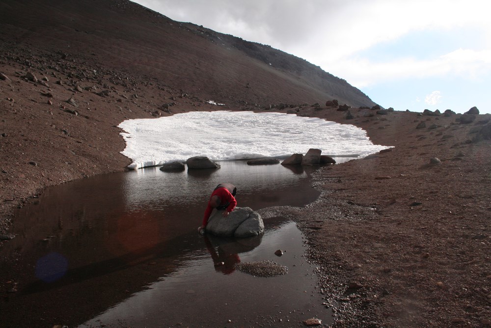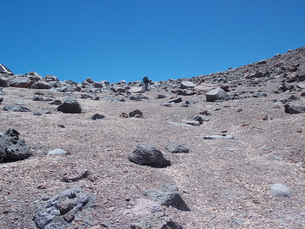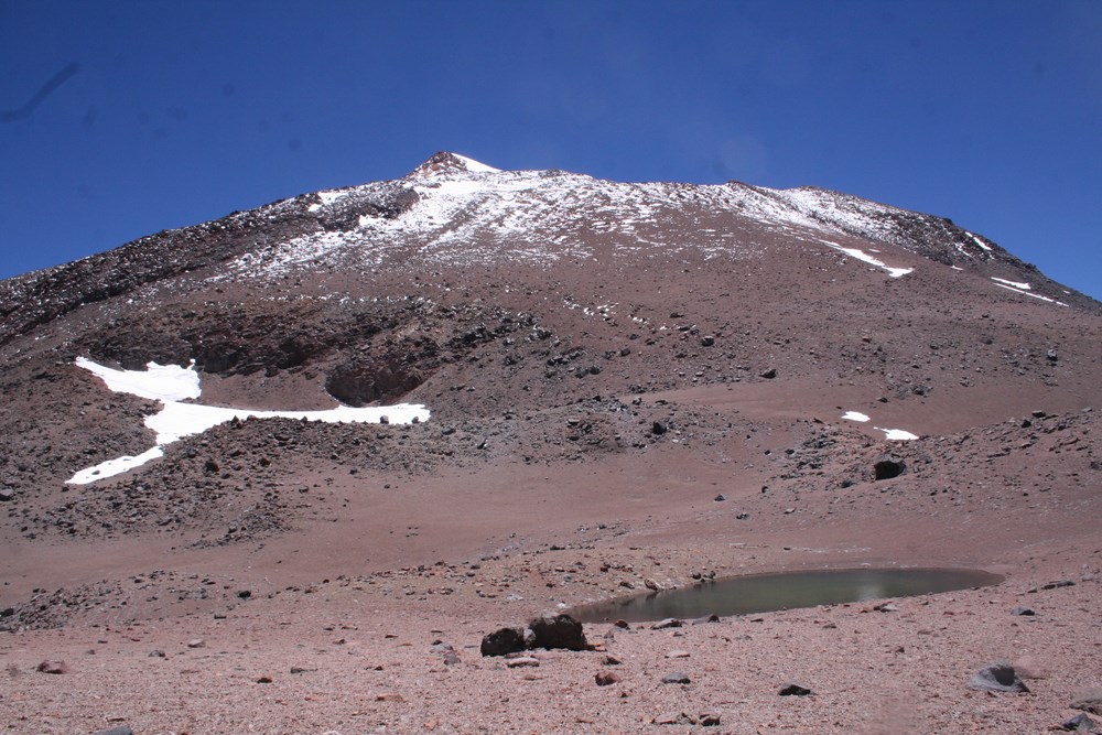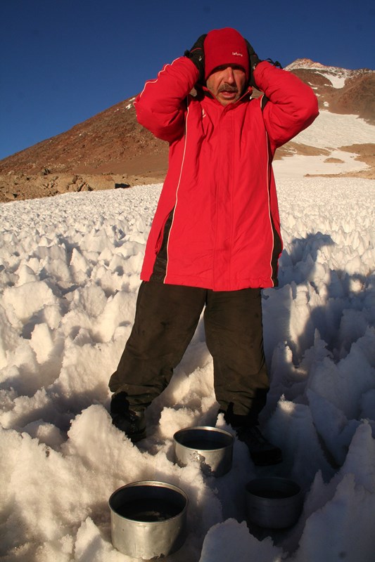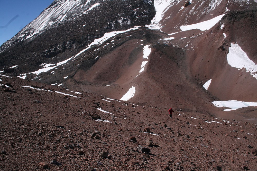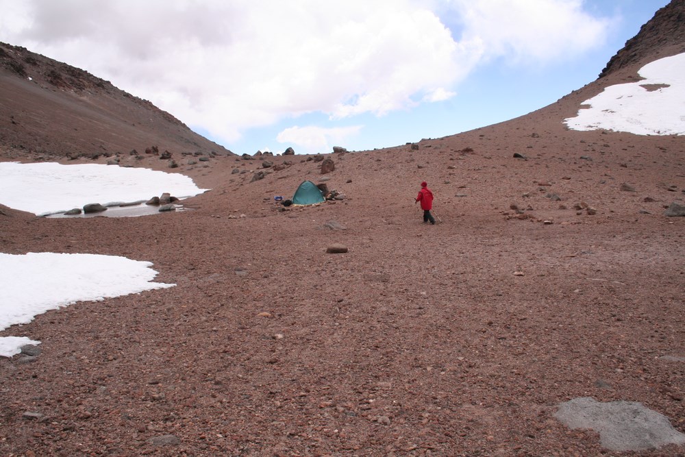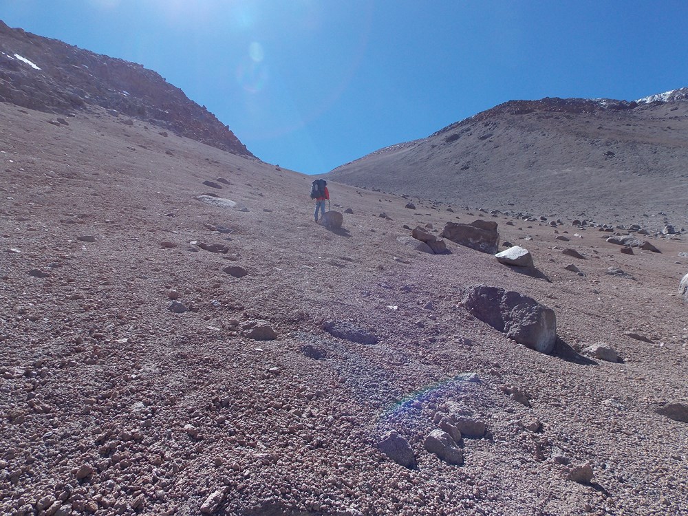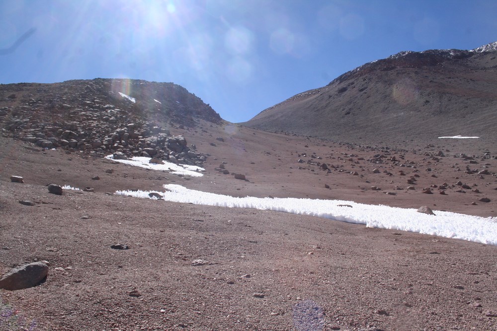 Dienstag 14.Januar: Ein warten auf die Sonne, ein Blick aus dem eh nicht verschlossenem Zelt lässt einen klaren blauen Himmel erwarten. 8.45 Uhr, Geduld jetzt, das Innen und Außenzelt beginnt in den Strahlen der Sonne zu tauen, die Tropfen fallen…mit einem Handtuch wird versucht die Nässe an der Decke aufzusaugen, nebenbei die Schuhe in den Schnee gestellt. Die in den Kleidern eingepackten Trinkflaschen sind leicht gefroren, doch dem Kocher gelingt es rasch die Flüssigkeit in erwärmendes Teewasser umzuwandeln, noch immer benutzten wir die erste Große Kartusche mit dieser hatten wir schon im Caribe gekocht!! Der Kuchen schmeckte wohl lecker, aber der Kopf litt noch immer der Sauerstoff armen Luft. So langsam verlegte sich das treiben nach draußen, die 2 cm Neuschnee wurden ganz langsam von der Sonne aufgesogen. Die Isomatte und der Schlafsack waren wohl einfach trocken zulegen, doch das Zelt war Nass wie ein Schwamm, langsam aber stetig fanden die kleinen Ausrüstungsgegenstände ihren Platz in dem Rucksack, der vorhin noch gefroren war. Etwas Unrat anderer Bergsteiger wurde gleich mit entsorgt, wobei es hier absolut nicht nach Zivilisation aussah, wohl wenig Menschen die sich hier her verirren. 10.45 Uhr, der Schnee war komplett verschwunden, Zeit zu gehen, Windstille, Friedlich verlassen wir einen Ort, denn wir wohl nicht mehr vergessen werden! Aber schon wenige Minuten später ändert sich das Bild, am Hang blies der Wind ganz schön ins Gesicht, anziehen der Jacke und Handschuhe. Der Hang erwies sich als leichte weil nicht zu steile Schuttreise, deutliche Spuren der Abfahrt sind zu erkennen, schon nach 40 Minuten das Camp I erreicht! Wenig später wird das einzige Büßerschneefeld im Abstieg gequert, es läuft nun viel lockerer der Körper dankt die „bessere“ Luft. Auffällig die Wolken zogen nicht nur aus Westlicher Richtung auf, Nein auch aus Ost, für uns wohl weniger störend, doch ist davon aus zugehen das sich einige Bergsteiger an den umliegenden Gipfel betätigen. Der Abstieg erfolgt anders als im Aufstieg, in einem Westlichen Bogen, wobei das Terrain dasselbe ist, doch macht eben im Abstieg der tiefe Sand weniger zu schaffen, oder besser gesagt der Körper kompensiert, gleicht die Arbeit mit dem zunehmenden Sauerstoffgehalt aus. Diese Frage stellen wir uns erneut: wie soll es möglich sein? Das Fahrzeug durch Sand und Stein hierher Nahe dem Camp I zu Fahren… Unterwegs schmeckte es richtig gut 4 Trinkpausen. Ab dem Nordgipfel verengt sich das Becken, es bildet sich ein Einschnitt, ja es entsteht ein Bachlauf, gegen später sogar mit fliesendem Schmelzwasser, in diesem bzw. entlang des Wassers folgen wir eine gewisse Zeit, das Wasser versiegt langsam.