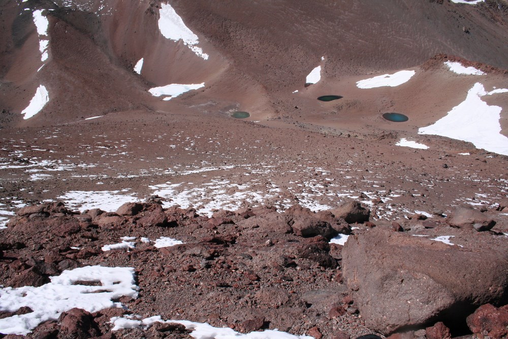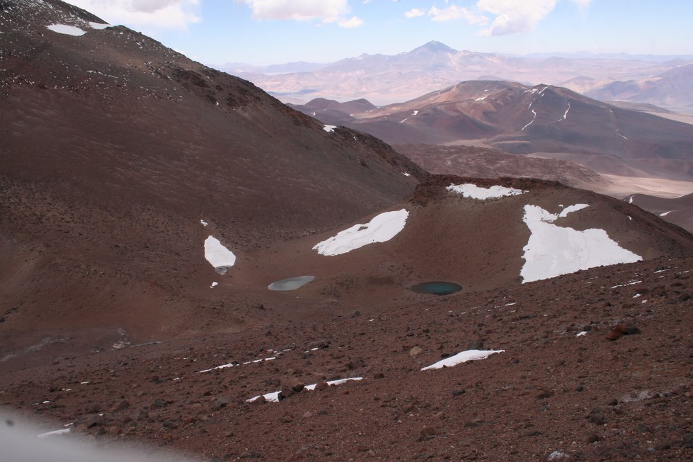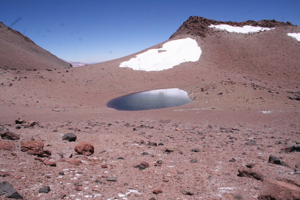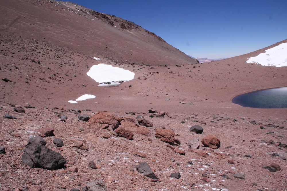 Sonntag 12.Januar: 8.00 Uhr, die Sonne erwärmt das Zelt, der Rücken von Jens bereitet immer noch Kummer. Das Thema: ist es möglich noch am selben Tag den Gipfel des Tres Cruces Central direkt zu bewerkstelligen? diese Überlegung ist nicht von ungefähr! der Zustand einfach nicht ideal, für das Vorhaben zwei Übernachtungen auf knapp 6000 m, das gab es noch nie. 1 Liter Teewasser wird im Zelt gekocht, nur das Geräusch des Kochers ist an diesem Einsamen Ort wahrzunehmen, zum Essen Kekse, der Appetit könnte größer sein. Priorität Trocknen des Schlafsacks, danach Professionell der Abbau des Zeltes und verstauen der Ausrüstung, es ist 10.15 Uhr, Start. Die Rinne die die Berge trennt, ist zum Greifen nah. Einem ersten Anstieg in tiefem Sand an den Fuß des Central folgt, eine Querung, danach stiegen wir Links haltend an den Büßern vorbei nach oben, plötzlich erste Spuren, mit jedem Meter wird diese ausgetretener und deutlicher wahrzunehmen, sie verläuft im Losen Gestein auf der linken Nördlichen Seite des ausgewaschenen Bachbettes. Die Steilheit nimmt etwas zu und erfordert sehr viel Kraft, „Jens hat etwas schmerzen, die Ferse ist leicht offen“ nach einer gewissen Zeit wechseln wir Links, tatsächlich läuft es sich besser und damit auch leichter, es geht gut voran, der Körper bekommt wohl genug Sauerstoff, wir legen für die gut 500 Höhenmeter drei Trinkpausen ein, wohl wissend das jeder Tropfen Flüssigkeit auf solchen Höhen Lebenswichtig und für einen Erfolg unverzichtbar sind Je weiter desto Windstiller und dadurch angenehmer wurde es, (der West Wind wahrscheinlich der Garant für ein beständiges Wetter hier in der Atacama), aber er setzt natürlich stark zu. Die Betriebstemperatur unseres Körper ganz gut, die Rinne wird immer schmaler, im Bereich von 5800 m flacht das Gelände etwas ab, der Ideale Aufstieg liegt im Bachbett es liegen wohl einige Steine die überstiegen werden müssen, der Untergrund ist fest und verhindert ein abrutschen dadurch Kraftsparend, Auffallend ist die Spur Links, hier ist das Gelände schön Tief, ideal für eine „Abfahrt“. Ein letztes Mal eine Pause, geschützt hinter einem Großen Stein, von hier aus laufen die Gratflanken zusammen. Wie jeden Tag bewölkt es sich zum Mittag hin! Nach 3 ½ Std. und 500 Hm. am höchsten Punkt der Scharte angekommen, es ist ein erster See auszumachen, die Stimmung steigt, wie überhaupt übertraf der Anblick dieser „Hochfläche“ alle Vorstellungen. Noch ist aber kein Lager auszumachen, ich steige zum Nördlichen See ab, aber auch hier ist kein Lagerplatz auszumachen, erst auf einer Anhöhe wird ein dritter See sichtbar, ja hier ist der geniale Ort, es ist 13.45 Uhr, ein Platz zum Wohl sein, wenigstens für dieses Unternehmen nicht aber zum Flanieren! Neben dem Camp befindet sich eine Akia (ein Wasserfass das in der Mitte geteilt wurde, dient als Rettungsschlitten) die zweite Hälfte lag etwas tiefer als die Scharte! Das Wasser im See in 20 Meter Entfernung, der von Schnee am Hang daneben versorgt wird, ist von bester Qualität.