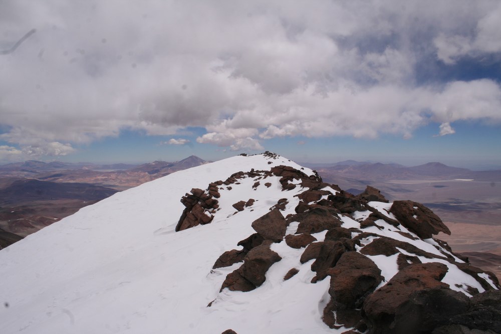 Montag 13.Januar: 7.15 Uhr, ein Blick aus dem Zelt verspricht wohl gutes, doch der Wind ist noch heftig, dazu ist es ohne die Sonne noch zu Kalt! 8.45 Uhr, wir müssen! wenn jetzt nicht wann dann? Jens ist noch mehr „gerädert“ als ich. 1 L Teewasser und 250 Gramm Kuchen zum Frühstück, ausreichend! rein in die Eisigen Schuhe, Start kurz nach dem die Sonne sichtbar wird es ist 9.15 Uhr. Die Taktik: die fallende Außentemperatur (bedingt durch den Aufstieg) mit der aufgehenden Sonne auszugleichen, die Route alles eine Frage der Vorstellungskraft gepaart mit Erfahrung und Können. Noch ist die Wegführung unklar… erstes Ziel der Pass im Osten, doch der Süd Grat schien weniger geeignet, die Flanke wohl das bessere Terrain! Stetig Nördlich querend ist das Lose Vulkangebrösel wohl sehr anstrengend, die Entfernung zum Camp nimmt aber stetig zu, als dann eine erste Spur sichtbar wird, ein wichtiges Erfolgserlebnis, die Richtung wie vermutet! eine Verlängerung Zelt-Gipfel, die Spur verliert sich, eine Felspassage im Schwierigkeitsgrad I-II gilt es zu durchsteigen gelingt gut, es liegen 350 Hm Distanz zum Lager, Gehzeit 2 ½ Std. sehr wenig, Jens geht zu schnell und benötigt daher zu vielen Phasen zum Erholen, klar das nicht ein jeder Körper zu seinem gewünschten Rhythmus finden kann, mit vereinten Kräften und Motivation, lief es dann auch Dynamischer, längere Geh Passagen das Resultat! eigentlich folgten die Füße den Befehlen, das Stunden Mittel das bisher immer bei über 200 Hm lag (Aufstieg zum Gipfel), steigerte sich etwas. Hie und da tauchte eine alte Spur auf, verflog aber im lockeren und leichten Vulkangestein, auch Trinkpausen wurden eingelegt. Mit einer guten Taktik wurde der Steinige Gipfelaufbau um 13.40 Uhr, bei lausigen Bedingungen erreicht. 1 Liter Flüssigkeit bisher getrunken doch der Körper will leider gar nicht mehr! Wissend dass wir gleich oben sind, setzte ich mich an einem Schnee und Firnbedeckten Grat in Bewegung, über die Linke Flanke gilt es in den Kamin zu queren, die Kletterei, eine machbare Aufgabe, über Größere Quader geht anstrengend vorwärts, die dünne Luft ermüdet, inmitten werden die Stöcke abgelegt, auch die Hände werden nun benötigt, Jens kommt auch an, von etwas über ihm, vermittle ich die Situation. Eine kleine vereiste Rinne die mit zwei flinken Bewegungen überwunden war, ist die Schlüsselstelle schlechthin. Danach der schneebedeckte und mit Steine gepflasterte Grad erreicht. Dieser wollte nicht enden…Es war noch viel weiter als Gedacht, ein Schock 14.00 Uhr, der Steinmann der als Gipfel gesetzt wurde, wies nicht das Gipfelbuch von "Banco de Chile" auf, außer einer Dose, ohne diese zu öffnen gehe ich weiter, auch mit am Sicherheit Höchsten Punkt des Tres Cruces Central 6642m, fand ich die Blechschachtel nicht (Vier Tage zuvor erzählte ein Englisches Paar das sie dieses Box mit dem Eispickel ausgegraben hatten). Noch einmal ging ich weit zurück, doch der Kamerad tauchte nicht auf. Angst kam auf (waren es doch nur 10 Meter die uns trennten). Schnell zurück ein Selbstportrait .Aufnahmen der Utensilien.