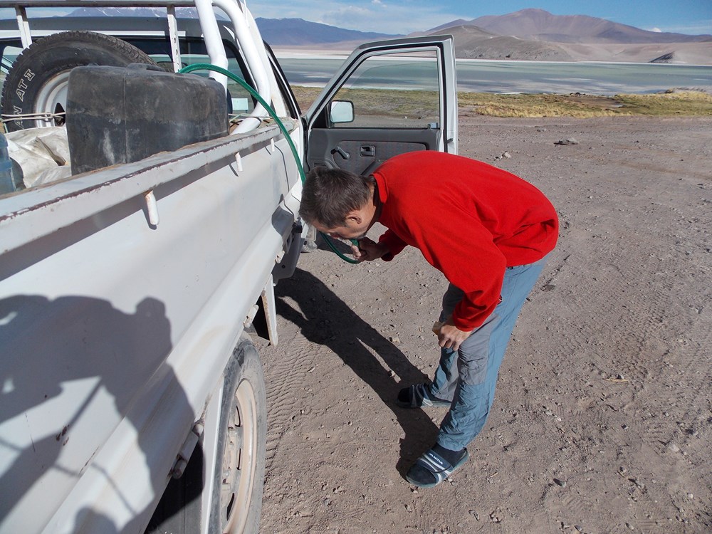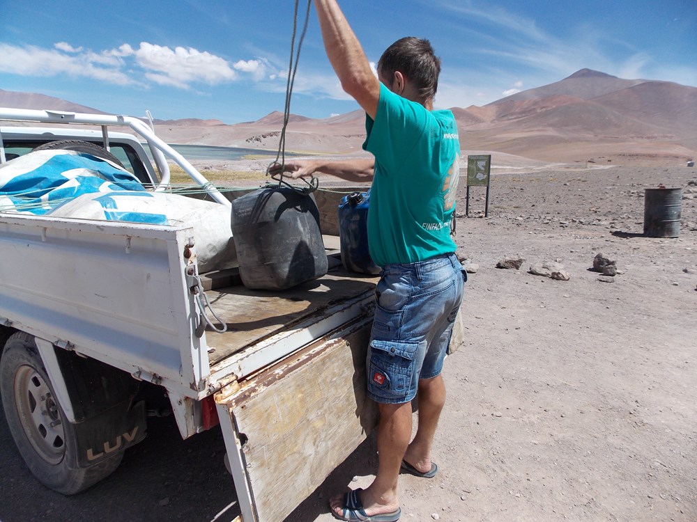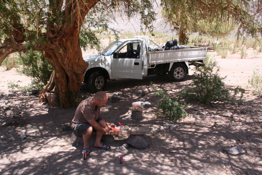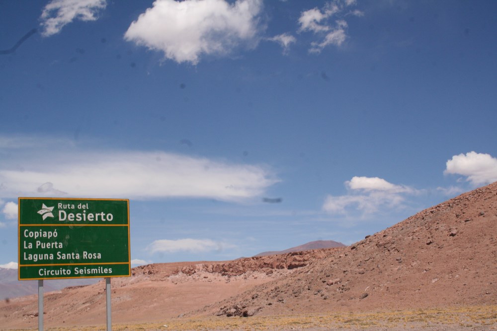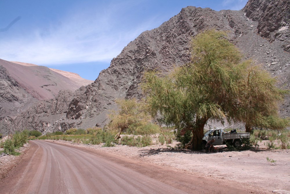 Donnerstag 9.Januar: Die Fahrt alles andere als Angenehm, die Motorengräusche konnten mehr als wahrgenommen werden. 9.15 Uhr Ankunft bei bestem Wetter, nur 150 m bis zu der Autovermietung, zu aller Freude sitzt die uns bestens bekannte Dame hinter dem Schreibtisch, die Formalitäten in diesem Fall Obligatorischer Natur, Rabatt gibt’s Obendrein auch noch statt 59.000 sind es nun 55.000 Peso pro Tag, einziger Mangel es stand nur ein Zweisitzer zur Verfügung, Problem das Gepäck kann nicht alles im Fahrzeug verstaut werden, und ist natürlich dem aufwirbelnden Staub ausgesetzt. Vorsorglich fragen wir nach zwei Holzbohlen, könnte ja sein das das Fahrzeug im Sand festsitzt, der Wunsch nach einer Plane wird ebenfalls erfüllt. Nun kann es losgehen. Erstes Ziel ist der Jumbo Supermarkt für 50.000 Peso Lebensmittel dazu Wasser in Flaschen und Gallonen. 1,5 L Wein,12 Dosen Bier, 2 L Saft, 3 Kuchen, 3 Pack Kekse, 6 Äpfel 2 Aprikosen, 3 Große Tomaten, Pfefferoni, Butter Sprim, Wurst, Suppen, Gulasch, Nudeln, Wecken, Vollkorn Brot, Eier De Beukelaer, Chips, Gurke, Zwiebel, Pfeffer, Müsli Riegel, Käse. 44 Liter Sprit für 41.000 Peso verschwinden in den 2 Ersatzkanistern. Es ist 12.00 Uhr, die Stadtgrenze von Copiapo liegt hinter uns es ist Staubig Heiß und trocken, überall liegt Müll, nichts Neues hier, die Natur spielt hier keine Rolle. Der Weg zur Laguna Santa Rosa ist bestens bekannt nach dem Verlassen der befestigten Piste wird es staubig. Unterwegs wird das Fahrzeug im Schatten eines Baumes abgestellt, Zeit für eine Vesperpause, die Brötchen lecker wie immer, dazu die wohlschmeckenden Tomaten Käse und Wurst.