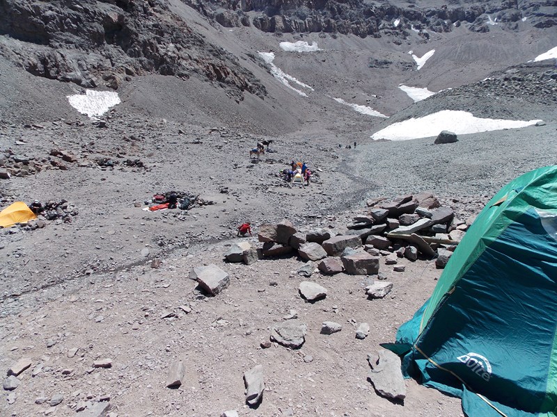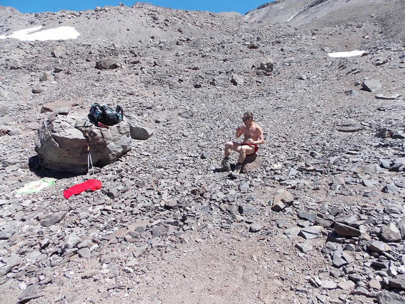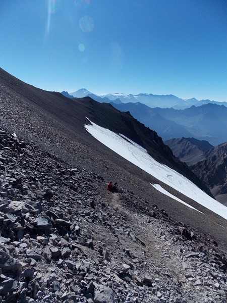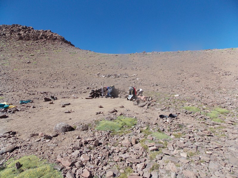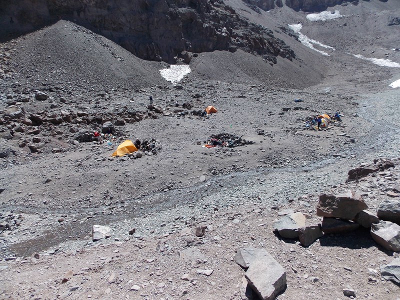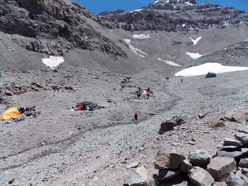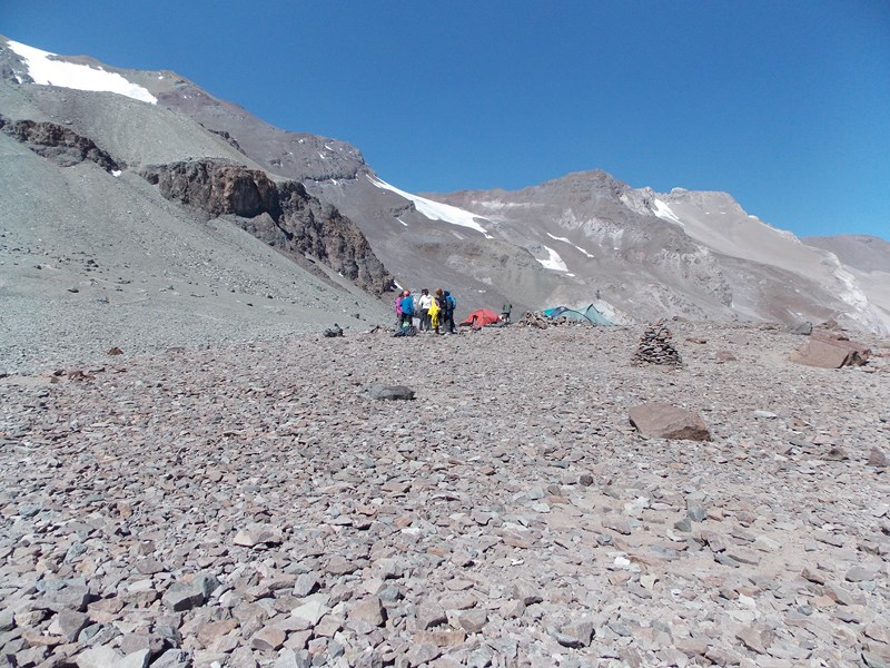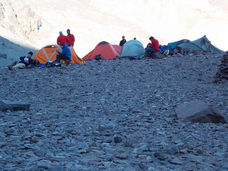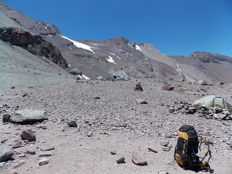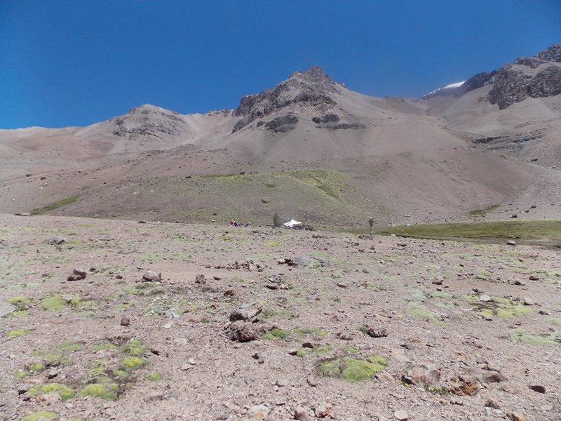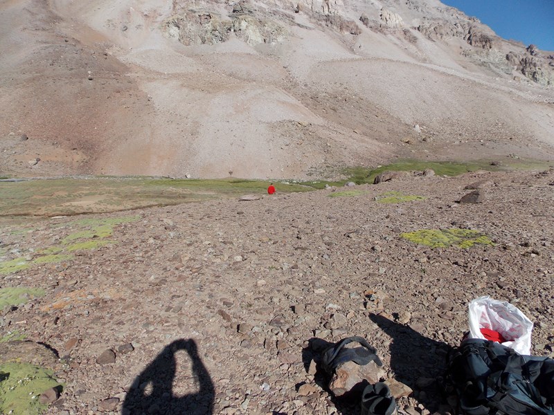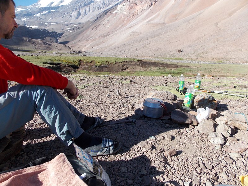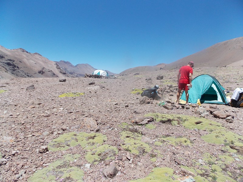 Der Genuss dieser wohl einmaligen Landschaft kam dabei nicht zu kurz, in genau 2 Std. das Lager verbraucht Platt zufrieden und Glücklich erreicht. Wasser einholen noch war es Sauber, schnell standen wir im Interesse, die "neuen" Nachbarn hatten auch recht auf Antwort ihrer Fragen über die Besteigung. Ab in das völlig geöffnete Zelt, es war erbärmlich Heiß aber der Körpers benötigte dringend Ruhe. "Two hour later" packen, wir wollen ein Lager tiefer, besser so hier in der Steinwüste fehlt das Grün das die Sinne erfreut. Beim Verlassen zählen wir noch 10 Zelte, Ja die Chilenen müssen Morgen zur Arbeit. Es sei gesagt, Respekt an all die die von hier aus noch am selben Tag den Weg komplett zurück bis zum Fahrzeug und die Heimreise bewältigen. Im Abstieg begegnen wir noch ein paar Personen und Mulli Treibern, Mitleid aber müssen wir mit einer Chilenin haben die allein Unterwegs war (Am Gipfel hat Sie noch ganz Stolz ein Video mit sich und den Traumbergen gedreht) kurz vor der Fluss Überquerung passieren wir Sie, ihr Rucksack hing auf halb vier. Es hatte den Anschein das die anderen sich ihrer annahmen. Zufrieden und in ein doch guten Verfassung wurde das Zelt genau an der Stelle errichtet an der ein Argentinisches Pärchen im Aufstieg ihr Zelt aufstellte, der wohl schönste Platz, und wir waren hier die Einzigen. In dieser Nacht Träumten wir wohl von einer Etappe im Leben, die so nie erwartet werden konnte. Doch eine unbekannte gab es noch, und die sollte Morgen geklärt werden.