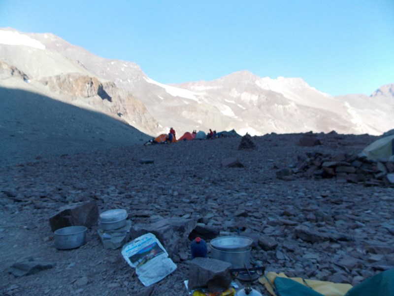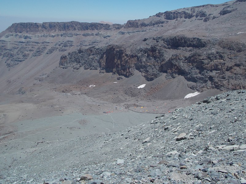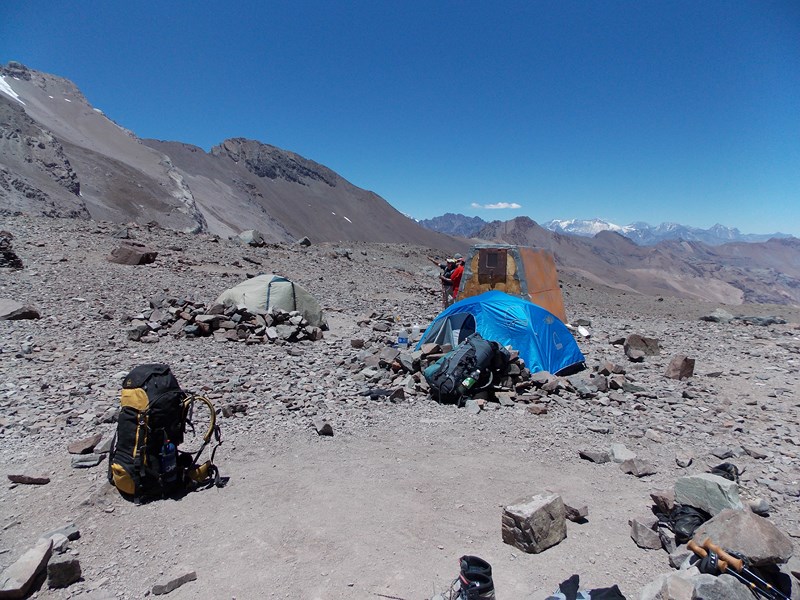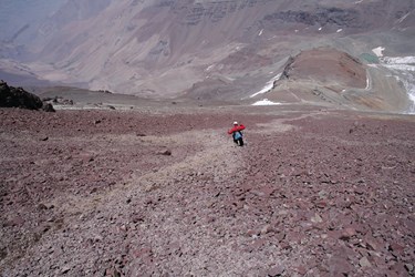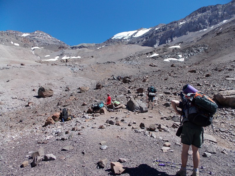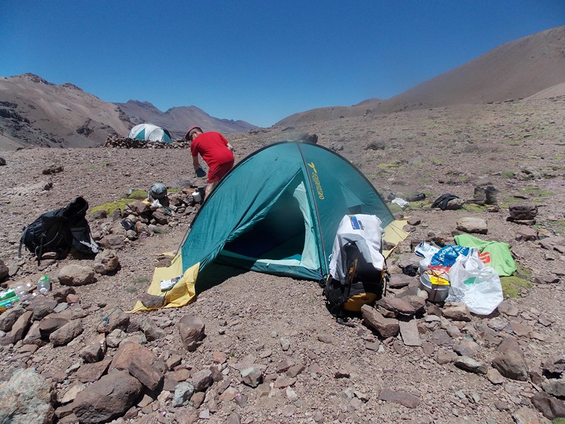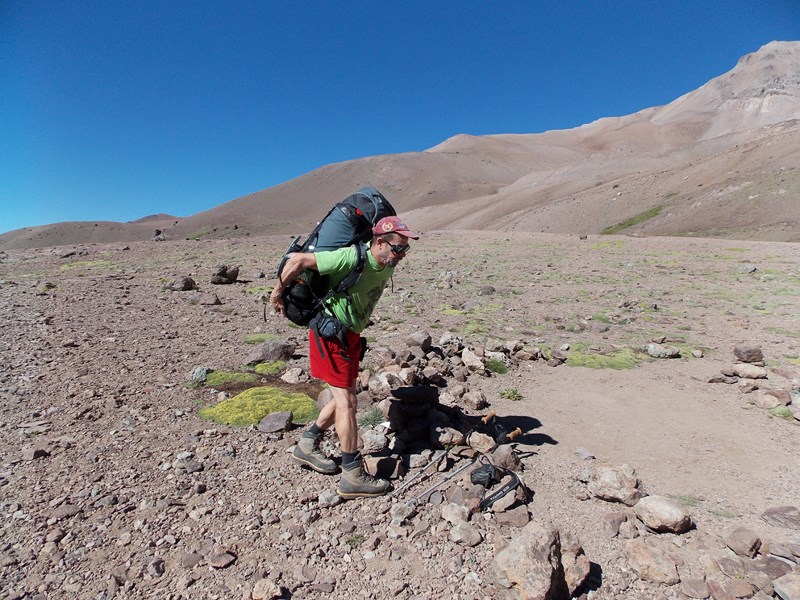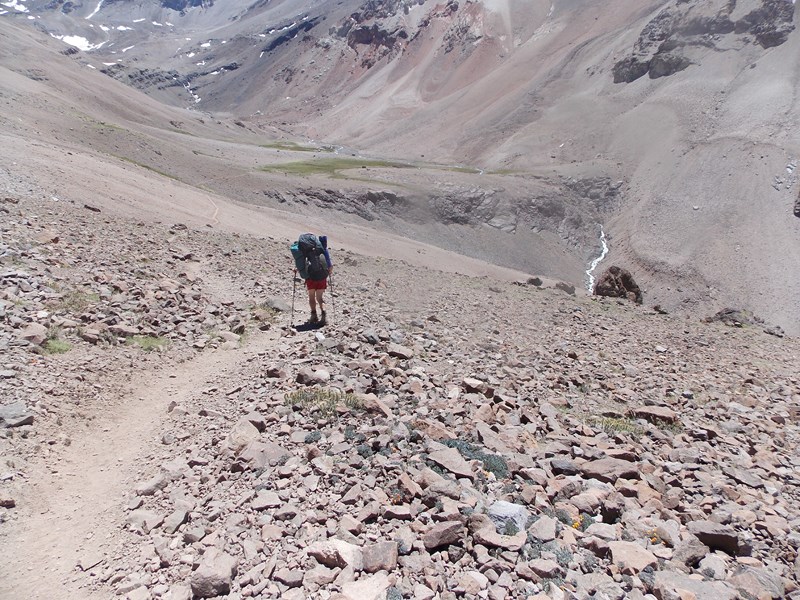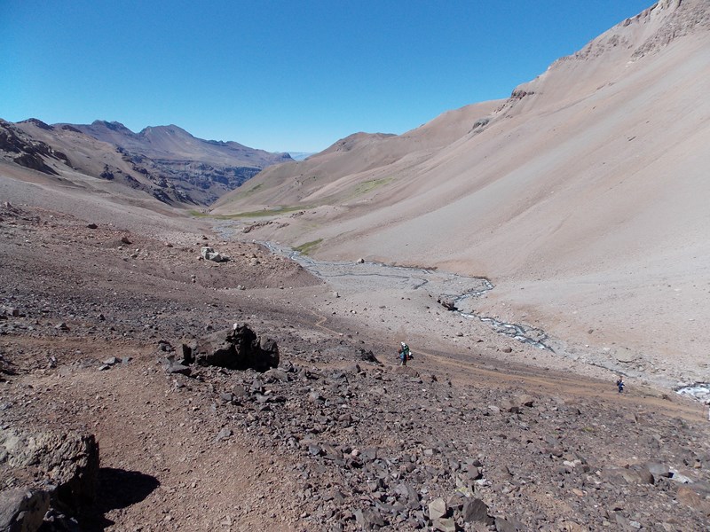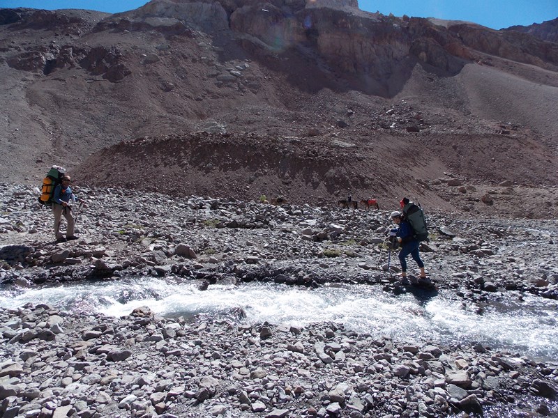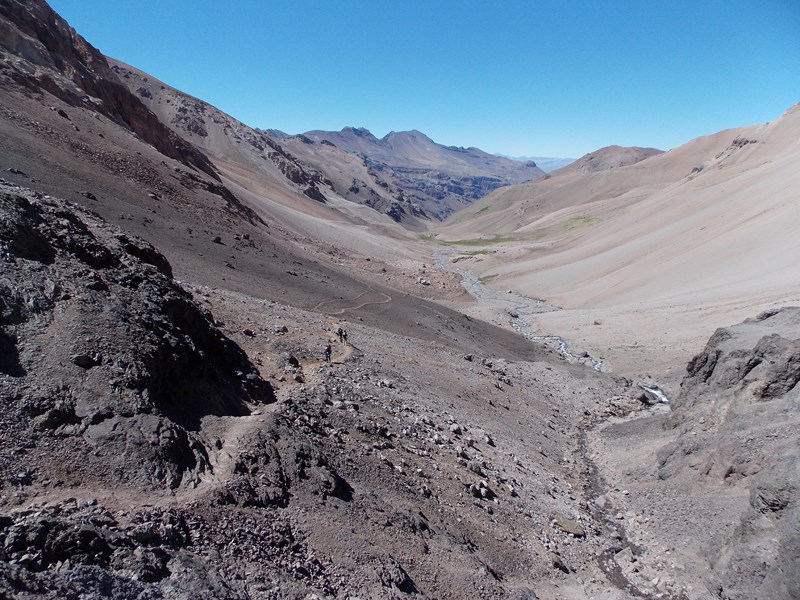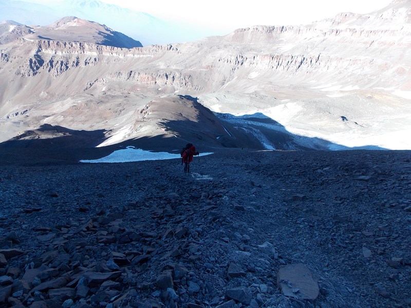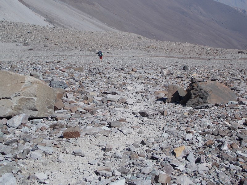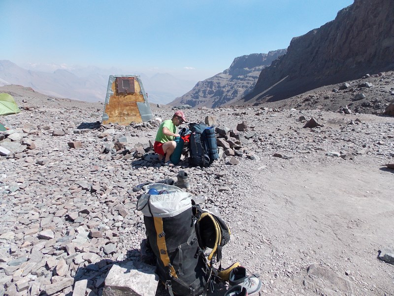 Der Genuss dieser wohl einmaligen Landschaft kam dabei nicht zu kurz, in genau 2 Std. das Lager verbraucht Platt zufrieden und Glücklich erreicht. Wasser einholen noch war es Sauber, schnell standen wir im Interesse, die "neuen" Nachbarn hatten auch recht auf Antwort ihrer Fragen über die Besteigung. Ab in das völlig geöffnete Zelt, es war erbärmlich Heiß aber der Körpers benötigte dringend Ruhe. "Two hour later" packen, wir wollen ein Lager tiefer, besser so hier in der Steinwüste fehlt das Grün das die Sinne erfreut. Beim Verlassen zählen wir noch 10 Zelte, Ja die Chilenen müssen Morgen zur Arbeit. Es sei gesagt, Respekt an all die die von hier aus noch am selben Tag den Weg komplett zurück bis zum Fahrzeug und die Heimreise bewältigen. Im Abstieg begegnen wir noch ein paar Personen und Mulli Treibern, Mitleid aber müssen wir mit einer Chilenin haben die allein Unterwegs war (Am Gipfel hat Sie noch ganz Stolz ein Video mit sich und den Traumbergen gedreht) kurz vor der Fluss Überquerung passieren wir Sie, ihr Rucksack hing auf halb vier. Es hatte den Anschein das die anderen sich ihrer annahmen. Zufrieden und in ein doch guten Verfassung wurde das Zelt genau an der Stelle errichtet an der ein Argentinisches Pärchen im Aufstieg ihr Zelt aufstellte, der wohl schönste Platz, und wir waren hier die Einzigen. In dieser Nacht Träumten wir wohl von einer Etappe im Leben, die so nie erwartet werden konnte. Doch eine unbekannte gab es noch, und die sollte Morgen geklärt werden.