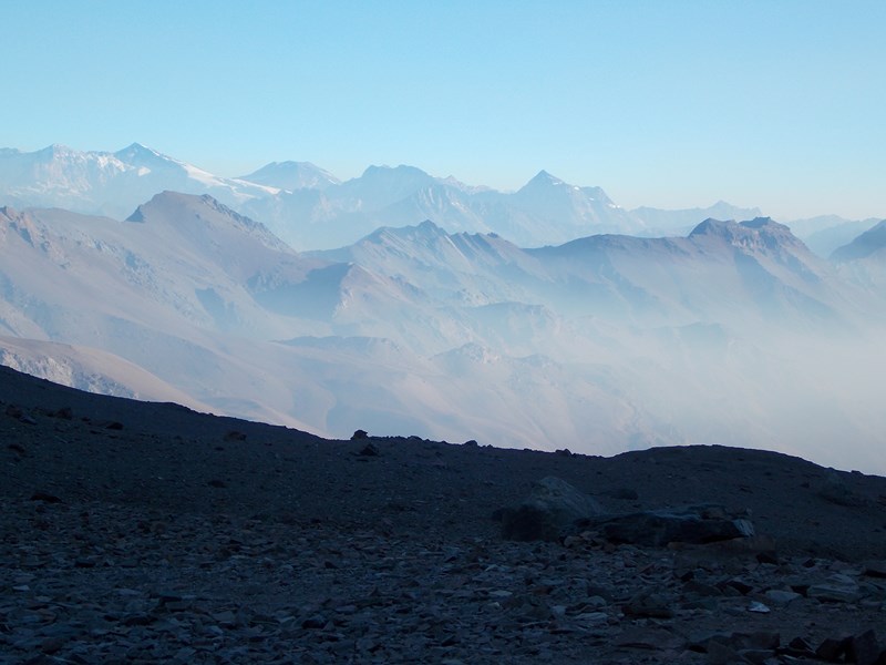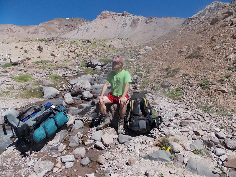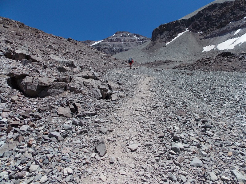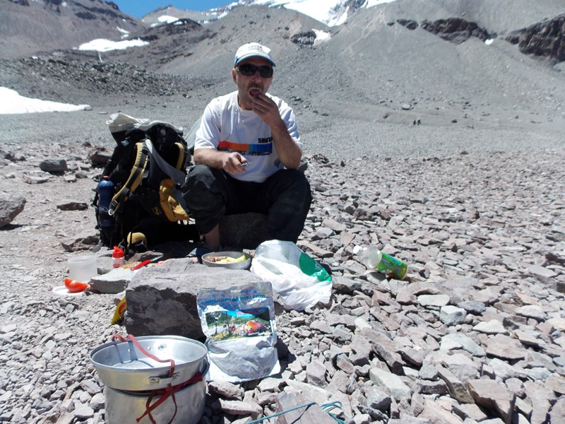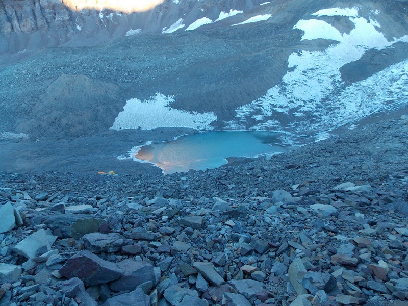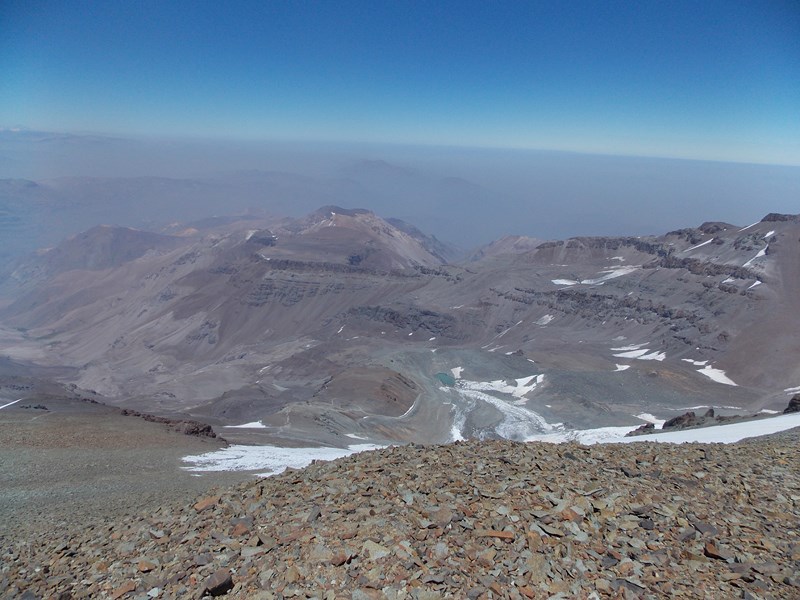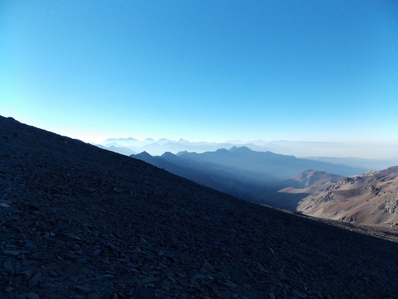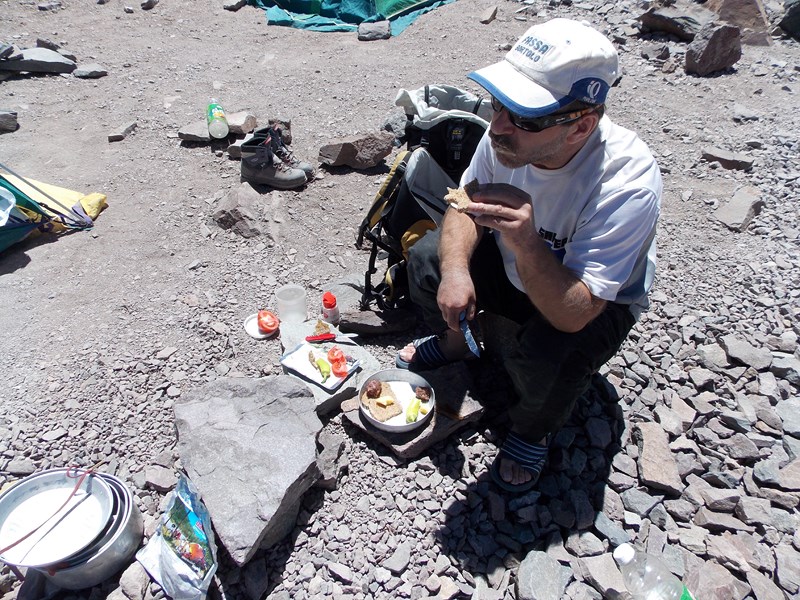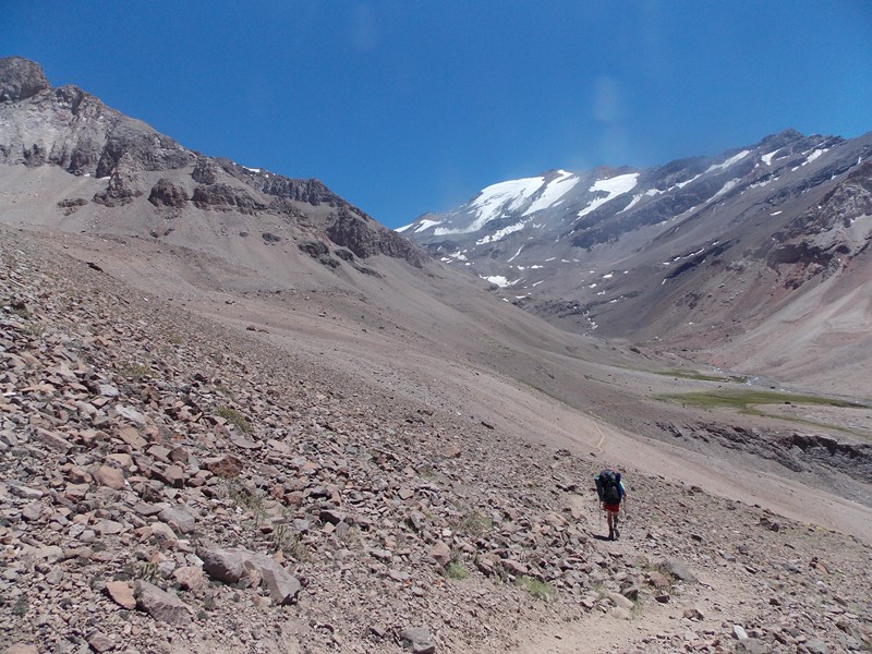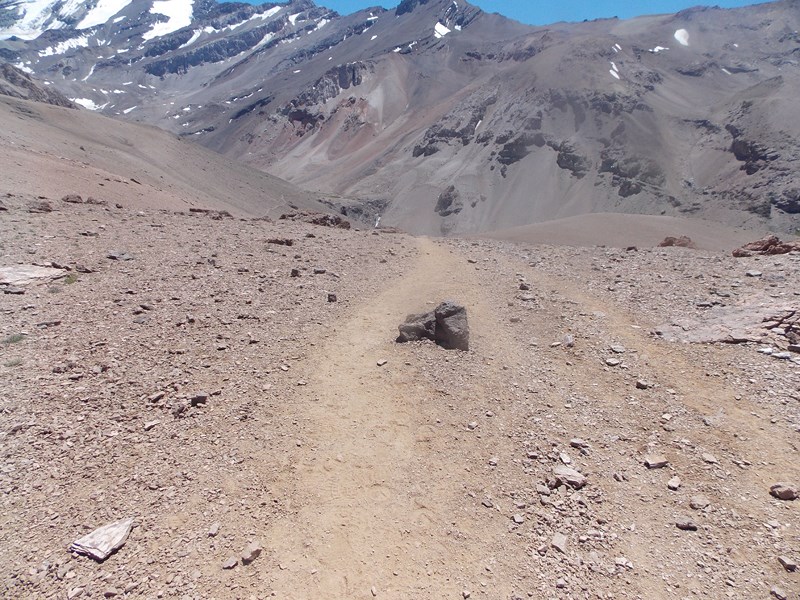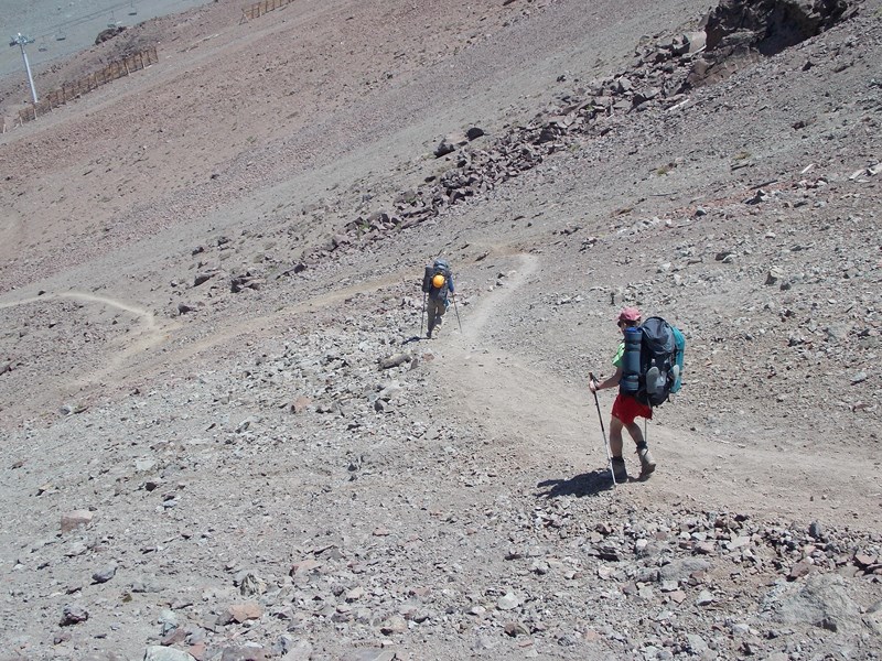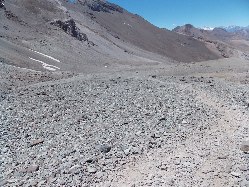 Der Genuss dieser wohl einmaligen Landschaft kam dabei nicht zu kurz, in genau 2 Std. das Lager verbraucht Platt zufrieden und Glücklich erreicht. Wasser einholen noch war es Sauber, schnell standen wir im Interesse, die "neuen" Nachbarn hatten auch recht auf Antwort ihrer Fragen über die Besteigung. Ab in das völlig geöffnete Zelt, es war erbärmlich Heiß aber der Körpers benötigte dringend Ruhe. "Two hour later" packen, wir wollen ein Lager tiefer, besser so hier in der Steinwüste fehlt das Grün das die Sinne erfreut. Beim Verlassen zählen wir noch 10 Zelte, Ja die Chilenen müssen Morgen zur Arbeit. Es sei gesagt, Respekt an all die die von hier aus noch am selben Tag den Weg komplett zurück bis zum Fahrzeug und die Heimreise bewältigen. Im Abstieg begegnen wir noch ein paar Personen und Mulli Treibern, Mitleid aber müssen wir mit einer Chilenin haben die allein Unterwegs war (Am Gipfel hat Sie noch ganz Stolz ein Video mit sich und den Traumbergen gedreht) kurz vor der Fluss Überquerung passieren wir Sie, ihr Rucksack hing auf halb vier. Es hatte den Anschein das die anderen sich ihrer annahmen. Zufrieden und in ein doch guten Verfassung wurde das Zelt genau an der Stelle errichtet an der ein Argentinisches Pärchen im Aufstieg ihr Zelt aufstellte, der wohl schönste Platz, und wir waren hier die Einzigen. In dieser Nacht Träumten wir wohl von einer Etappe im Leben, die so nie erwartet werden konnte. Doch eine unbekannte gab es noch, und die sollte Morgen geklärt werden.