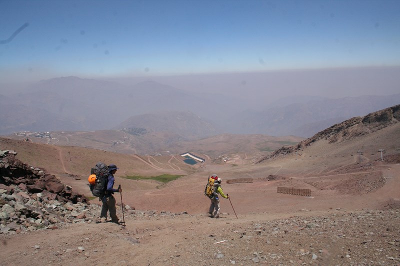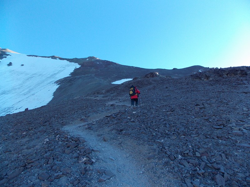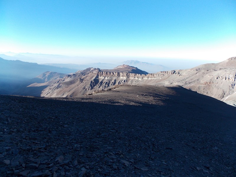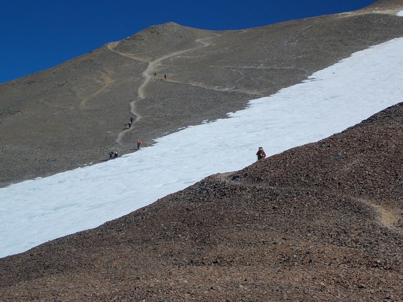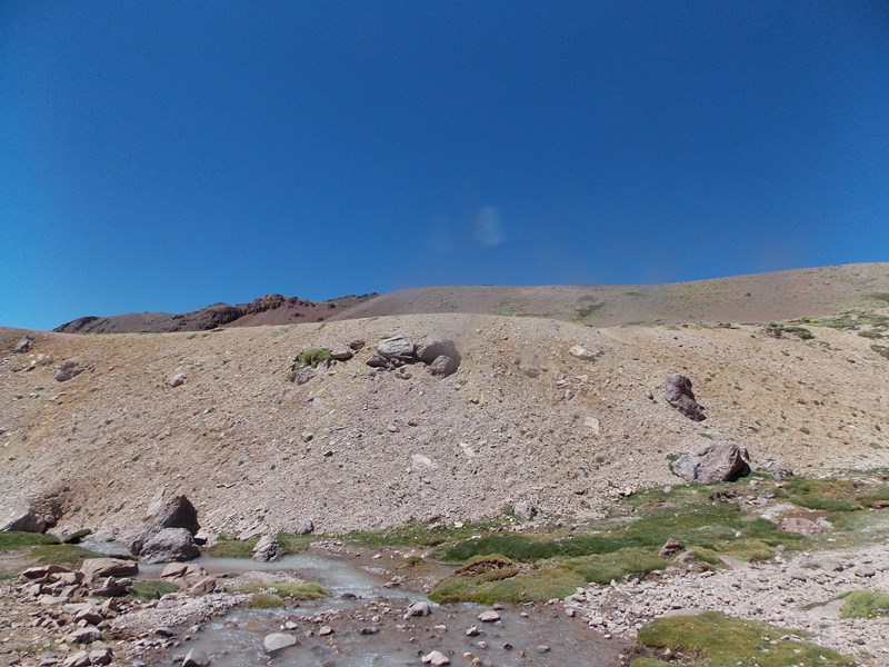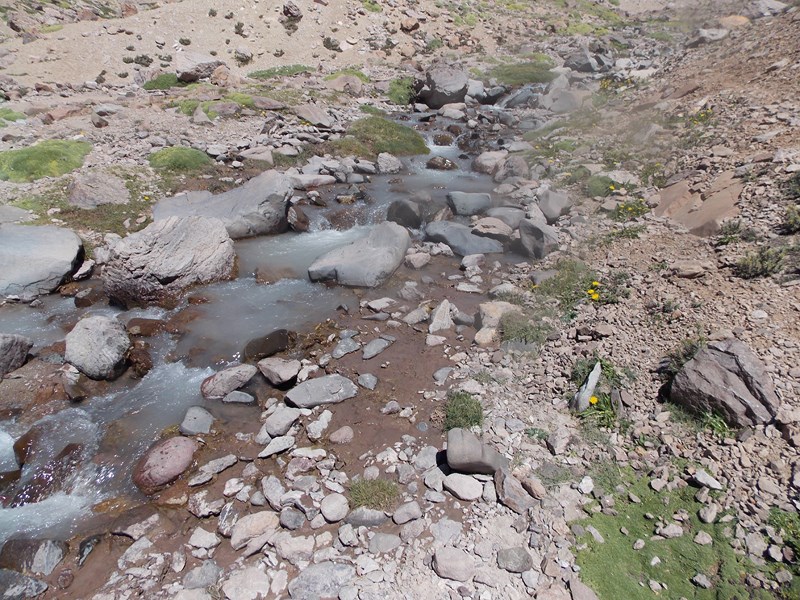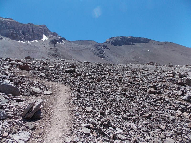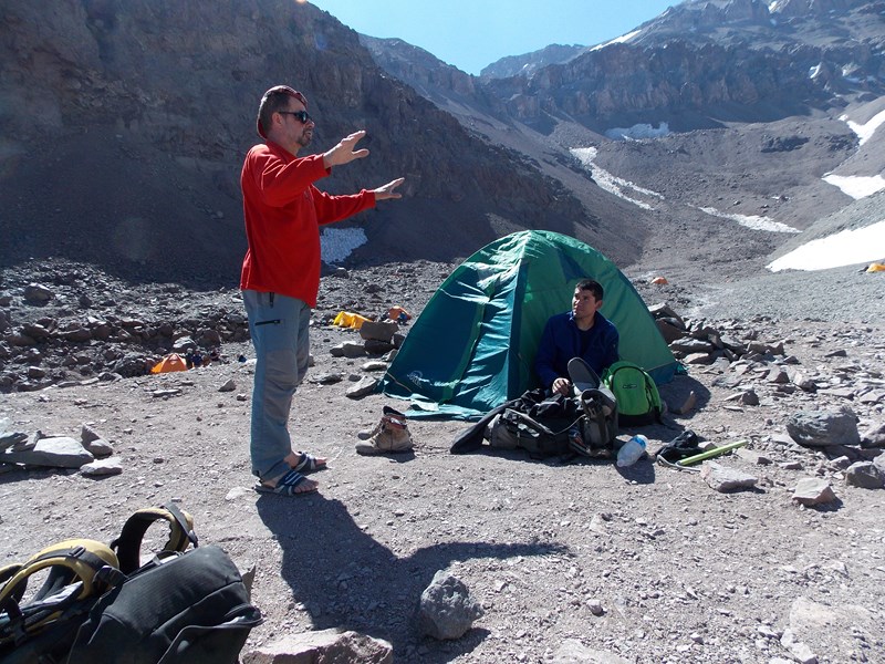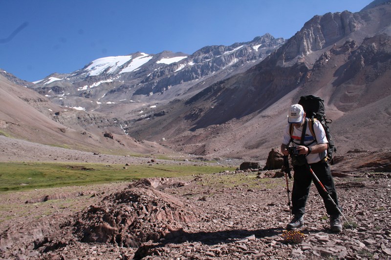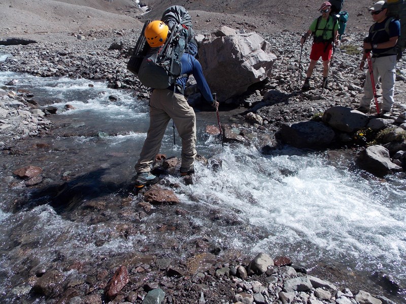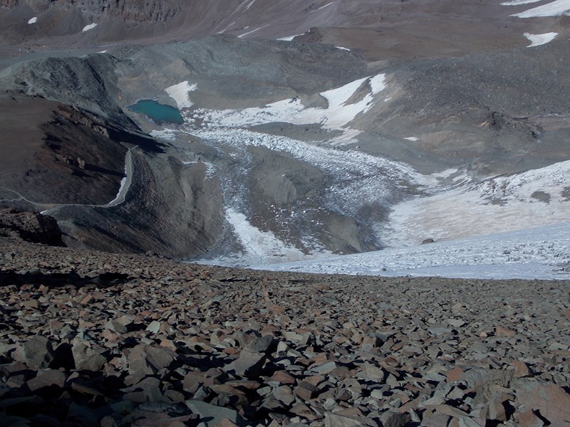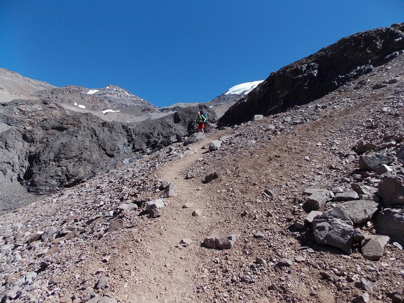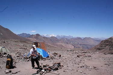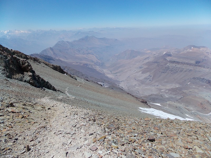 Der Genuss dieser wohl einmaligen Landschaft kam dabei nicht zu kurz, in genau 2 Std. das Lager verbraucht Platt zufrieden und Glücklich erreicht. Wasser einholen noch war es Sauber, schnell standen wir im Interesse, die "neuen" Nachbarn hatten auch recht auf Antwort ihrer Fragen über die Besteigung. Ab in das völlig geöffnete Zelt, es war erbärmlich Heiß aber der Körpers benötigte dringend Ruhe. "Two hour later" packen, wir wollen ein Lager tiefer, besser so hier in der Steinwüste fehlt das Grün das die Sinne erfreut. Beim Verlassen zählen wir noch 10 Zelte, Ja die Chilenen müssen Morgen zur Arbeit. Es sei gesagt, Respekt an all die die von hier aus noch am selben Tag den Weg komplett zurück bis zum Fahrzeug und die Heimreise bewältigen. Im Abstieg begegnen wir noch ein paar Personen und Mulli Treibern, Mitleid aber müssen wir mit einer Chilenin haben die allein Unterwegs war (Am Gipfel hat Sie noch ganz Stolz ein Video mit sich und den Traumbergen gedreht) kurz vor der Fluss Überquerung passieren wir Sie, ihr Rucksack hing auf halb vier. Es hatte den Anschein das die anderen sich ihrer annahmen. Zufrieden und in ein doch guten Verfassung wurde das Zelt genau an der Stelle errichtet an der ein Argentinisches Pärchen im Aufstieg ihr Zelt aufstellte, der wohl schönste Platz, und wir waren hier die Einzigen. In dieser Nacht Träumten wir wohl von einer Etappe im Leben, die so nie erwartet werden konnte. Doch eine unbekannte gab es noch, und die sollte Morgen geklärt werden.