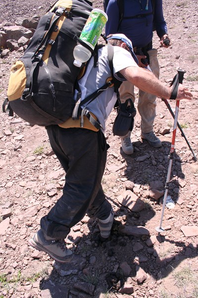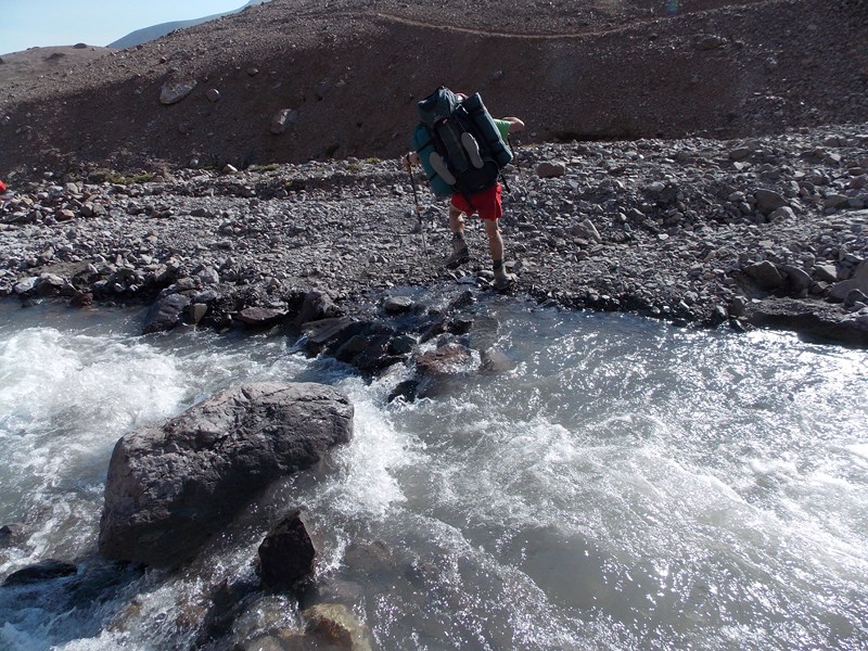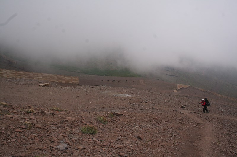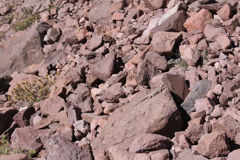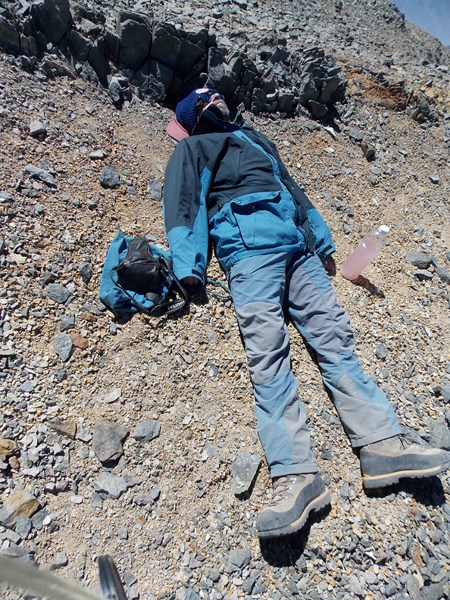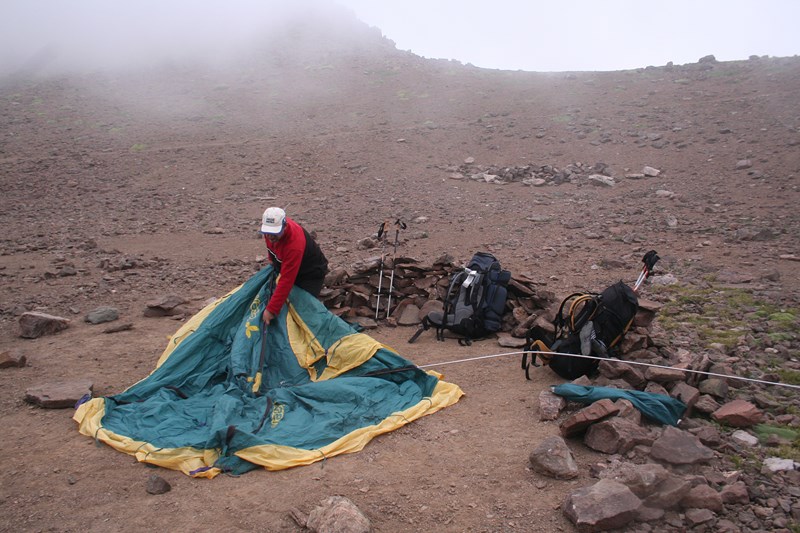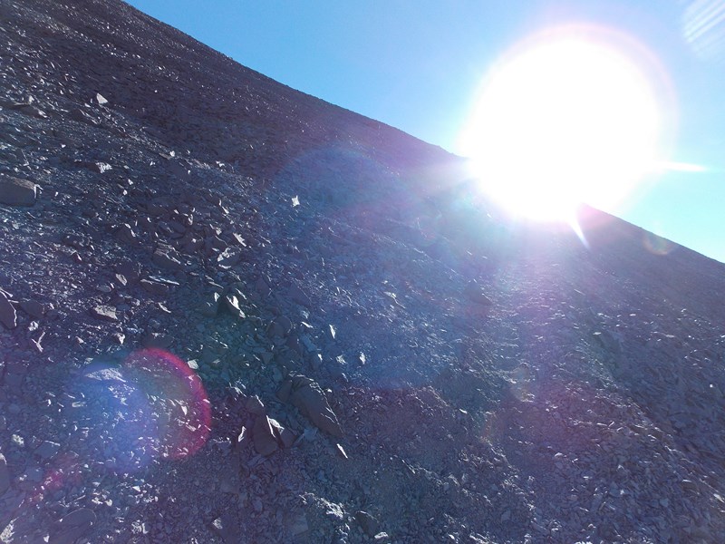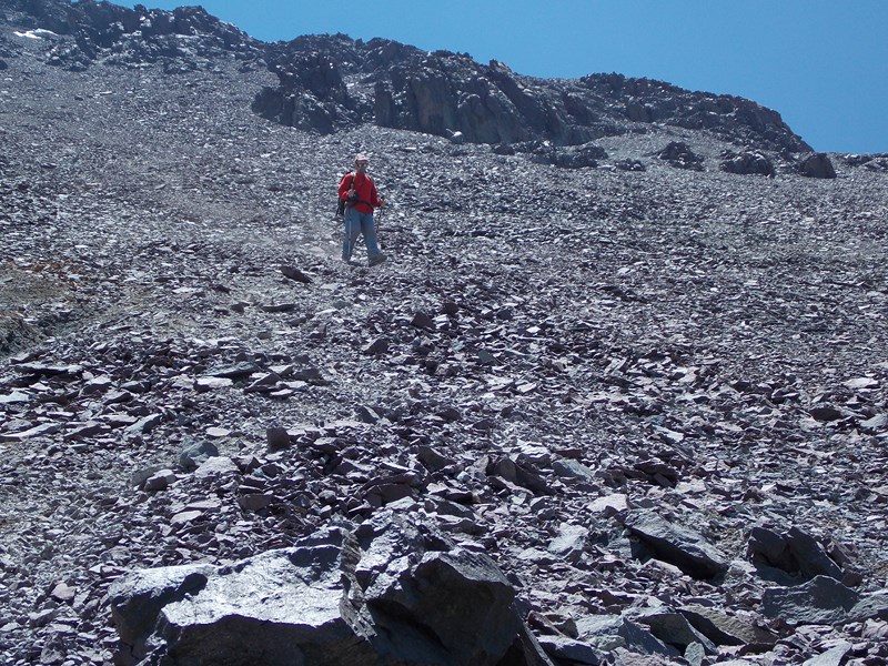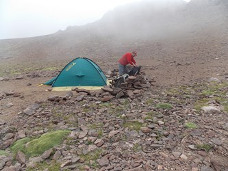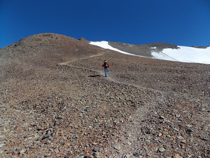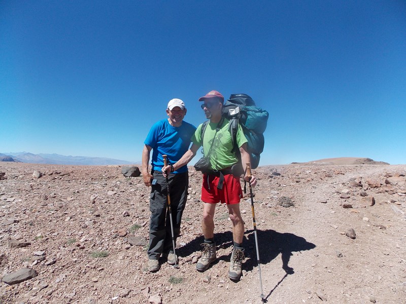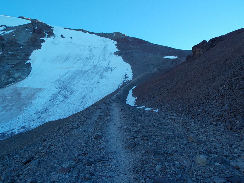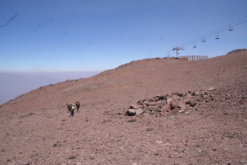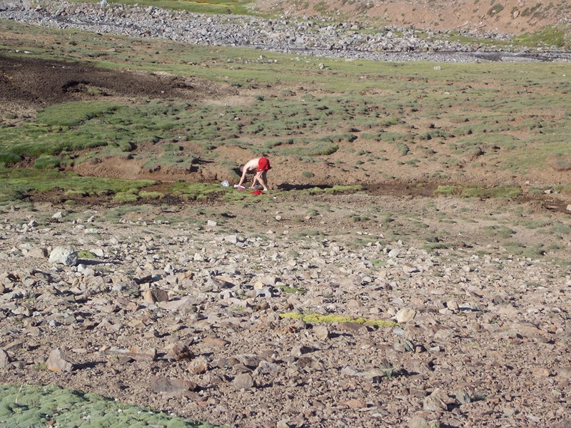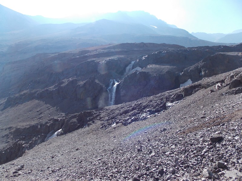 Der Genuss dieser wohl einmaligen Landschaft kam dabei nicht zu kurz, in genau 2 Std. das Lager verbraucht Platt zufrieden und Glücklich erreicht. Wasser einholen noch war es Sauber, schnell standen wir im Interesse, die "neuen" Nachbarn hatten auch recht auf Antwort ihrer Fragen über die Besteigung. Ab in das völlig geöffnete Zelt, es war erbärmlich Heiß aber der Körpers benötigte dringend Ruhe. "Two hour later" packen, wir wollen ein Lager tiefer, besser so hier in der Steinwüste fehlt das Grün das die Sinne erfreut. Beim Verlassen zählen wir noch 10 Zelte, Ja die Chilenen müssen Morgen zur Arbeit. Es sei gesagt, Respekt an all die die von hier aus noch am selben Tag den Weg komplett zurück bis zum Fahrzeug und die Heimreise bewältigen. Im Abstieg begegnen wir noch ein paar Personen und Mulli Treibern, Mitleid aber müssen wir mit einer Chilenin haben die allein Unterwegs war (Am Gipfel hat Sie noch ganz Stolz ein Video mit sich und den Traumbergen gedreht) kurz vor der Fluss Überquerung passieren wir Sie, ihr Rucksack hing auf halb vier. Es hatte den Anschein das die anderen sich ihrer annahmen. Zufrieden und in ein doch guten Verfassung wurde das Zelt genau an der Stelle errichtet an der ein Argentinisches Pärchen im Aufstieg ihr Zelt aufstellte, der wohl schönste Platz, und wir waren hier die Einzigen. In dieser Nacht Träumten wir wohl von einer Etappe im Leben, die so nie erwartet werden konnte. Doch eine unbekannte gab es noch, und die sollte Morgen geklärt werden.