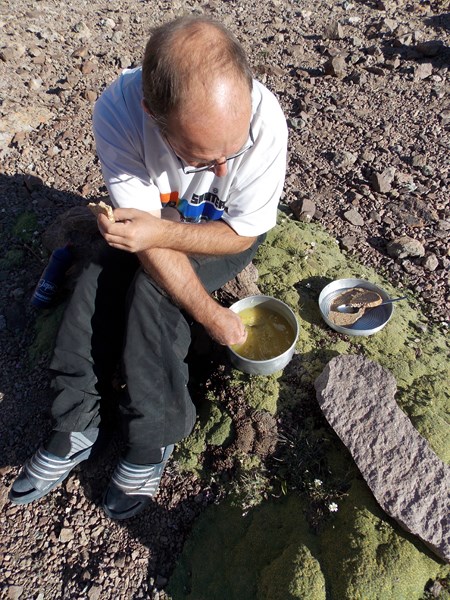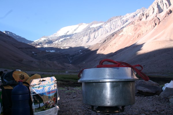 Das Wasser in diesem doch mächtigen Baches war Eiskalt, kein Wunder war es doch noch vor kurzem Eis oder Schnee. Wie aus dem nichts tauchte der Fahrer von vorhin bei uns auf, ob wir nicht die zwei Japaner gesehen hätten? No sorry! im Sauseschritt machte er sich aus dem Staub, ja er war auch Bergsteiger, einer Sektion des Anden Vereins Valparaíso. Da wir nur ca. 200 m vom Zubringer zum Plomo lagen, konnte die Fluktuation auf ca. 4 Km wahrgenommen werden, und dies war zu unserem Erstaunen unglaublich Rege! tatsächlich war er irgendwann im Aufstieg fündig geworden, ja und das schaute gar nicht gut aus, die beiden stützten sich gegenseitig, das Vorwärts kommen nur mühselig, ja sie waren Mauseplatt, ihr Gepäck wurde mit Sicherheit von Maultieren transportiert, die hier immer wieder das Camp passierten. Die beiden benötigten mit hoher Wahrscheinlichkeit das 4 fache an Zeit, und der Rück Weg war noch sehr sehr lang. Obwohl der Plomo mit seinem Schnee und Eispanzer greifbar schien, war er noch zwei Anspruchsvolle Tages Etappen entfernt. Zum Abend gab es ein Super gutes Traveller Lunch "Kartoffeltopf" und eine Nudelsuppe. Flüssigkeit in Form von Geschmacksverstärkten Wasser konnte genügend eingenommen werden. Müdigkeit kehrte ein, auch die Gnadenlose Sonne hatte Gewaltig zugesetzt, zum Glück weht hier stetig Wind, doch mit dem Verschwinden des Roten Planeten wird es empfindlich kalt. Die Frage über die Route konnte wohl etwas geklärt werden, doch war sie eine noch Unbekannte. die uns Gedanken aber keine Sorgen machte.