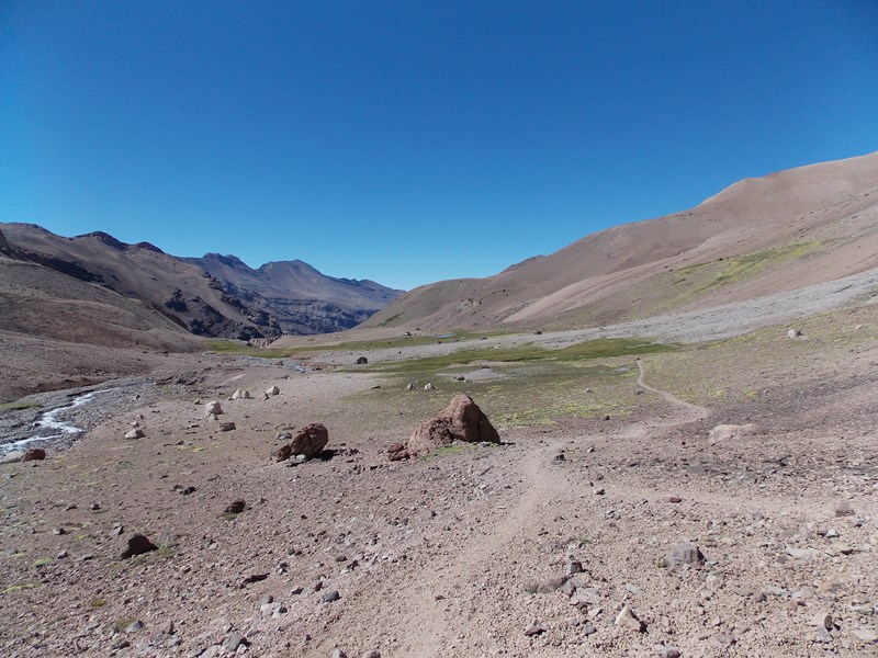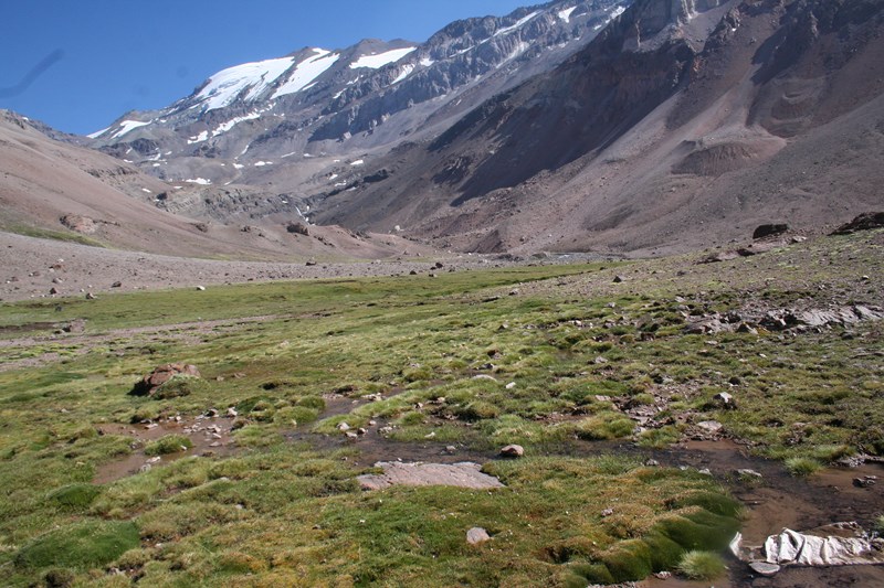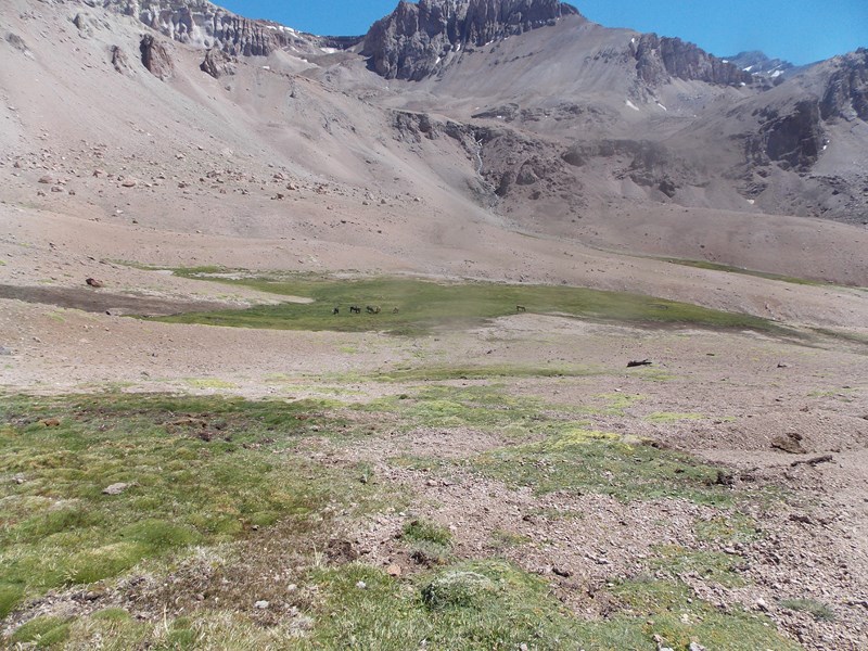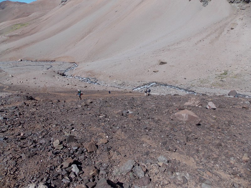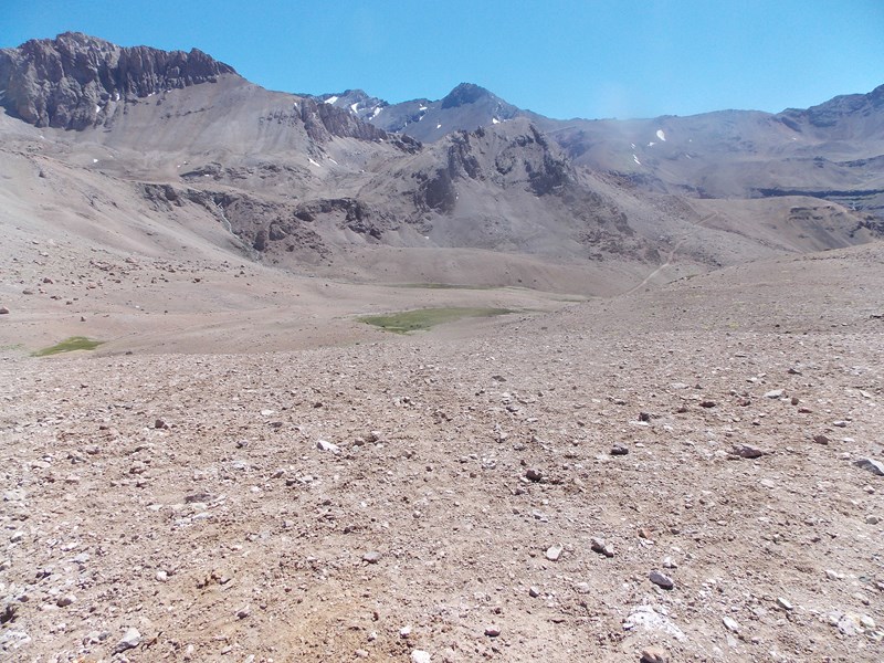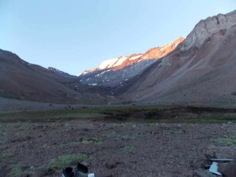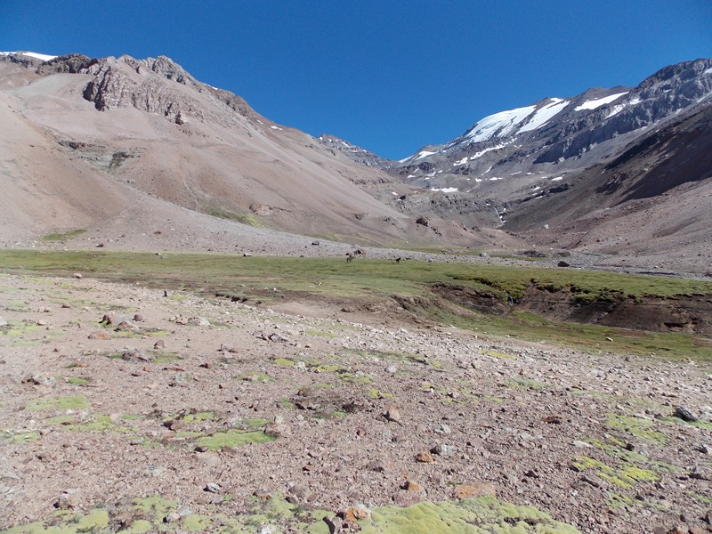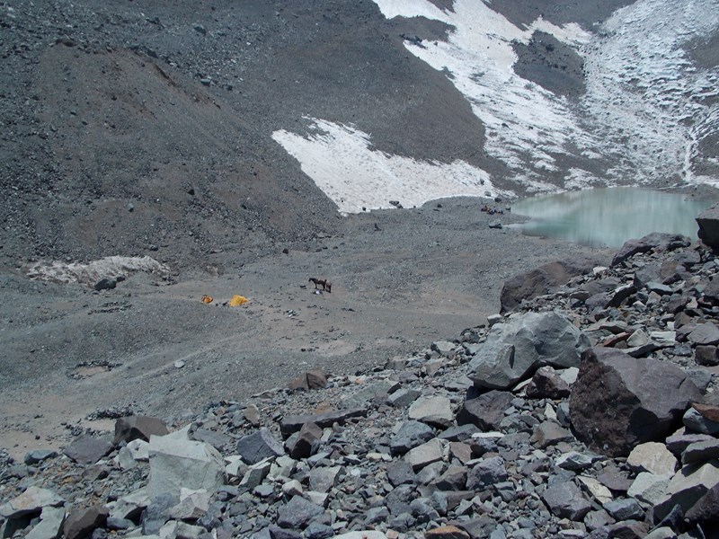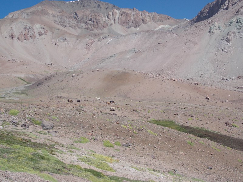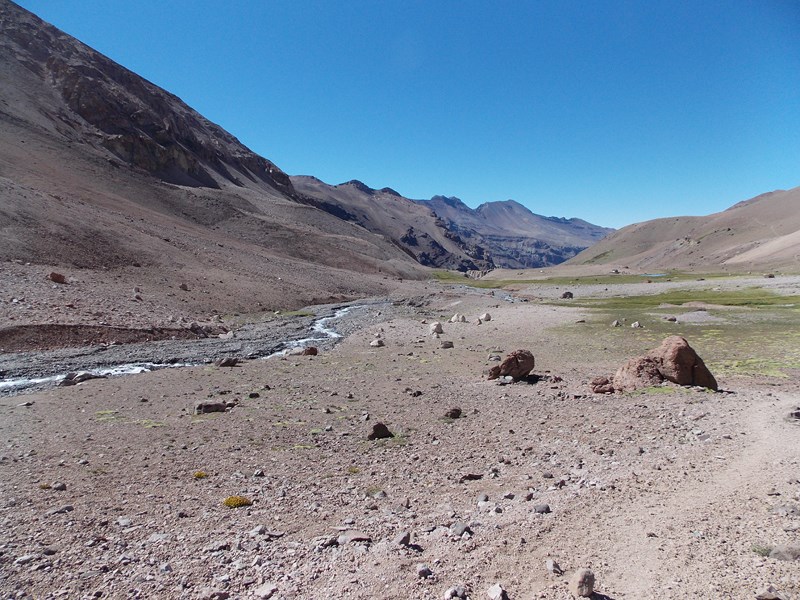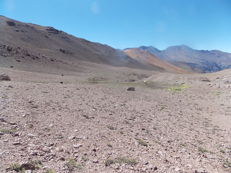 Freitag 3.Januar: Stahlblauer Himmel, doch es war Nass im Zelt eine Trinkwasserflasche war ausgelaufen, bedingt durch die gute Lage diese Camps trocknete die hier früh aufgehende Sonne die Textilien. Punkt 10.00 Uhr, the Show must go on, weislich wissend das zweimal weit abgestiegen werden musste um in das Tal Molina dem Zustieg zum Plomo zu gelangen, war die Stimmung voller Abenteuer und Vorfreuden. Etwas überrascht waren wir als wir plötzlich 5 Jeeps bzw. ein 6 Fahrzeug etwas abseits sahen. Der Fahrer sprach uns wohl an...nachdem er des Englisch etwas mächtig war, kam eine Konversation zustande, seine Sorge galt zwei Japaner die er vor vier Tagen mit dem Ziel Plomo hier ausgesetzt hatte, doch wir begegneten niemand, dabei erfuhren wir das die Straße und der Künstliche See hier vor drei Jahren entstanden ist. Wie aus dem nichts treffen wir im zweiten Abstieg am Bachbett auf eine 10 Köpfige Gruppe wahrscheinlich Chilenen bei einer Vorbereitung zu einer Expedition. (wir sind ihnen wohl mehrmals begegnet) während unserer Anwesend wurde das Lager Täglich etwas höher gelegt, Ps. die Logistik erfolgte mit Tragetieren. Kurz nach Überschreiten des letzten Passes, wurde der Blick frei zu der Grünen Oase dem Camp Piedra Numerada 3345m, nach gut 20 Minuten Abstieg in diesem doch mächtigen Tal, das 2 Camp erreicht, ja wir waren nicht allein, mehrere Zelte standen oder folgten noch.