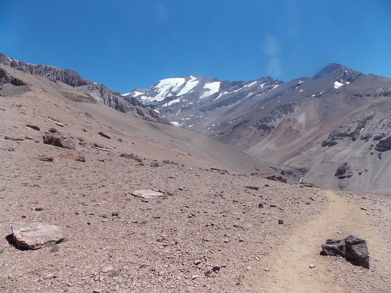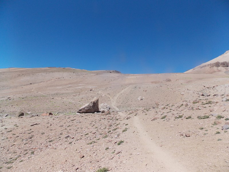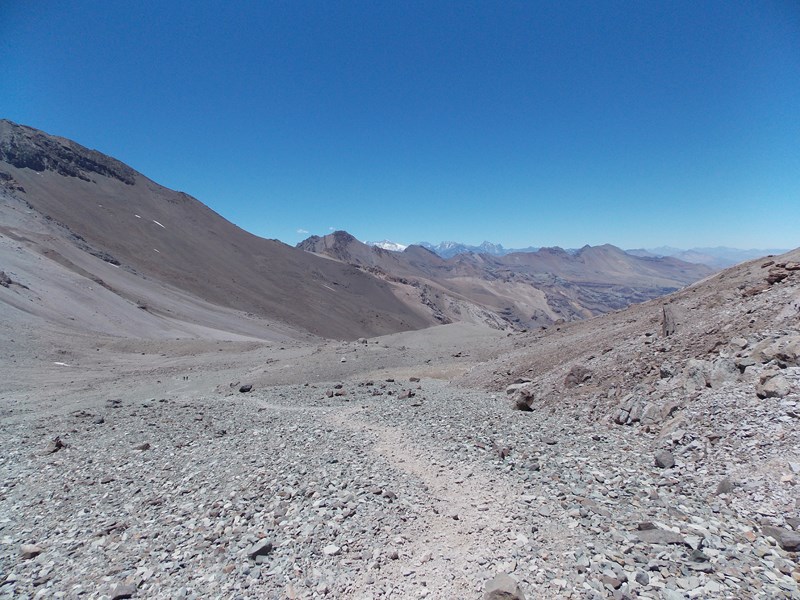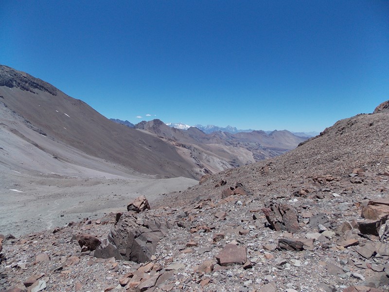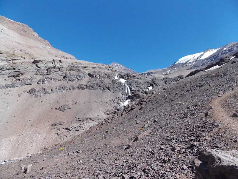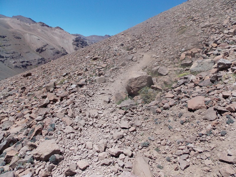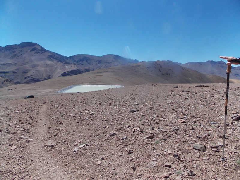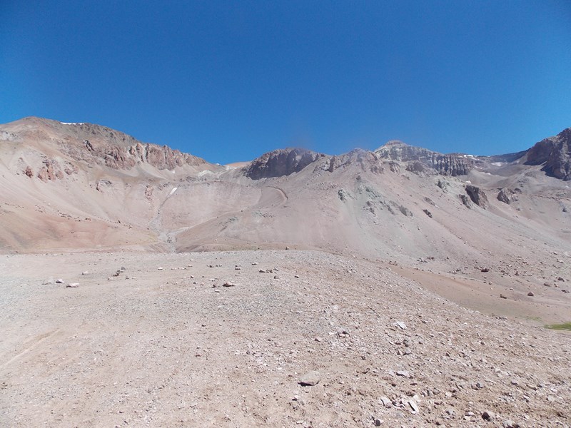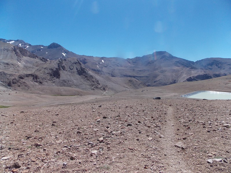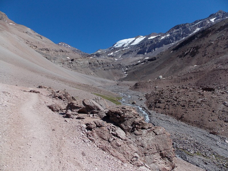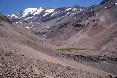 Freitag 3.Januar: Stahlblauer Himmel, doch es war Nass im Zelt eine Trinkwasserflasche war ausgelaufen, bedingt durch die gute Lage diese Camps trocknete die hier früh aufgehende Sonne die Textilien. Punkt 10.00 Uhr, the Show must go on, weislich wissend das zweimal weit abgestiegen werden musste um in das Tal Molina dem Zustieg zum Plomo zu gelangen, war die Stimmung voller Abenteuer und Vorfreuden. Etwas überrascht waren wir als wir plötzlich 5 Jeeps bzw. ein 6 Fahrzeug etwas abseits sahen. Der Fahrer sprach uns wohl an...nachdem er des Englisch etwas mächtig war, kam eine Konversation zustande, seine Sorge galt zwei Japaner die er vor vier Tagen mit dem Ziel Plomo hier ausgesetzt hatte, doch wir begegneten niemand, dabei erfuhren wir das die Straße und der Künstliche See hier vor drei Jahren entstanden ist. Wie aus dem nichts treffen wir im zweiten Abstieg am Bachbett auf eine 10 Köpfige Gruppe wahrscheinlich Chilenen bei einer Vorbereitung zu einer Expedition. (wir sind ihnen wohl mehrmals begegnet) während unserer Anwesend wurde das Lager Täglich etwas höher gelegt, Ps. die Logistik erfolgte mit Tragetieren. Kurz nach Überschreiten des letzten Passes, wurde der Blick frei zu der Grünen Oase dem Camp Piedra Numerada 3345m, nach gut 20 Minuten Abstieg in diesem doch mächtigen Tal, das 2 Camp erreicht, ja wir waren nicht allein, mehrere Zelte standen oder folgten noch.