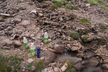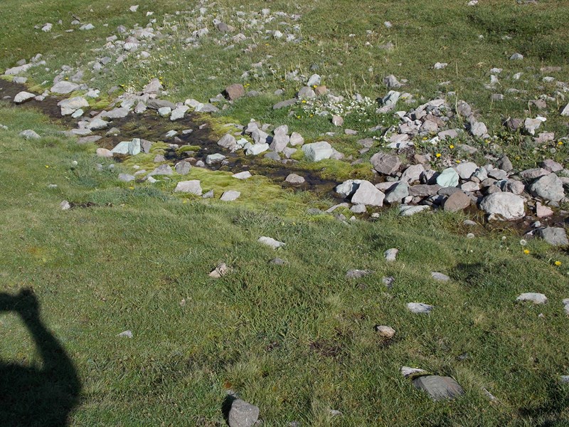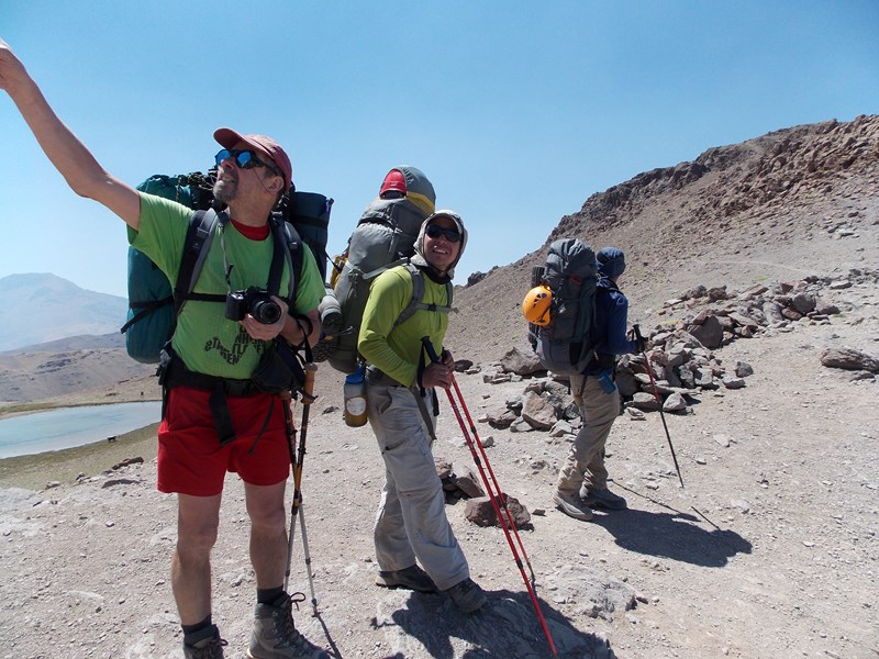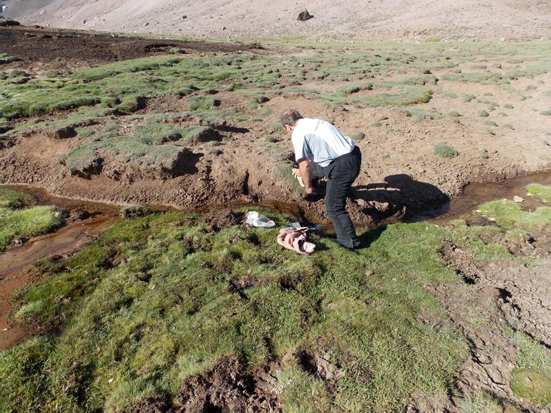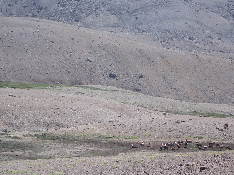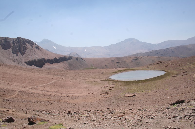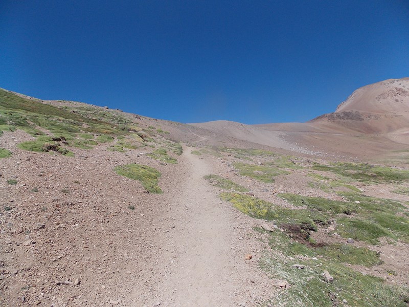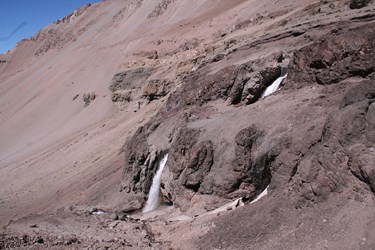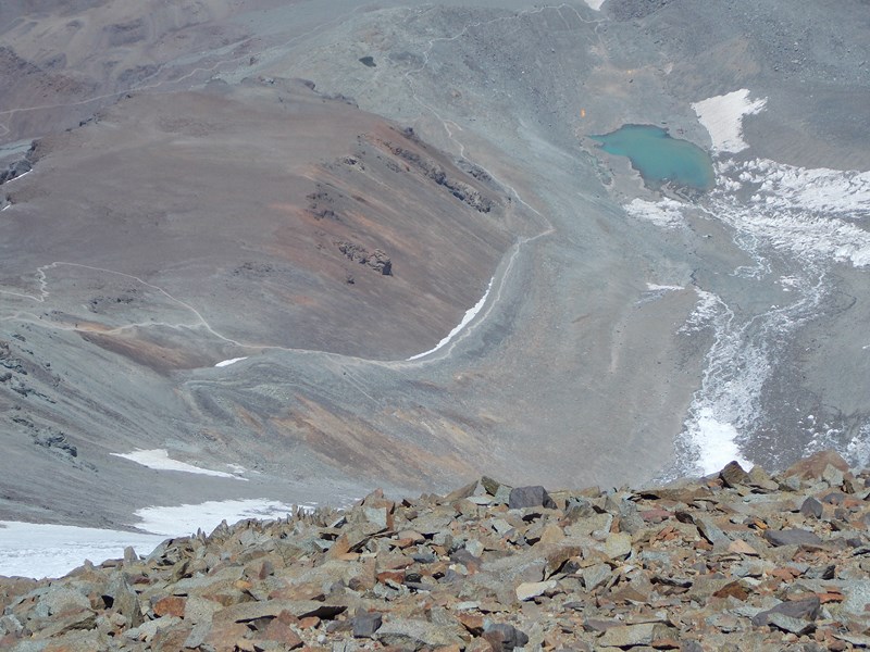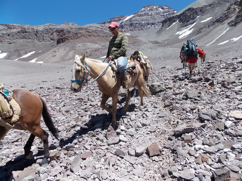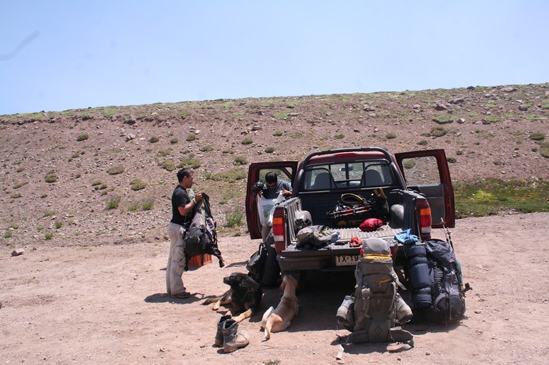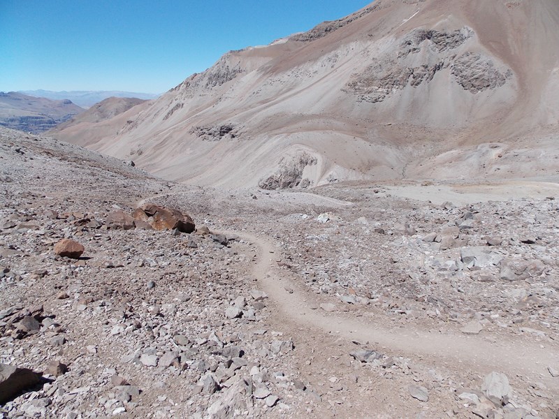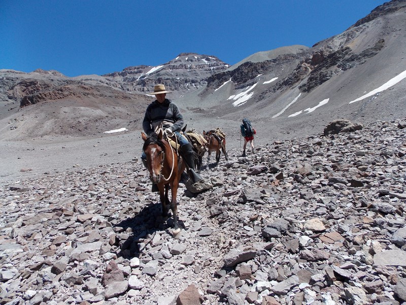 Freitag 3.Januar: Stahlblauer Himmel, doch es war Nass im Zelt eine Trinkwasserflasche war ausgelaufen, bedingt durch die gute Lage diese Camps trocknete die hier früh aufgehende Sonne die Textilien. Punkt 10.00 Uhr, the Show must go on, weislich wissend das zweimal weit abgestiegen werden musste um in das Tal Molina dem Zustieg zum Plomo zu gelangen, war die Stimmung voller Abenteuer und Vorfreuden. Etwas überrascht waren wir als wir plötzlich 5 Jeeps bzw. ein 6 Fahrzeug etwas abseits sahen. Der Fahrer sprach uns wohl an...nachdem er des Englisch etwas mächtig war, kam eine Konversation zustande, seine Sorge galt zwei Japaner die er vor vier Tagen mit dem Ziel Plomo hier ausgesetzt hatte, doch wir begegneten niemand, dabei erfuhren wir das die Straße und der Künstliche See hier vor drei Jahren entstanden ist. Wie aus dem nichts treffen wir im zweiten Abstieg am Bachbett auf eine 10 Köpfige Gruppe wahrscheinlich Chilenen bei einer Vorbereitung zu einer Expedition. (wir sind ihnen wohl mehrmals begegnet) während unserer Anwesend wurde das Lager Täglich etwas höher gelegt, Ps. die Logistik erfolgte mit Tragetieren. Kurz nach Überschreiten des letzten Passes, wurde der Blick frei zu der Grünen Oase dem Camp Piedra Numerada 3345m, nach gut 20 Minuten Abstieg in diesem doch mächtigen Tal, das 2 Camp erreicht, ja wir waren nicht allein, mehrere Zelte standen oder folgten noch.