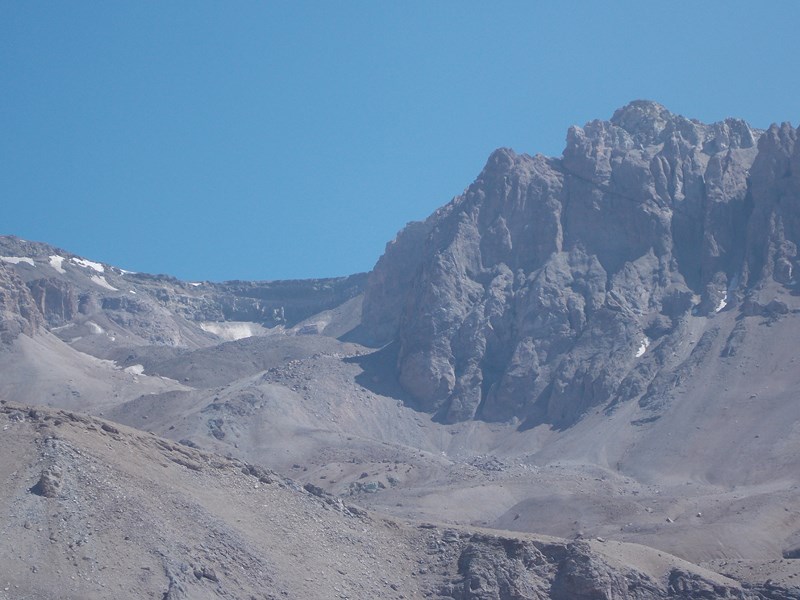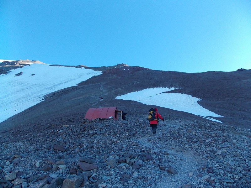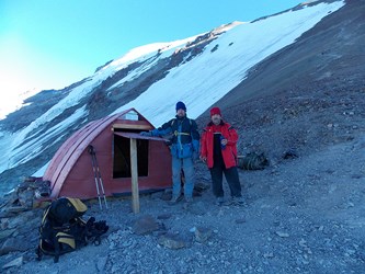Imponierend und Prächtig, diese Eindrücke bewegten uns! trotz der Strapazen wird die Wildheit und Schönheit wahrgenommen. Echt Goil hier sein zu dürfen! Beim Aufbau des Zeltes direkt neben der kleinen Dreieck Holzhütte (Platz am Boden für 3 Personen) leichte Schwindelgefühle, die Hohe lässt sich nicht leugnen, nebenbei einholen des Lebenselixiers in einem noch Glasklaren Bach.Es folgt ein kleines Vesper, Brot Tomate Käse und Wurst, die Hauptbeschäftigung aber ist die Bewegung am Berg und Camp zu beobachten, klar gilt es doch die Route zu erahnen und erfahren, und wie es der Zufall so will kehrt eine Jüngere Chilenische Gruppe Glücklich und Erfolgreich vom Plomo zurück, ihre Zelte sind direkt neben uns platziert, Neugierig wie man sein muss am Berg, beginnt mit einem Member eine sehr Informative Unterhaltung. Start war um 4.30 Uhr, also 12.Std. Inklusive einer 1 Std. Pause am Top, davon 4 im Abstieg, die Route konnte er gut beschreiben, wobei es von hier unten nicht so aussah das diese leicht sei, soll uns nur recht sein, ah ja eine Vereiste Querung gilt es zu meistern, wir unterhielten uns noch ein paar Minuten, wobei in die Berge und das Bergsteigen in Europa interessierte. Wir begeistern uns an der Sicht „unseres“ Marmoleyo mit seiner Imponierenden Nordwand, direkt dahinter der nicht Unbekannte Vulkan San Jose. Nebenbei stellen wir fest das der Bach stark angeschwollen war und dadurch sehr Trübe, dumm wenn die Töpfe nicht rechtzeitig gefühlt werden, auch so etwas sollte ein erfahrener Bergsteiger bedenken. Mittlerer weile stehen 30 Zelte auf dem weiten aber nicht ebenen Camp. zum Abendessen obligatorisch Nudelsuppe danach ein Travellerlunch von "2010" Spagetti Carbonara, weniger schmackhaft. 21.00 Uhr Feierabend, längst war die Sonne hinter der Bergkuppe verschwunden, das Wasser wurde wieder klarer. Der Wecker wurde auf 5.30 Uhr gestellt, Fritz war der Meinung 6.00 Uhr, Start um 12 am Gipfel, eine Std. Anpassung.