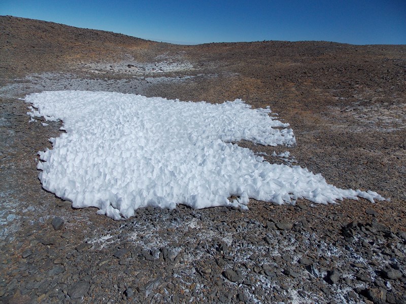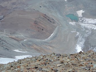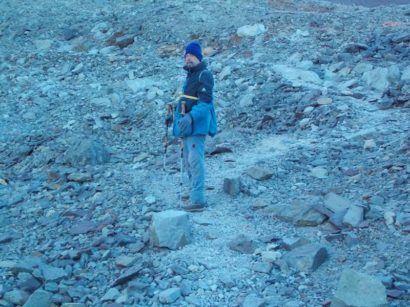 Sonntag 5.Januar: Jens ich glaube wir sollten aufstehen, es Dämmert. Sein erster Blick gilt dem Handy, ja das Teil hatte versagt...oder doch der Anwender? es war 5.45 Uhr, Schnell wurde der Teleskopstock eingefahren und in das Vorzelt gestellt (Feuerschutz wegen des Gas Kochers) zum Essen gab es die Süßen und guten Chilenischen Kekse. 6.15 Uhr, Jens hatte seinen Rucksack gepackt, Falter in Typischer Gipfel Manier denn Leinen Beutel mittels Bandschlinge an den Körper gebunden, die wichtigsten Gegenstände in der Jacke. Weit und breit niemand auszumachen, ja die Stimmen die in der Nacht wahrgenommen wurden, war Vergangenheit, und diese Vergangenheit holten wir in einer absoluten Souveränen Manier im Laufe der nächsten 4 Stunden und 45 Minuten wieder ein. Temperatur so 5 Grad Minus. Der erste Aufschwung eine harte Nuss, es folgt ein Augenschmaus, der Weg führt direkt vorbei an einem Taleinschnitt, hier ist ein Wunderschönes Camp mit einem Smaragd Grünen Gebirgssee in dem der Gletscher des Plomo grenzt. Es folgt ein gleichmäßiger ansteigender Grat in Richtung des Zustiegst (Südlich) die Temperatur ist in der Bewegung noch Angenehm, doch der Stetige Fallwind sollte nicht sein. Die gut ausgetretene Route dreht sich zum Berg, es wird wieder steiler, Jens hat so seine Müh (in Wirklichkeit war ich zu schnell) Punkt 8.00 Uhr, stehen wir vor einem kleinen Biwak auf 4621 m, zwei Chilenen die sich diese Unterkunft als Tourenziel gewählt hatten, hielten uns zwei in Bild fest (da mein Akku schwach war benutzte ich die Kiste von Jens) 600 Hm. in 1.Std. und 45 Minuten Ergo 340 Hm. in 1 Std. Wahnsinn!! Trinkpause, Wasser mit Multivitamin Tabletten.