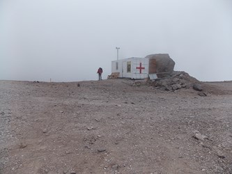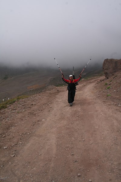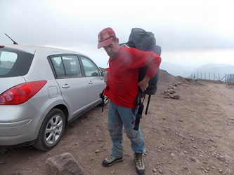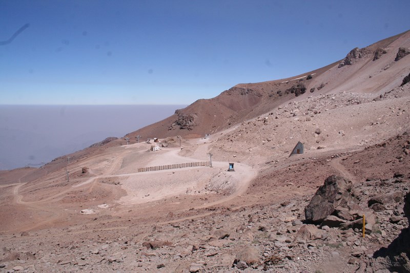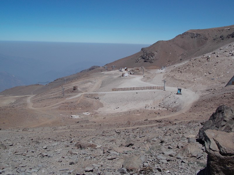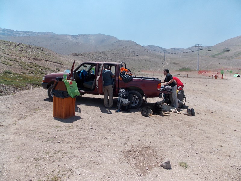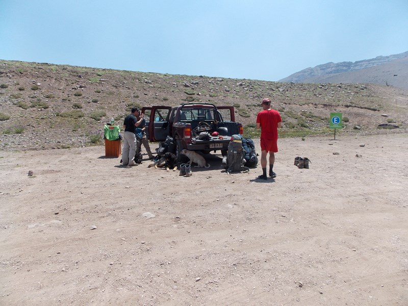 verdammt was war passiert? Erste Recherchen ergaben keine genau Antwort, sicher war, er ist im Hotel Londres gewesen. Bis heute kann der genaue Sachverhalt nicht geklärt werden. Im dritten Anlauf ist es Fritz gelungen an der rechten Straßenseite anzuhalten, es war 13.30 Uhr, nach dem der Sachverhalt erzählt war, war Fritz der Meinung das wir die beiden Aufenthaltsorte ansteuern, dabei kam es noch zu einem kleinen Unfall, als ein einparkendes Auto unser Vehikel übersah, oh mein Gott! Die Recherche ergab keine Neuigkeiten. Es musste ein neuer Schlafsack her. Der Profi war ja am Steuer, und wie es der Zufall so wollte lag der "Mall Sport" ein Sport oder Outdoor Center direkt am Weg zum Ski Resort "La Perva" und was für ein Geschäfts Center, da blieb uns Europäern die Spucke weck! Claro Fritz hatte gleich den richtigen Riecher, dieser Schlafsack sei gut! zu allem Glück fehlte die Hülle dazu, so gab es obendrauf kostenlos einen Komprimiersack!! und das für "nur" 100 Euro. Je näher wir unserem Ziel kamen, desto trüber wurde es, ja in den Bergen herrschte kein gutes Wetter das war schon am Morgen ersichtlich. er quälte den PKW die letzten 3 Km über die Steinige Piste bis auf fast 3000 m, nachdem der Motor abgestellt war, machte sich das Kühlwasser etwas Luft! Oh weh! No problemo! sagte Fritz. So da standen wir vor ein nicht ganz unbekannten. 17.45 Uhr, Mission Plomo eröffnet, erstmal die Kleidung gegen Warmes tauschen, ja es war empfindlich kalt geworden, nachdem wir 40.000 Peso bezahlten, trennten sich die Wege.