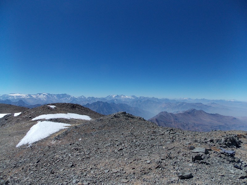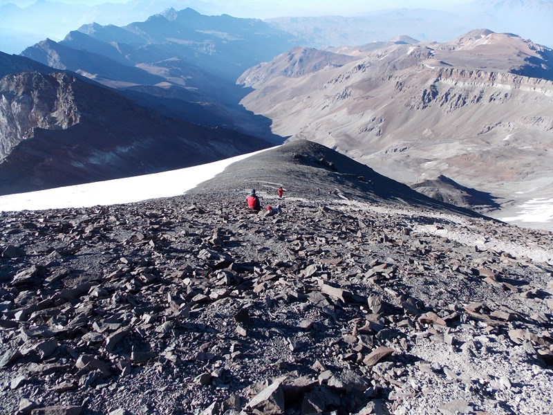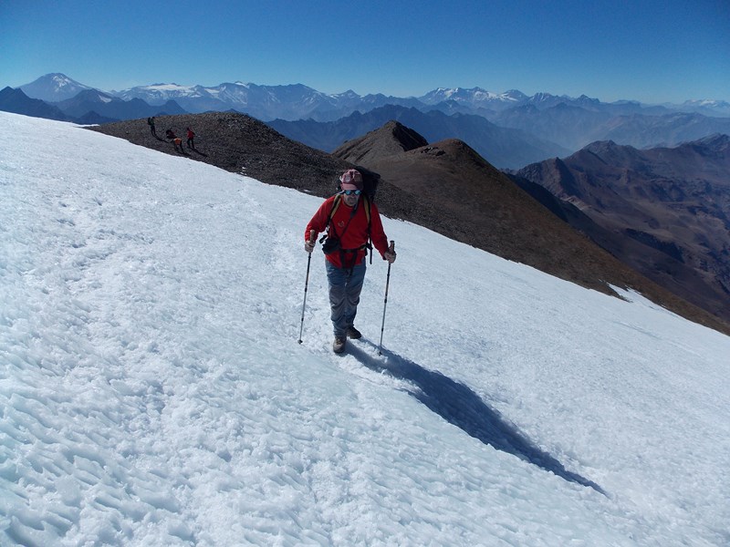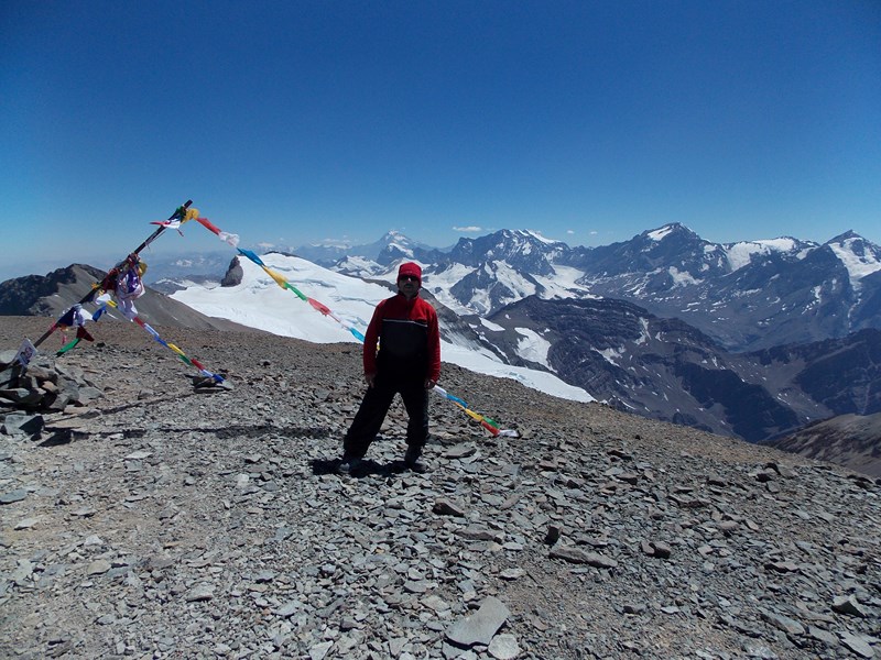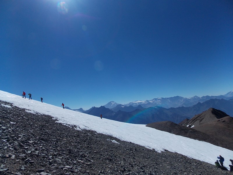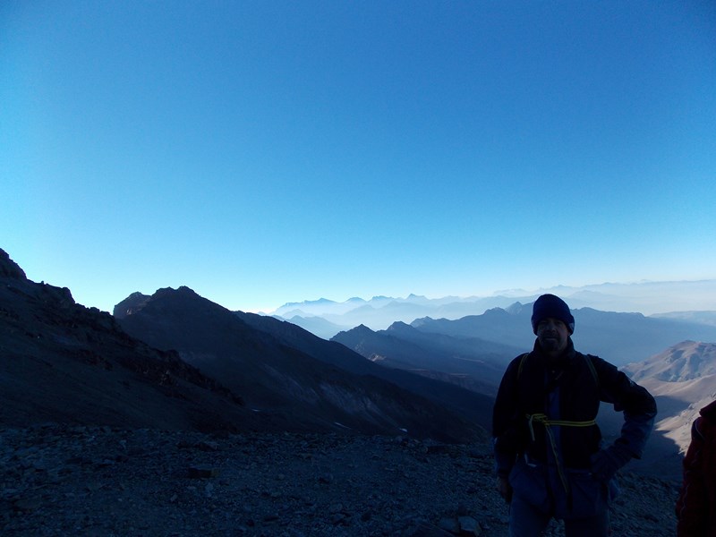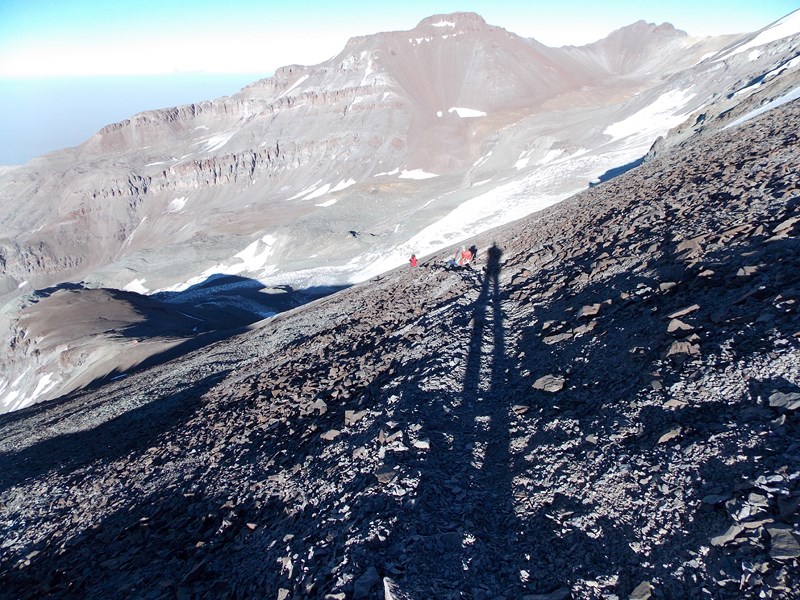 . Nach der Erholung geht es an einer breiten Flanke nach Oben, danach wechselt die Richtung gen Süden, eigentlich weck vom Ziel, der Grund die komplette Wand ist bekanntlich Vergletschert, in diesem Part kreuzen wir direkt in die aufgehende Sonne, der Blick ist absolut auf den Boden gerichtet, in dieser Phase überholen wir die ersten, zwei haben schon aufgegeben. Beim Erreichen des Grates überrascht uns eine Erste Sicht auf die umliegenden Berge, das es dir schier die Stimme verschlägt, ein bisschen wurde versprochen, aber das übertraf alle Erwartungen, ja mit jedem Meter am dann doch etwas ausgesetztem und steilen Grat glich die Sonne die fallenden Temperatur in etwa aus. Mittlerer weile aber waren die Händen Kalt, ein sehr ungutes und schmerzhaftes Gefühl (die besseren Handschuhe wollten noch nicht). Rechts unter uns ein kleiner Schneebedeckter Gletscher, die Route wechselt plötzlich am Grat in die Nordwand, die gestern noch als wie erwähnt schwierig aussah, es war zwar nicht einfach aber technisch auch für Anfänger machbar, auch hier wieder unterhalb Schnee und Eis, alsbald wird die Wand nach Osten verlassen, man steht an einem angenehm breiten Rücken auf knapp 5200m, der Gipfel noch nicht in Sicht aber erahnen lässt er sich, wer hier steht den sollte die Motivation zum Ziel animieren. Nach 100 Meter ist die wohl heikelste Stelle erreicht, ein Schneefeld (oft auch Vereist) das komplett vom Gipfelaufbau zieht, gilt es zu queren. ein erster Schritt...Perfekt für uns Westalpen Profis "reine Spielerei" das Anlegen der Steigeisen kostet viel Zeit (nur 100 Meter weiter wieder ablegen), hier passieren wir einige Südamerikaner (es hatte denn Anschein das unter den Bergsteiger keinen Europäer waren). Jetzt war ich nicht mehr zu bremsen, der Gipfelaufbau wurde zuerst Nördlich gequert, danach Steil in schmalen Serpentinen Östlich, hier folgten einige Überhol Vorgänge einige ließen nicht locker, auch Jens war prächtig drauf, der Gipfel setzte Enorme Motivation und Kräfte frei. 10.53 Uhr, am ersten wenn auch nur "kleinen" Ziels eines Traumurlaubs! das steht jetzt schon fest! angekommen, Jens gesellt sich alsbald dazu. Das Bild was sich von hier aus bietet darf als Sensationell bezeichnet werden, der Plomo liegt inmitten all der Berge in der Metropolitan Region, die wir hier bestiegen hatten! Denke da an Bodo Christian Tommy und Wooley, Ja Freunde wieder ein Meilenstein im Leben eines verrückten Bergsteigers. Aconcaqua, Junkal, Cerro Plomo, Tupungato, Trono, Piuquenes und der südlichste 6000er der Welt, der Marmoleyo, daneben viele 4000 und 5000er, auch das Ziel der Expedition, in 11 Tagen war deutlich auszumachen. Neben Gipfelfotos versuchten wir im Windschatten den Aufenthalt so lange wie möglich zu gestalten, der Kalte Wind war nicht gut Freund mit all den Gipfelstürmern, es war ein kommen und gehen lauter glücklicher Menschen. 12.15 Uhr, der Abstieg stand an, und es wurde ein Schaulaufen Europäischer Alpinisten, die den Umgang mit Schnee Eis und Schotter aus dem FF beherrschen.