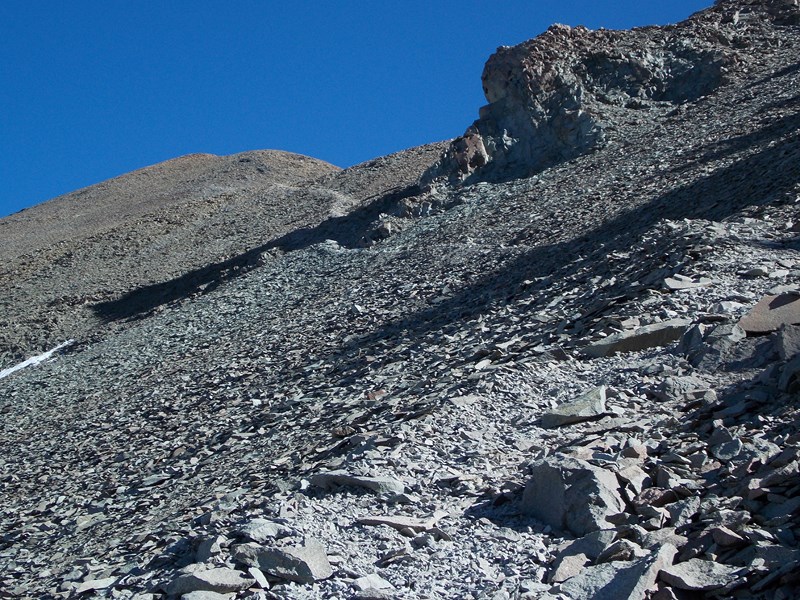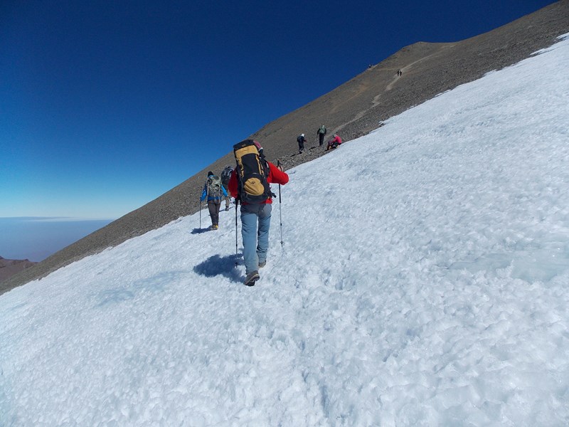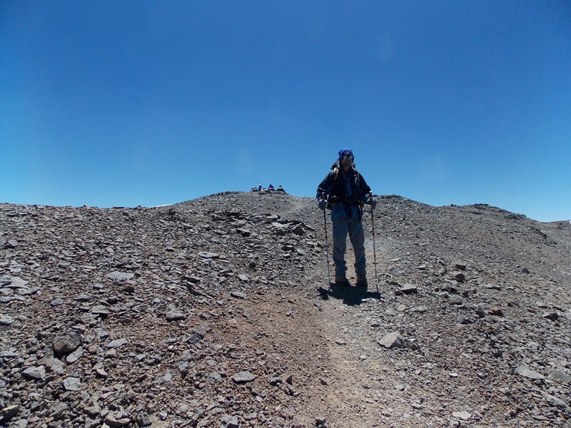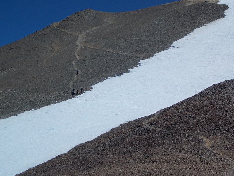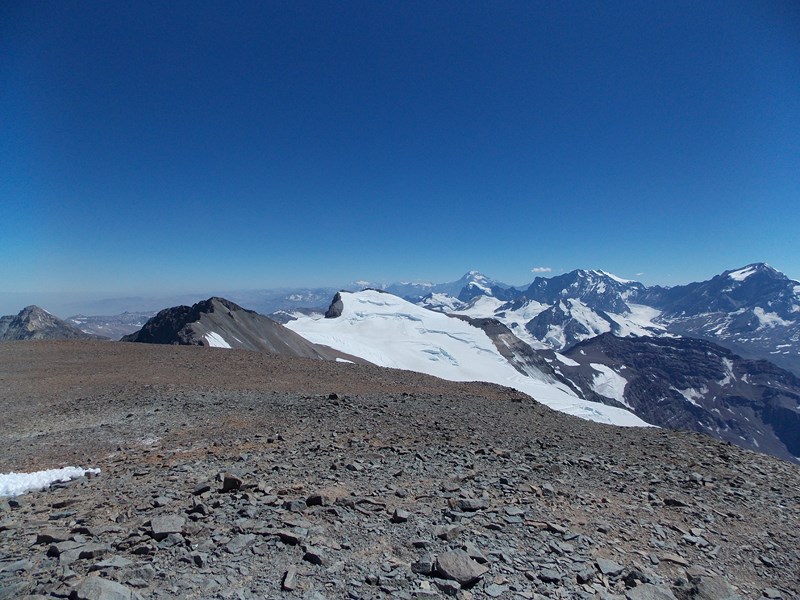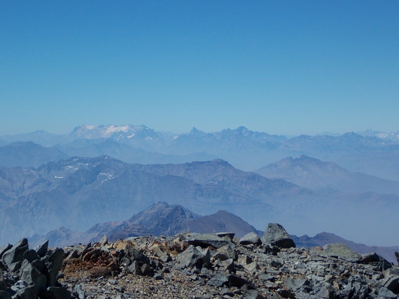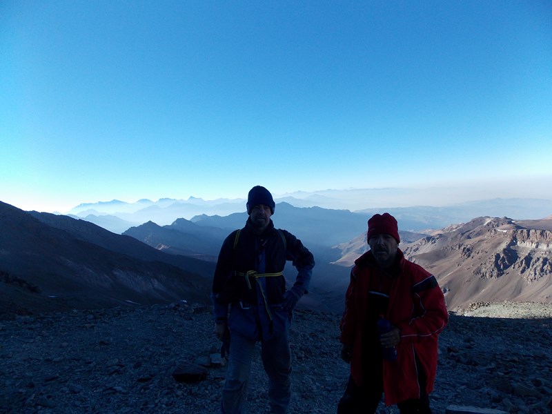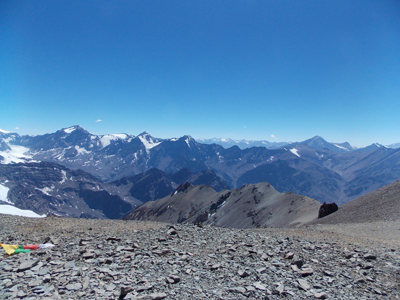 . Nach der Erholung geht es an einer breiten Flanke nach Oben, danach wechselt die Richtung gen Süden, eigentlich weck vom Ziel, der Grund die komplette Wand ist bekanntlich Vergletschert, in diesem Part kreuzen wir direkt in die aufgehende Sonne, der Blick ist absolut auf den Boden gerichtet, in dieser Phase überholen wir die ersten, zwei haben schon aufgegeben. Beim Erreichen des Grates überrascht uns eine Erste Sicht auf die umliegenden Berge, das es dir schier die Stimme verschlägt, ein bisschen wurde versprochen, aber das übertraf alle Erwartungen, ja mit jedem Meter am dann doch etwas ausgesetztem und steilen Grat glich die Sonne die fallenden Temperatur in etwa aus. Mittlerer weile aber waren die Händen Kalt, ein sehr ungutes und schmerzhaftes Gefühl (die besseren Handschuhe wollten noch nicht). Rechts unter uns ein kleiner Schneebedeckter Gletscher, die Route wechselt plötzlich am Grat in die Nordwand, die gestern noch als wie erwähnt schwierig aussah, es war zwar nicht einfach aber technisch auch für Anfänger machbar, auch hier wieder unterhalb Schnee und Eis, alsbald wird die Wand nach Osten verlassen, man steht an einem angenehm breiten Rücken auf knapp 5200m, der Gipfel noch nicht in Sicht aber erahnen lässt er sich, wer hier steht den sollte die Motivation zum Ziel animieren. Nach 100 Meter ist die wohl heikelste Stelle erreicht, ein Schneefeld (oft auch Vereist) das komplett vom Gipfelaufbau zieht, gilt es zu queren. ein erster Schritt...Perfekt für uns Westalpen Profis "reine Spielerei" das Anlegen der Steigeisen kostet viel Zeit (nur 100 Meter weiter wieder ablegen), hier passieren wir einige Südamerikaner (es hatte denn Anschein das unter den Bergsteiger keinen Europäer waren). Jetzt war ich nicht mehr zu bremsen, der Gipfelaufbau wurde zuerst Nördlich gequert, danach Steil in schmalen Serpentinen Östlich, hier folgten einige Überhol Vorgänge einige ließen nicht locker, auch Jens war prächtig drauf, der Gipfel setzte Enorme Motivation und Kräfte frei. 10.53 Uhr, am ersten wenn auch nur "kleinen" Ziels eines Traumurlaubs! das steht jetzt schon fest! angekommen, Jens gesellt sich alsbald dazu. Das Bild was sich von hier aus bietet darf als Sensationell bezeichnet werden, der Plomo liegt inmitten all der Berge in der Metropolitan Region, die wir hier bestiegen hatten! Denke da an Bodo Christian Tommy und Wooley, Ja Freunde wieder ein Meilenstein im Leben eines verrückten Bergsteigers. Aconcaqua, Junkal, Cerro Plomo, Tupungato, Trono, Piuquenes und der südlichste 6000er der Welt, der Marmoleyo, daneben viele 4000 und 5000er, auch das Ziel der Expedition, in 11 Tagen war deutlich auszumachen. Neben Gipfelfotos versuchten wir im Windschatten den Aufenthalt so lange wie möglich zu gestalten, der Kalte Wind war nicht gut Freund mit all den Gipfelstürmern, es war ein kommen und gehen lauter glücklicher Menschen. 12.15 Uhr, der Abstieg stand an, und es wurde ein Schaulaufen Europäischer Alpinisten, die den Umgang mit Schnee Eis und Schotter aus dem FF beherrschen.